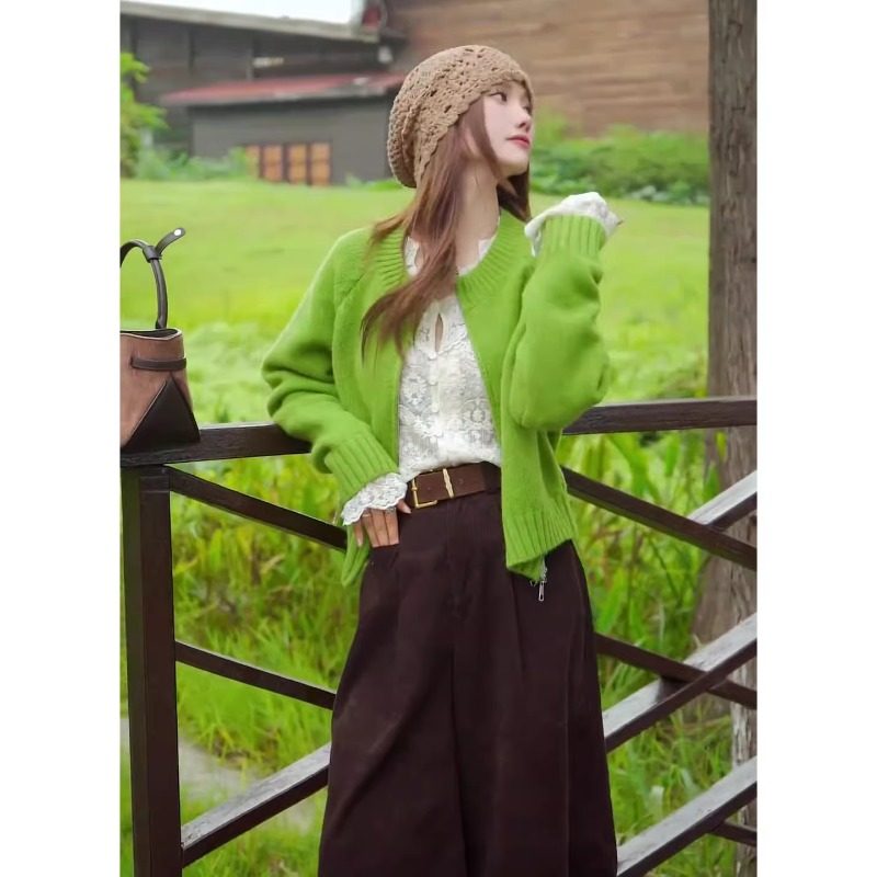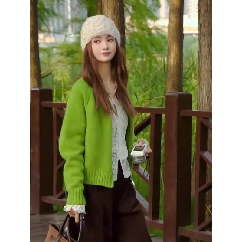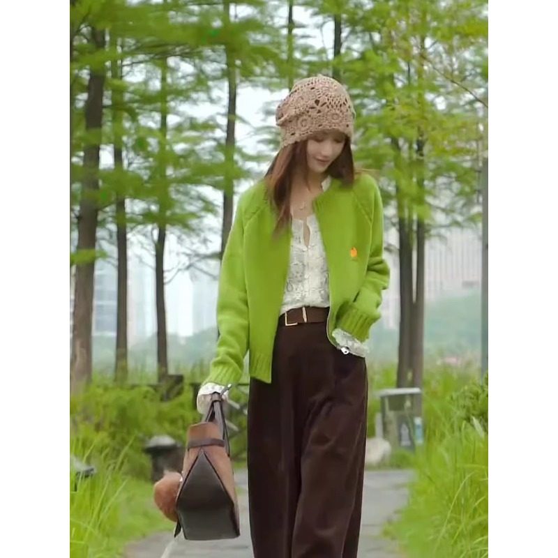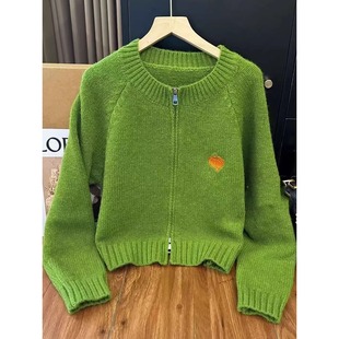 新款 秋冬季 软糯显瘦毛衣外套上衣 女款 小香风绿色圆领拉链针织开衫
