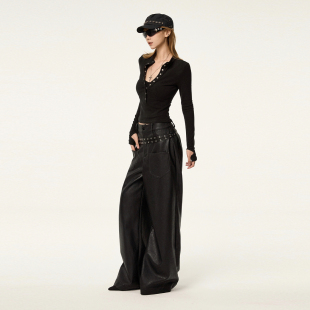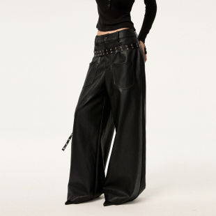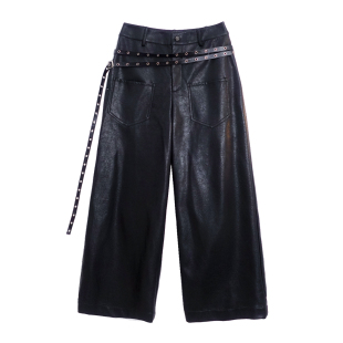 中低腰百搭阔腿PU皮裤 设计感双腰带弯刀裤 女 STUDIO气场全开 VCR