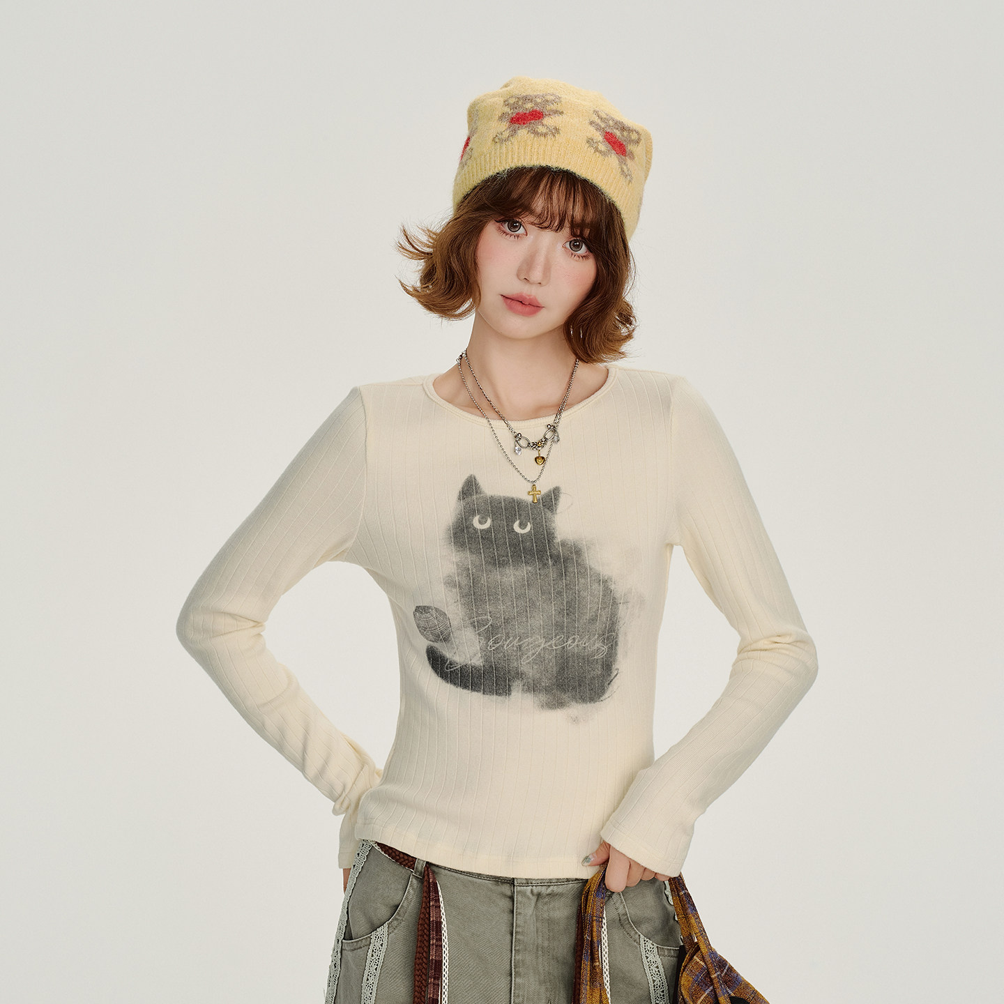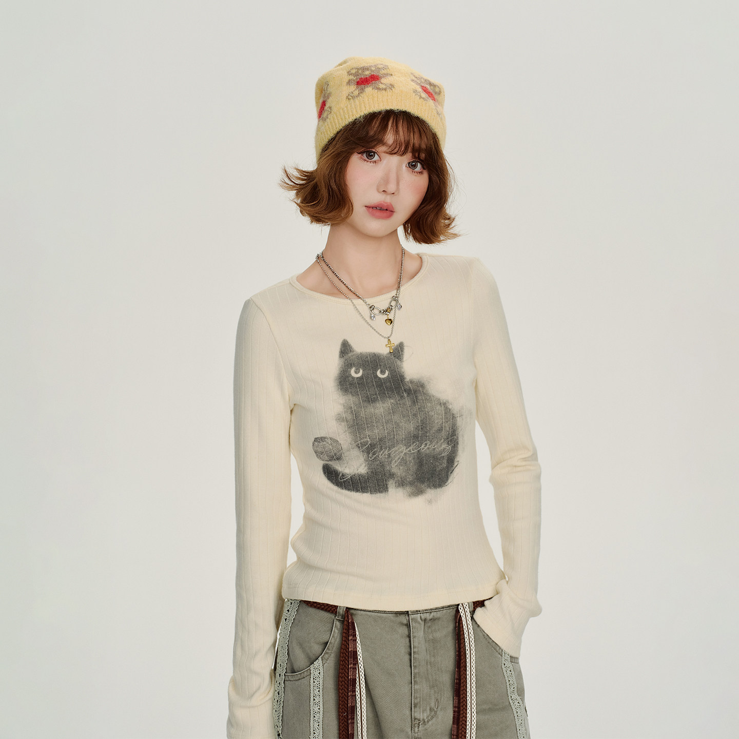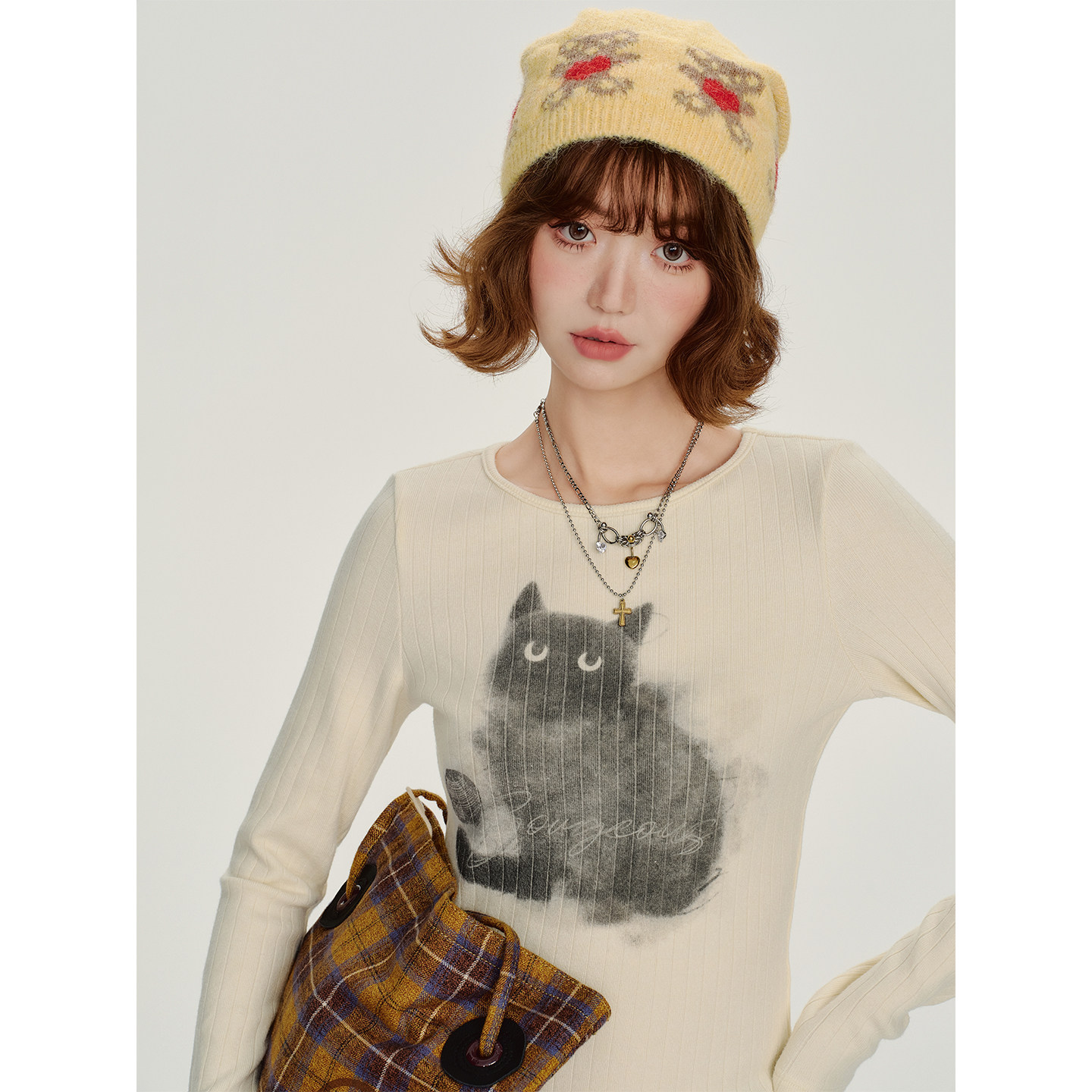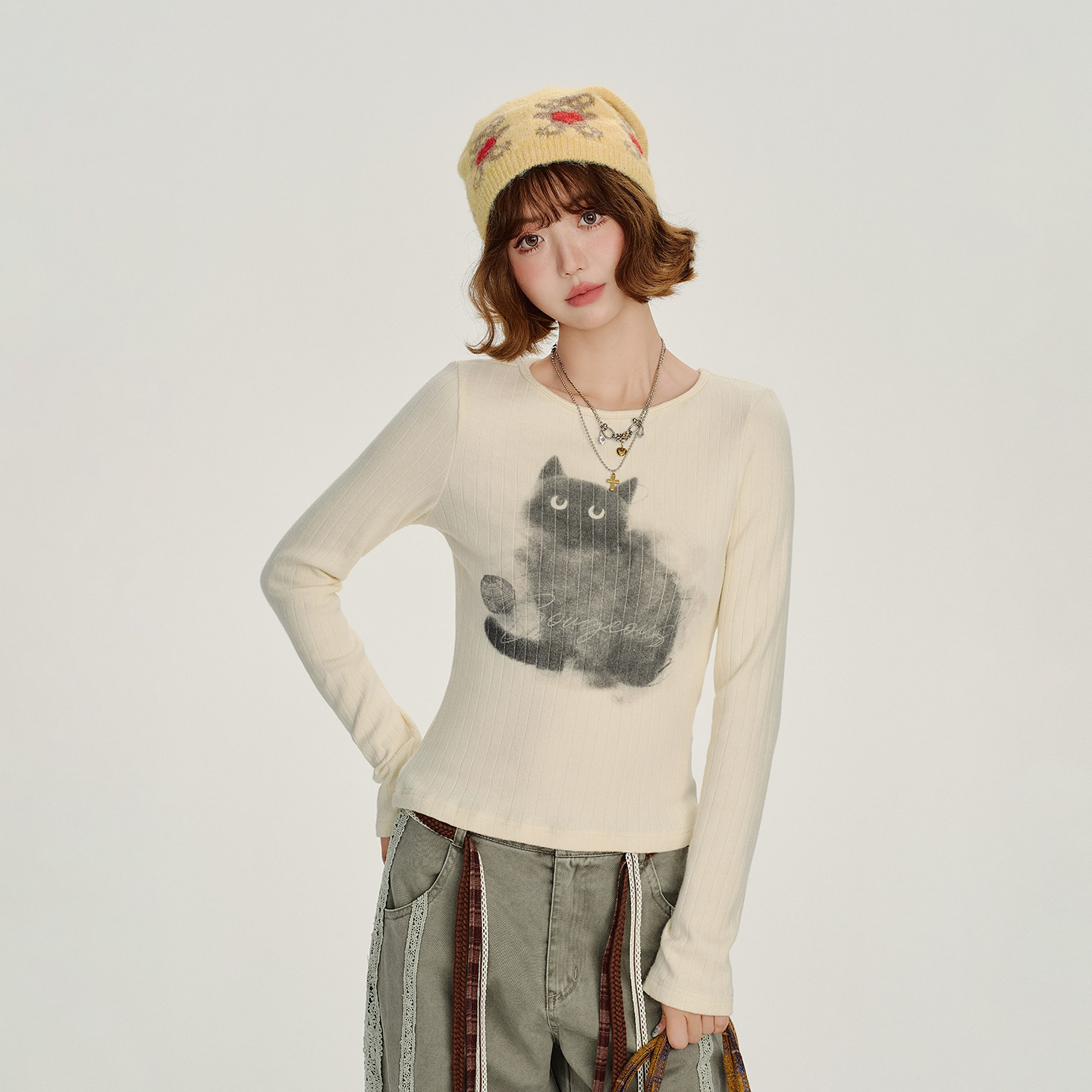 修身 t恤女秋新款 打底内搭上衣 复古印花加厚圆领长袖 Girlyhalo美式