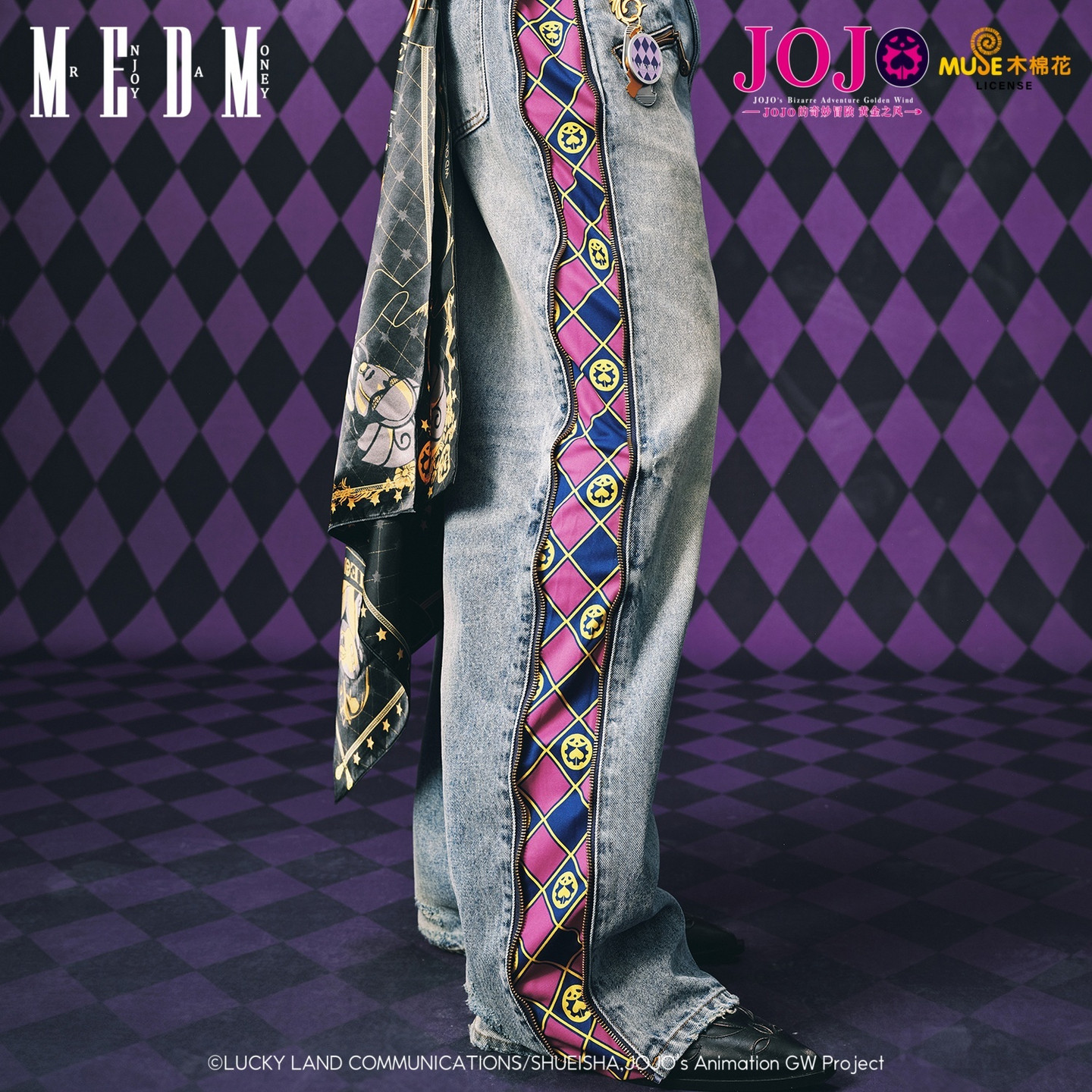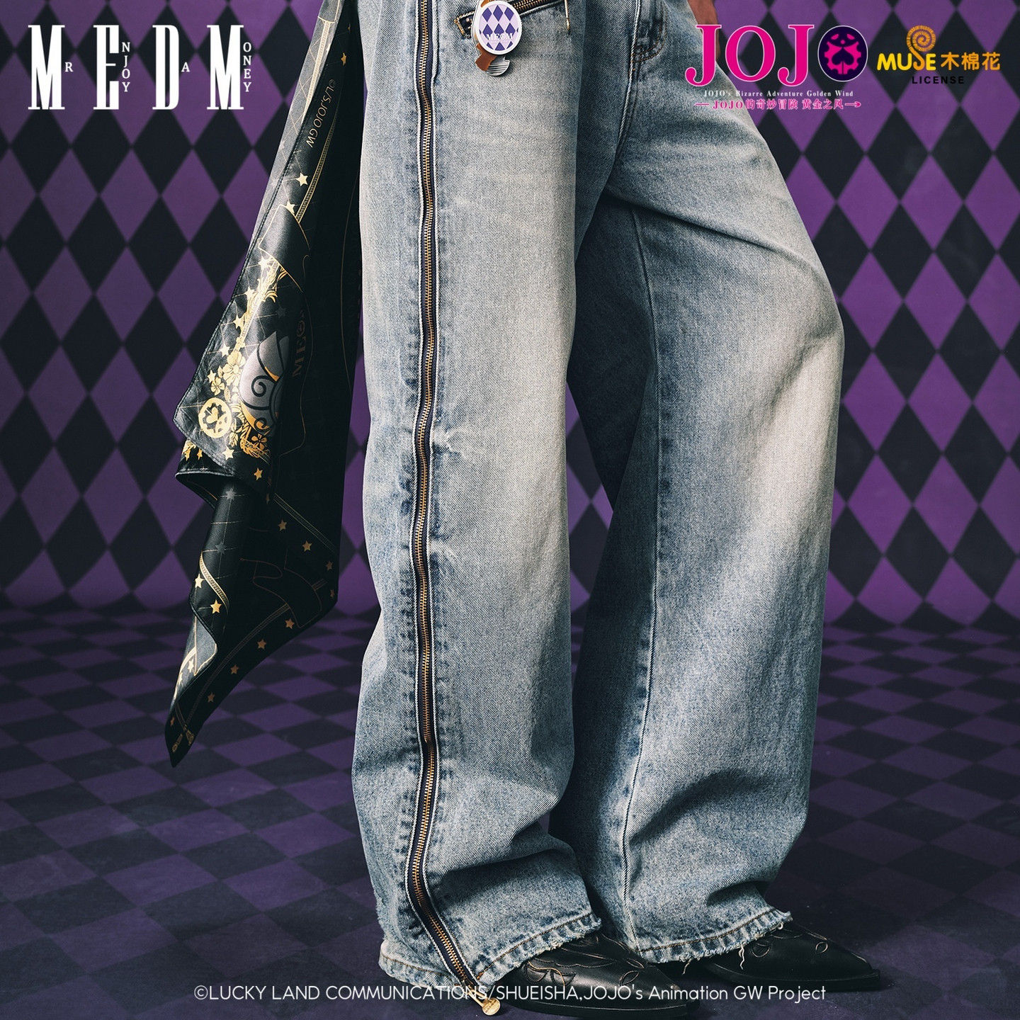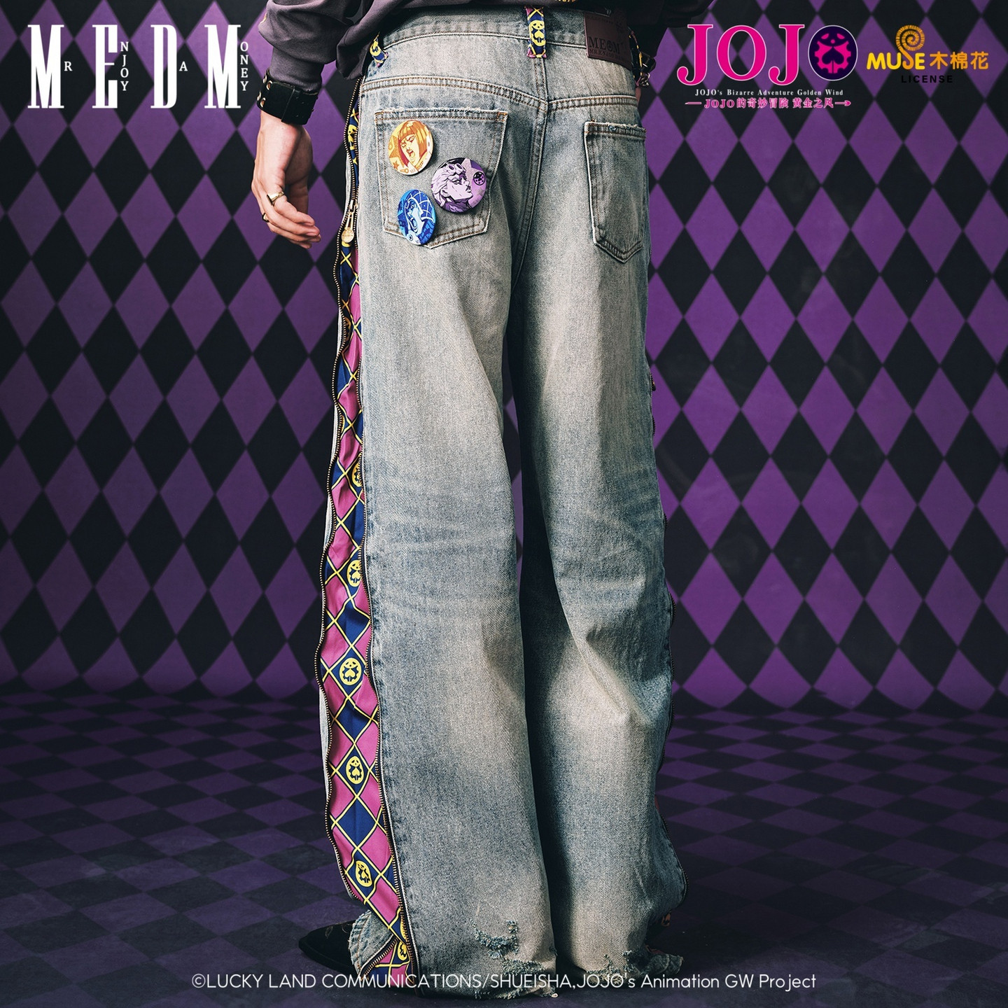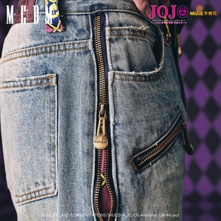 水洗做旧微弹拖地裤 拉链格纹休闲牛仔裤 奇妙冒险联名 MEDMxJOJO