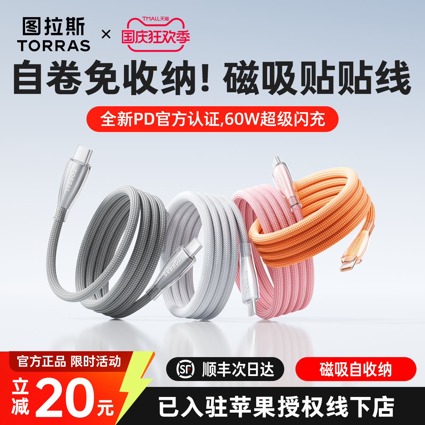 图拉斯磁吸贴贴线适用苹果17ProMax数据线iPhone16快充15充电线手机双TypeC口平板60W收纳耳机 双十一爆款