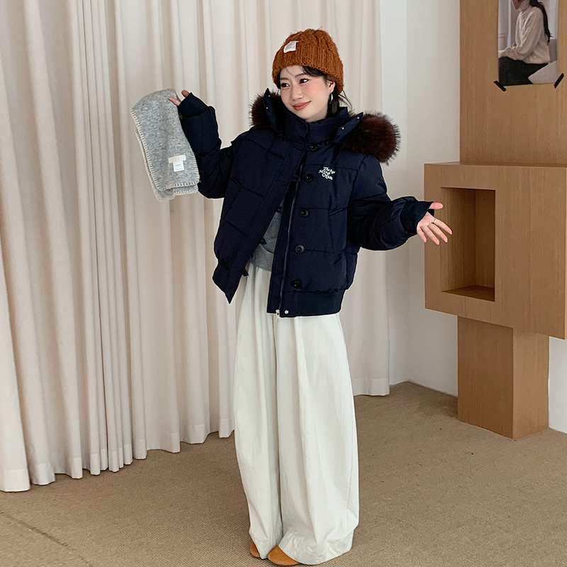 棉服宽松美式 女短款 学院风棉衣外套潮 新款 实拍藏青色连帽冬季