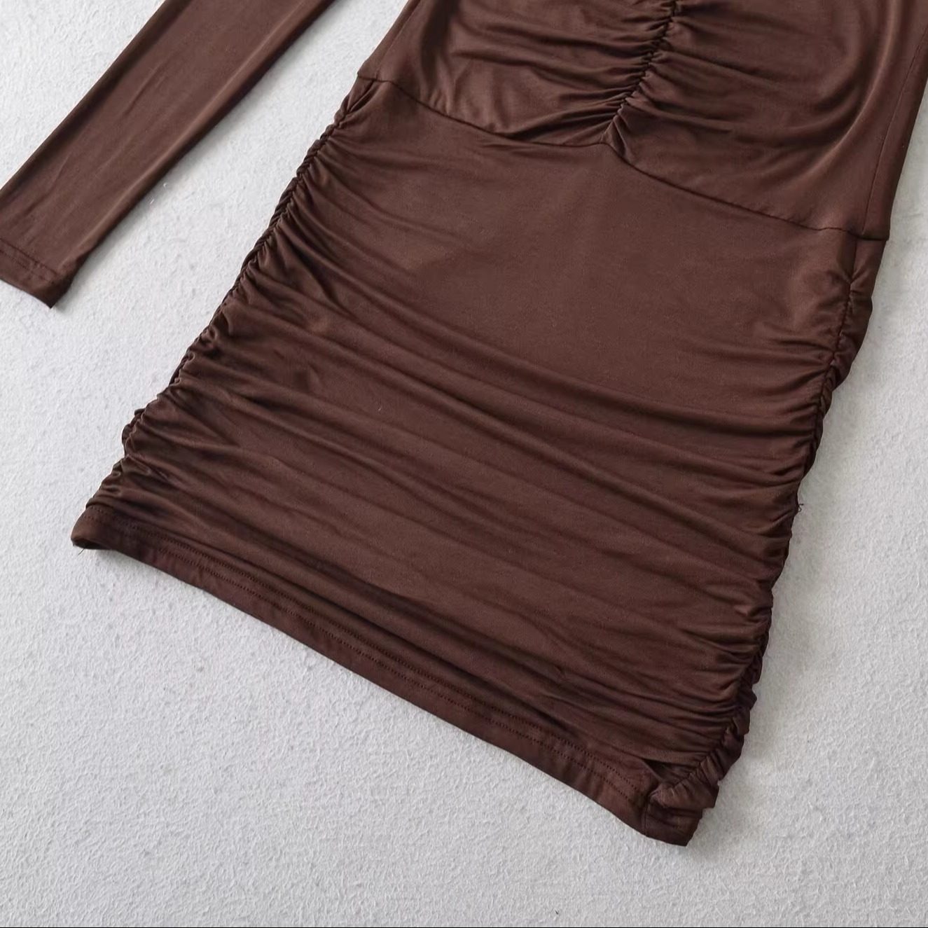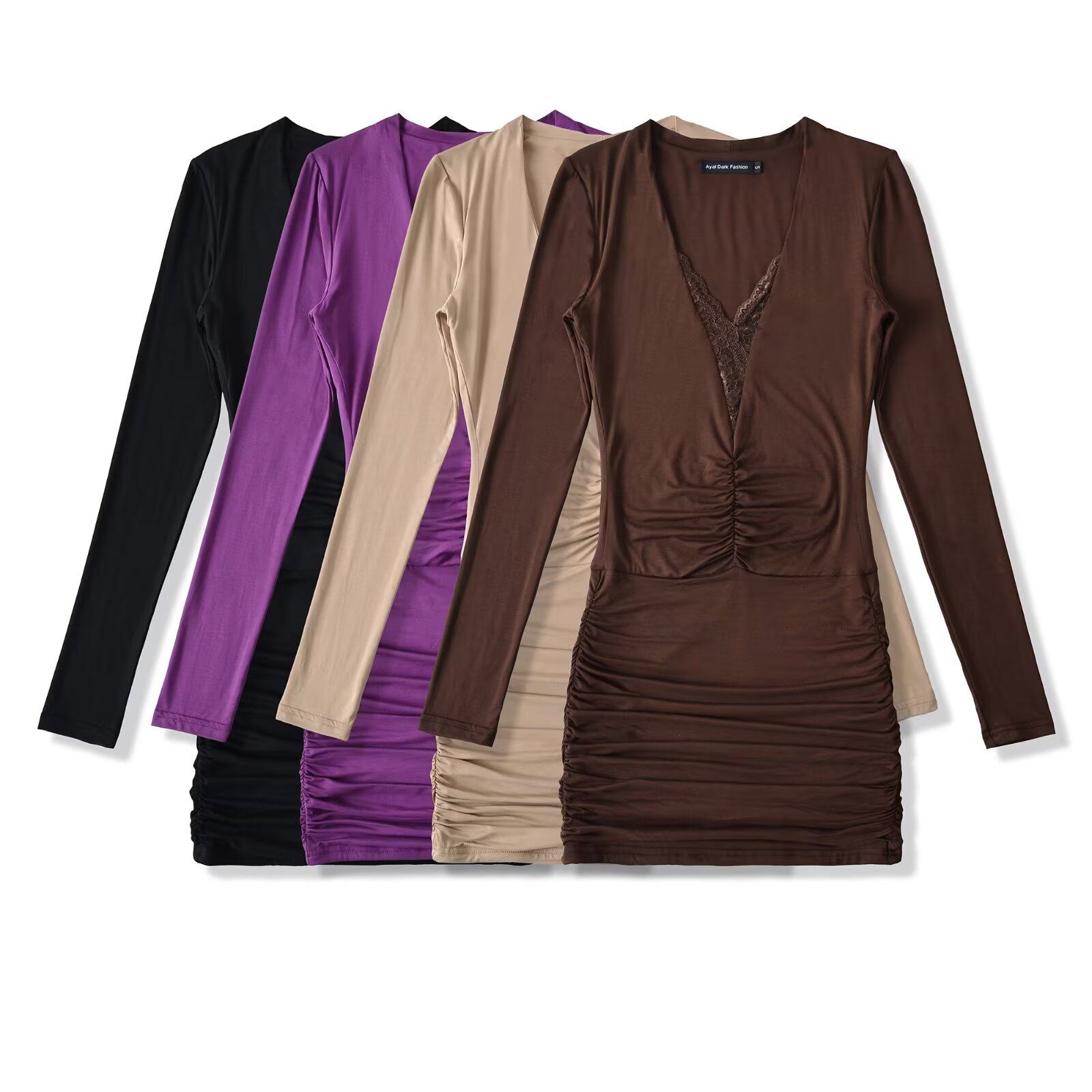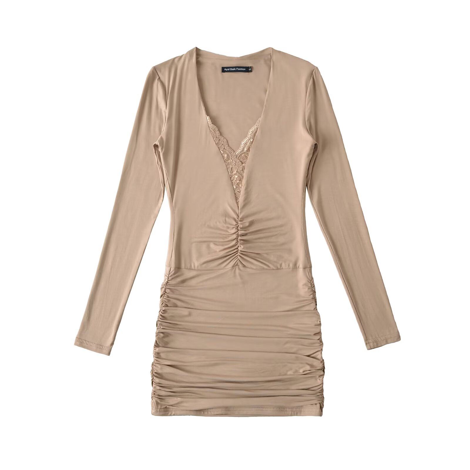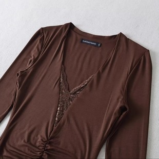棉洋复古性感蕾丝拼接深v包臀连衣裙 打底小短裙 纯欲褶皱拼接长袖