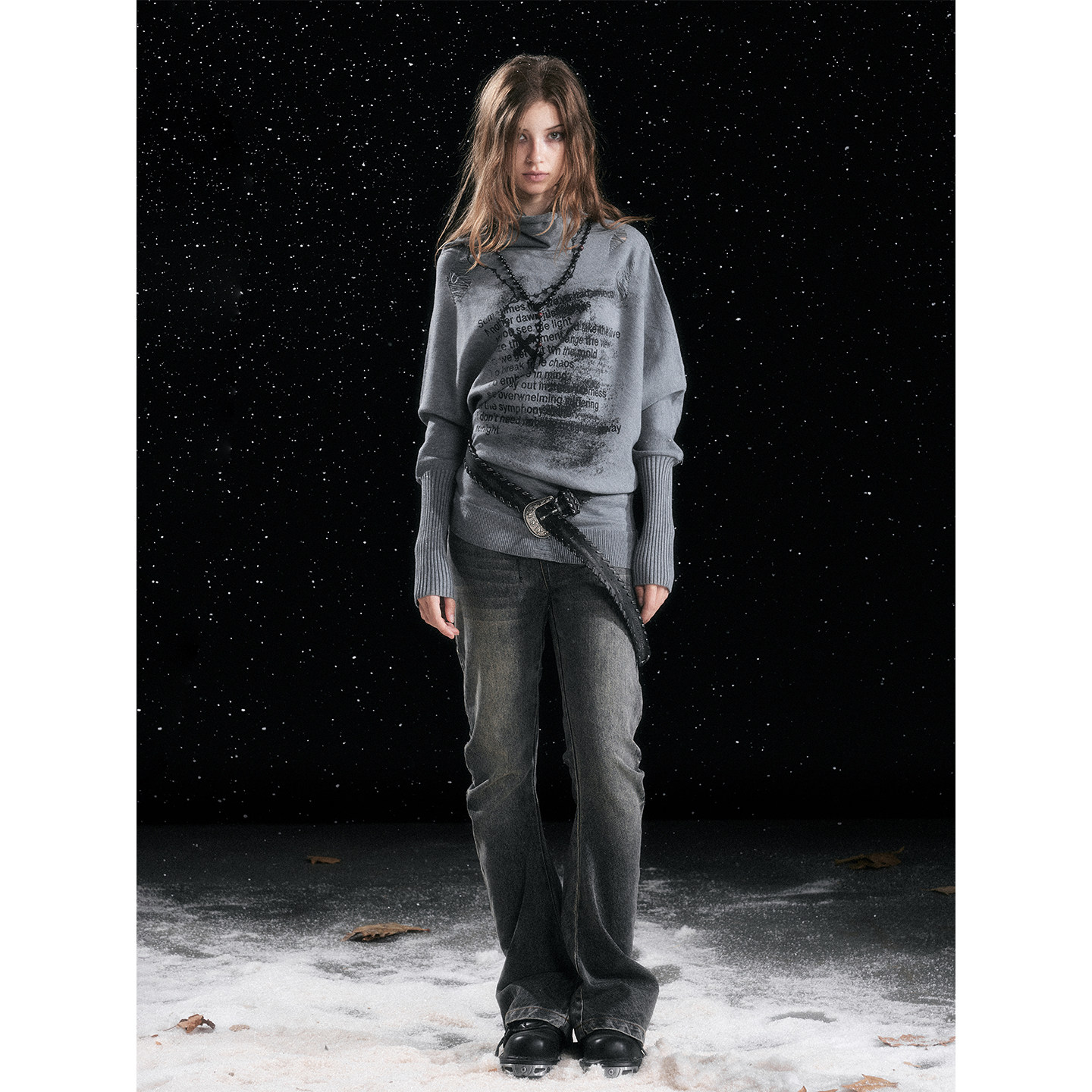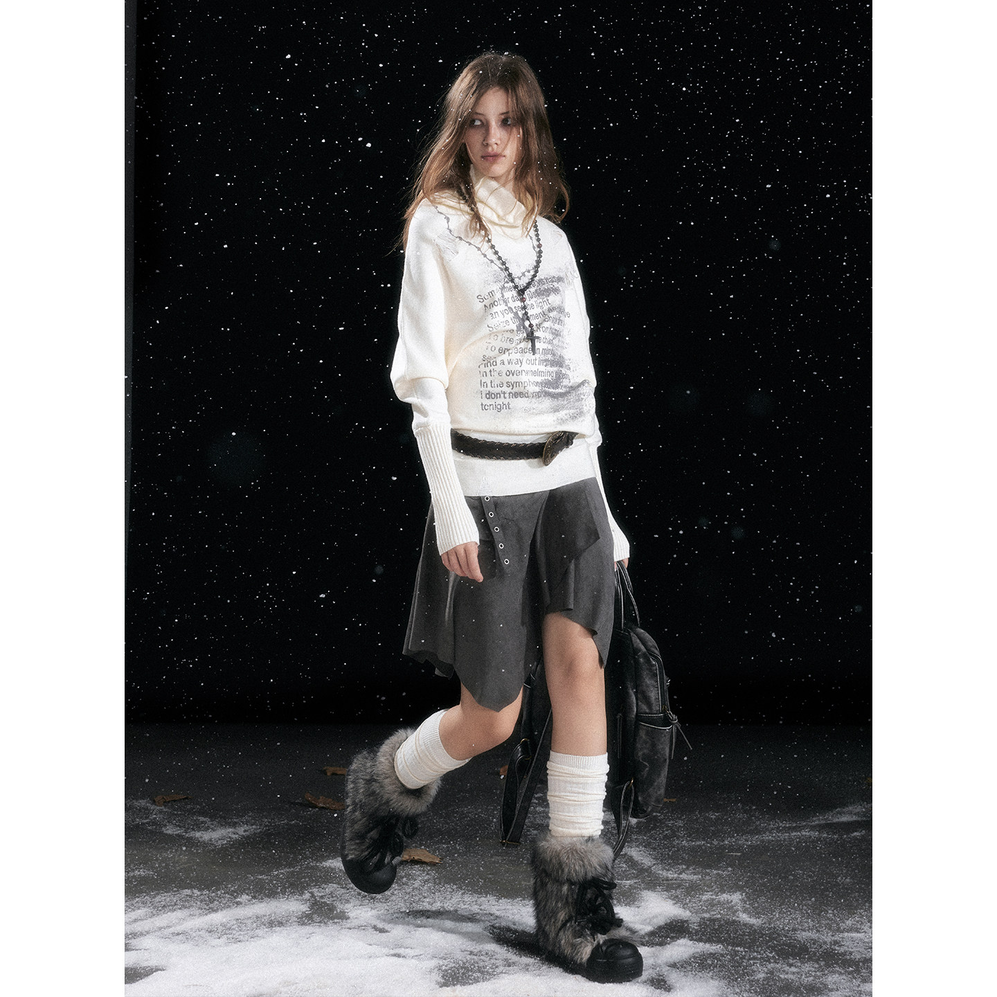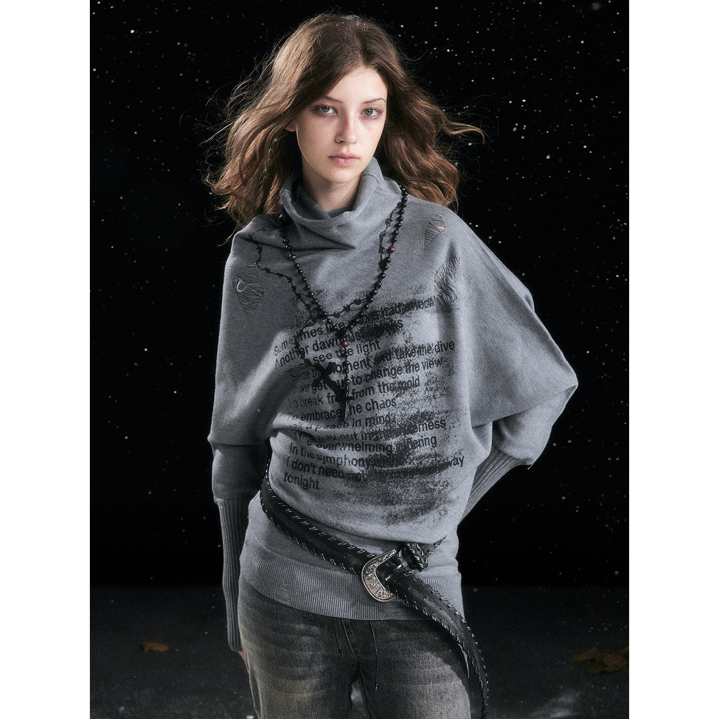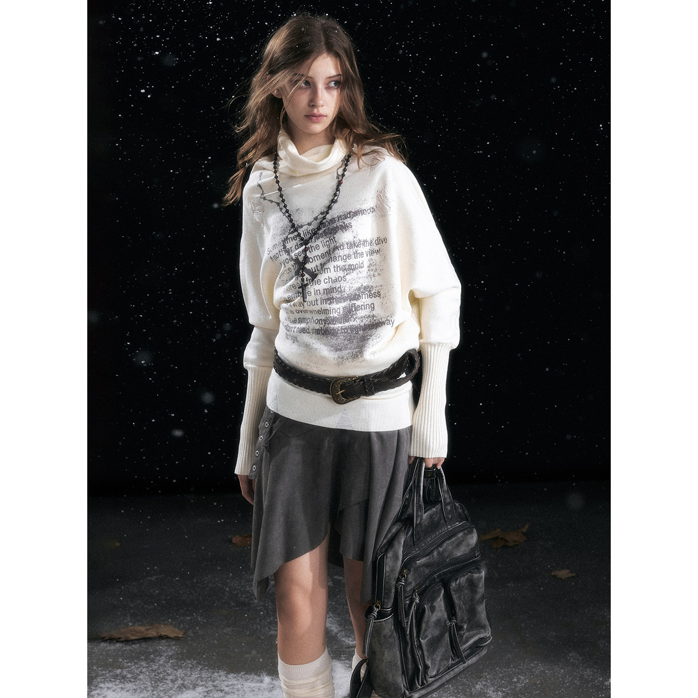 CestNous不对称歪斜链条涂鸦蝙蝠袖 堆褶毛衣女秋冬宽松半高领毛衫