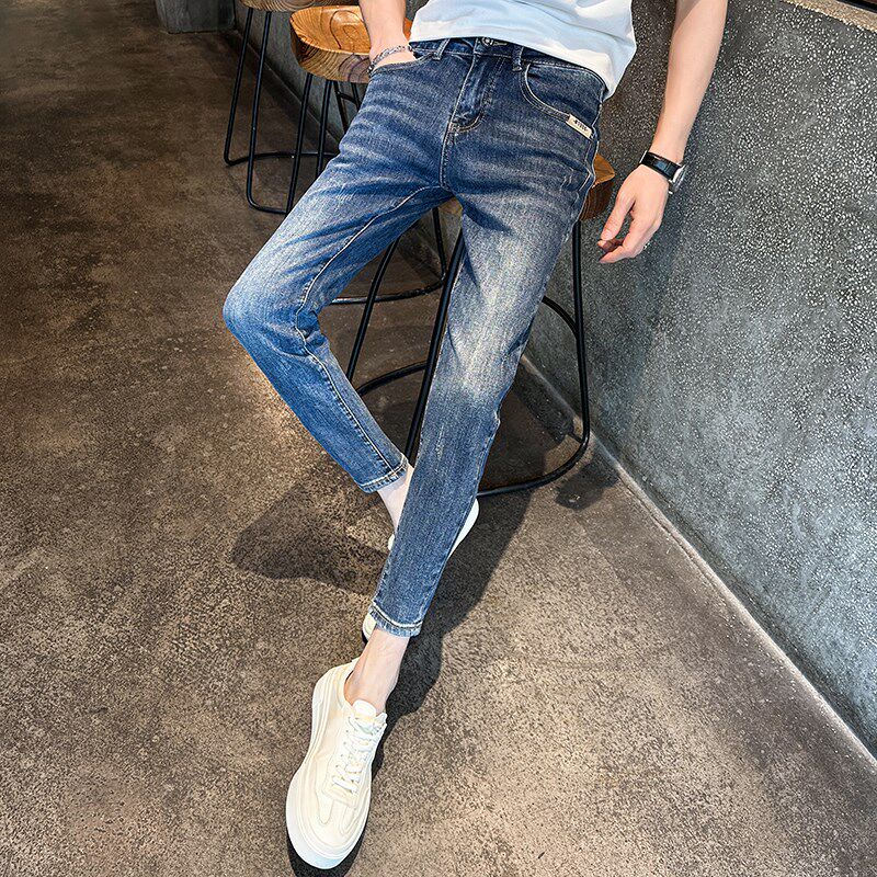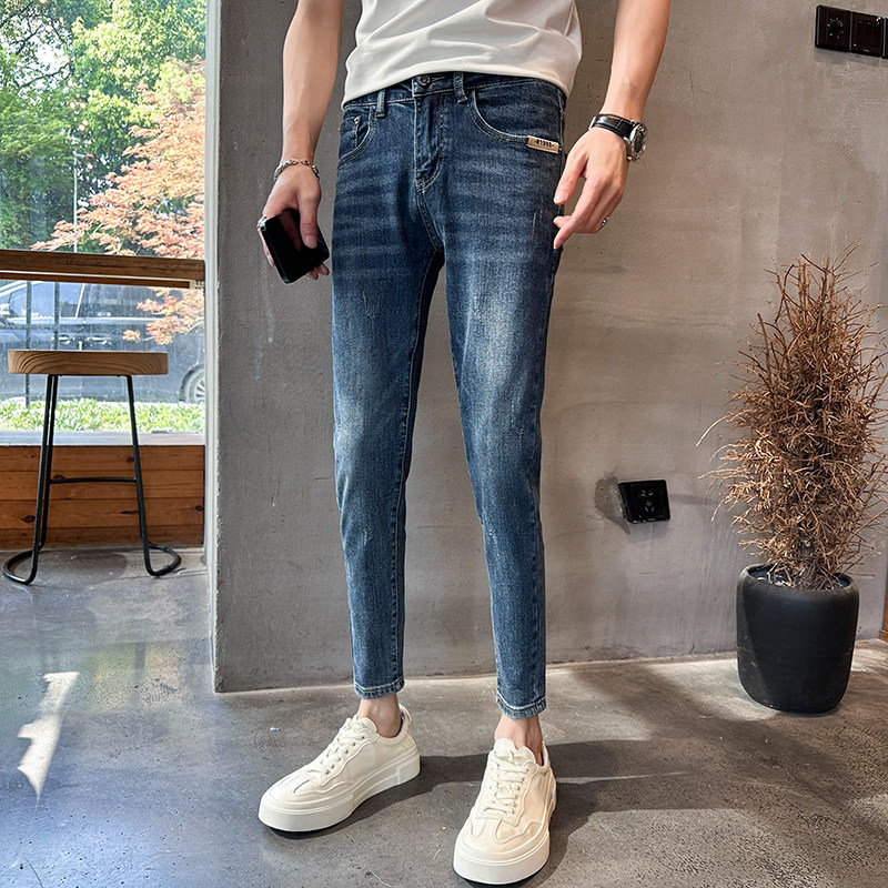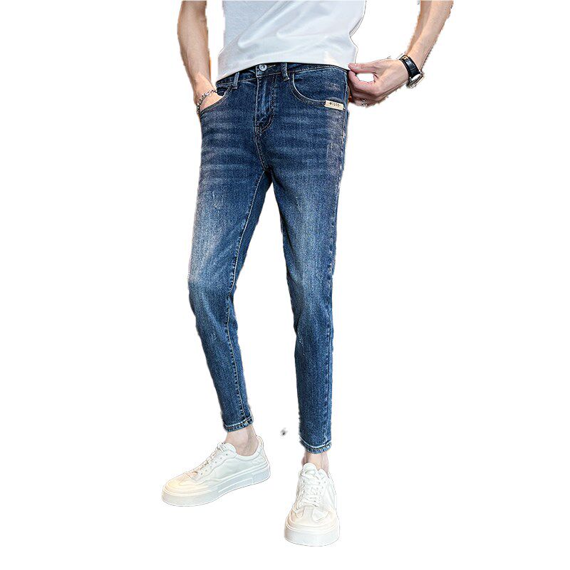 蓝色简约猫爪修身 弹力铅笔裤 牛仔裤 小脚九分裤 子 男潮韩版 2023夏季