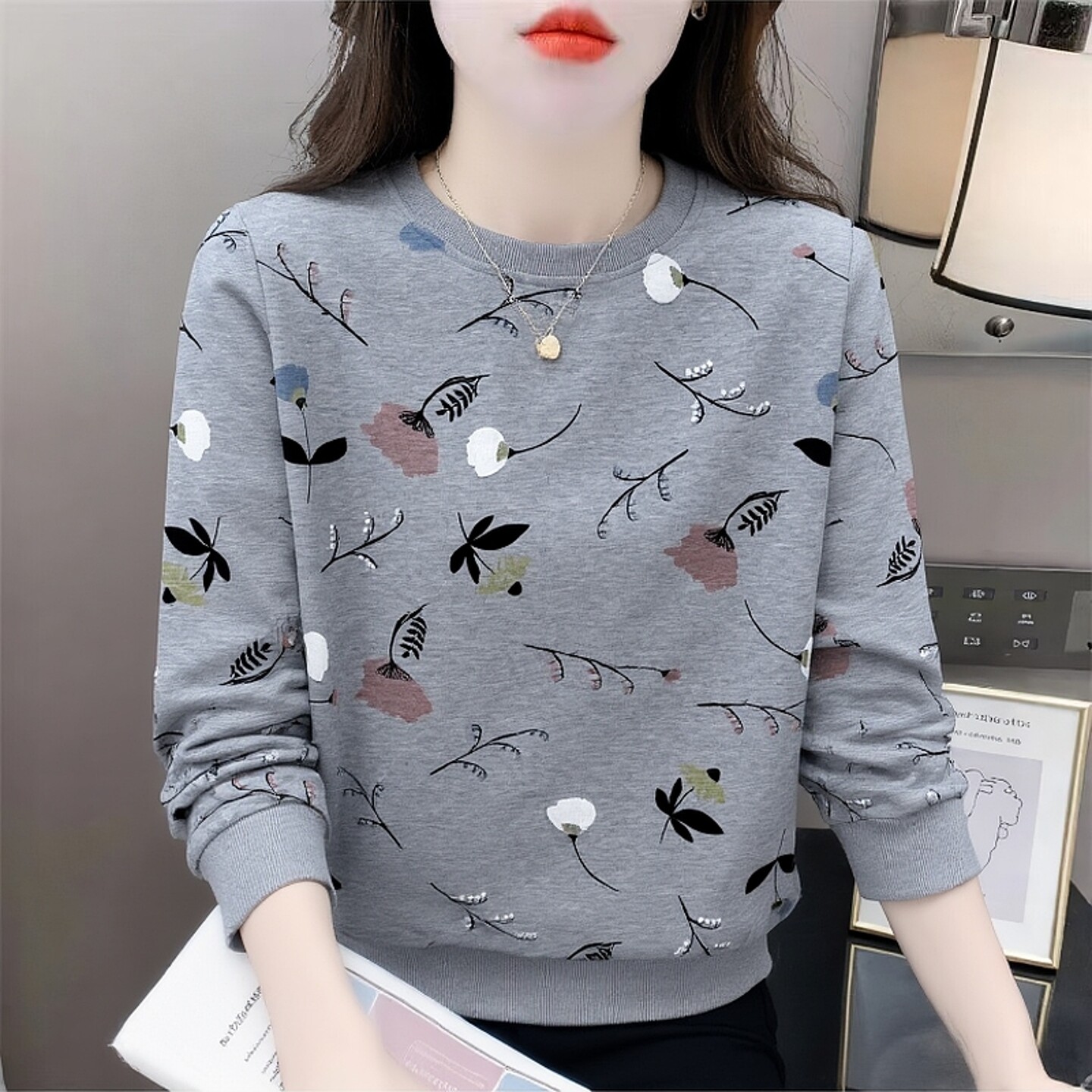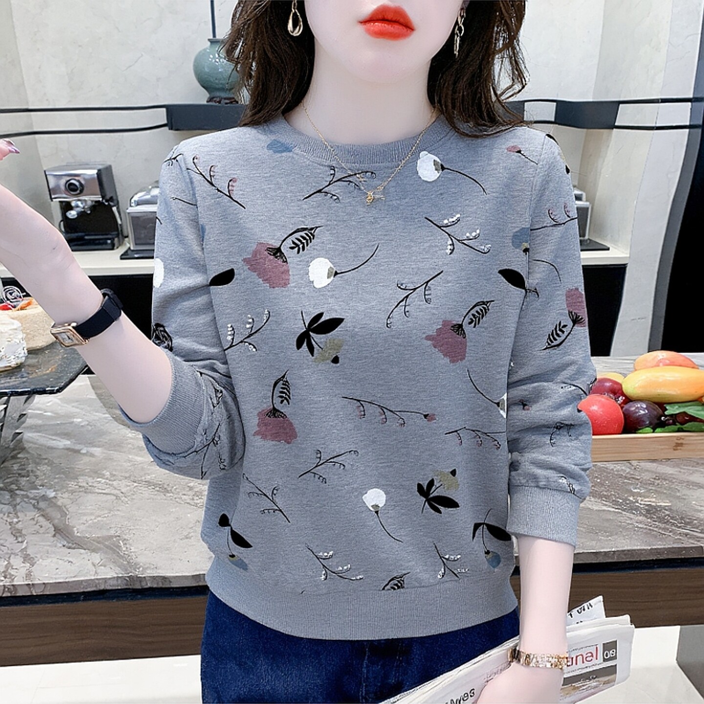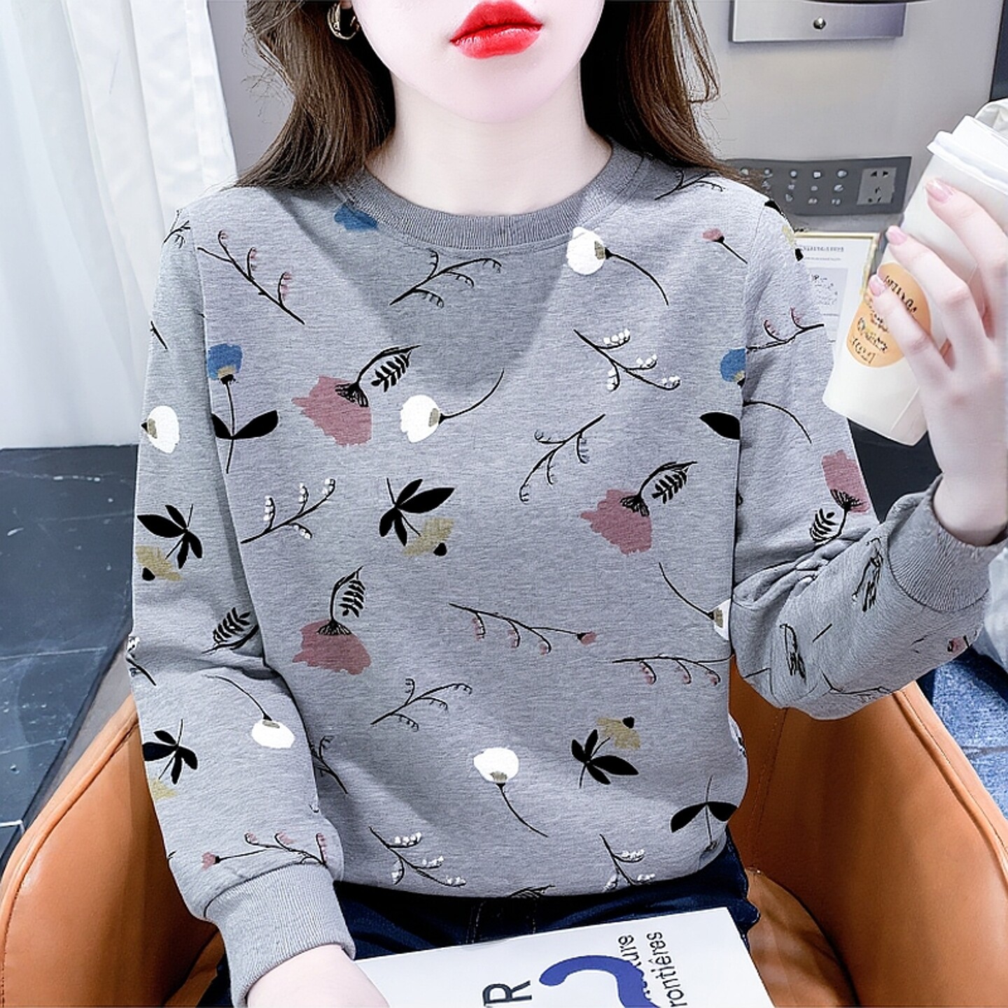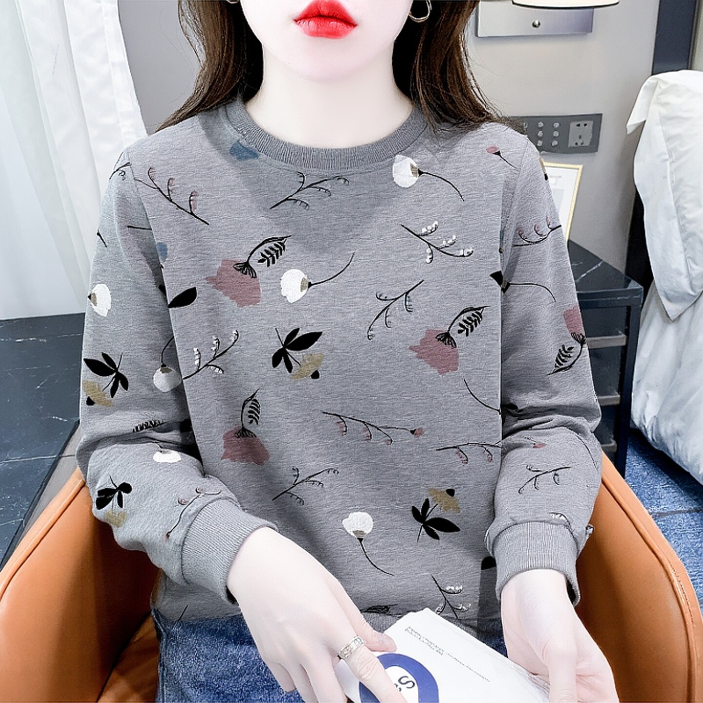 上衣 T恤女设计感减龄圆领卫衣女士宽松显瘦长袖 春装 花朵印花长袖