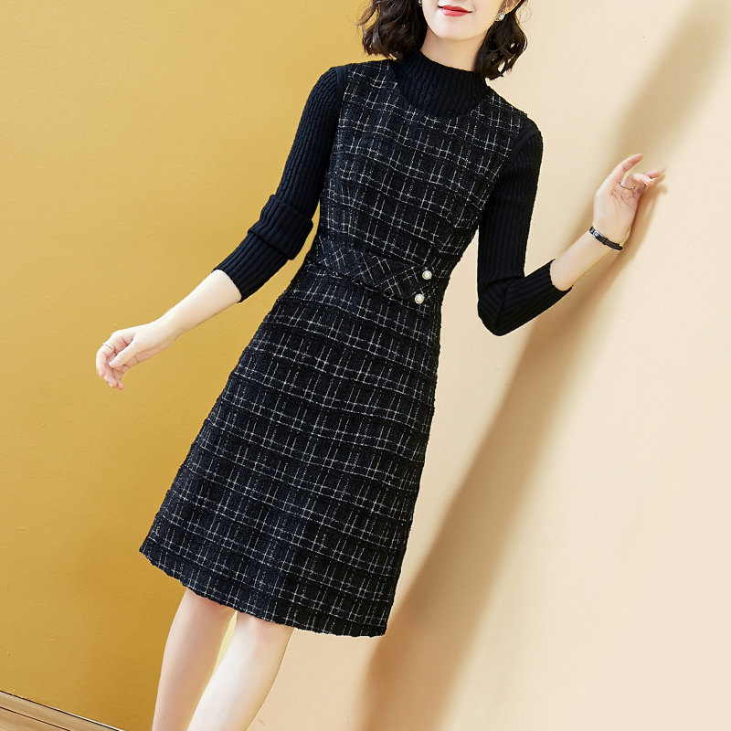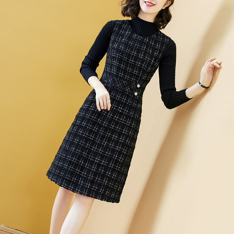 裙子马甲裙 黑色格子中长款 背带裙女秋冬两件套装 显瘦收腰2024新款