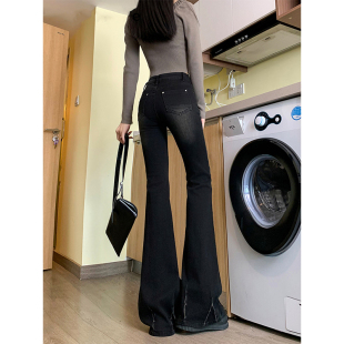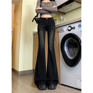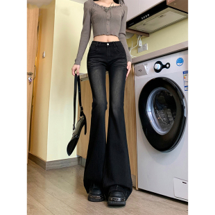 黑色高腰水洗微喇叭牛仔裤 马蹄长裤 女春季 弹力修身 新款 PMORH美式