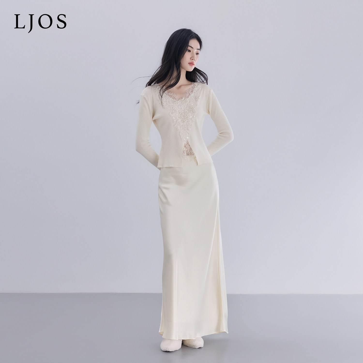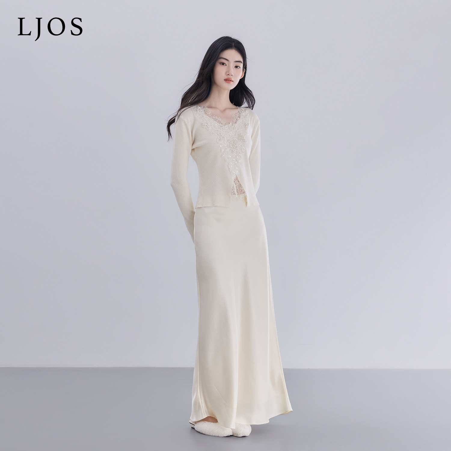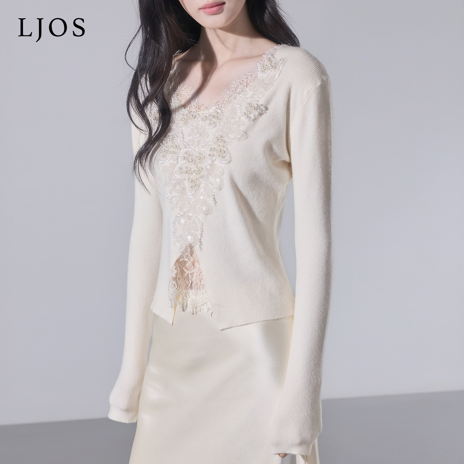 2025冬杏色刺绣毛衣优雅显瘦 针织衫 LJOS 2.0中古花卉钉珠修身