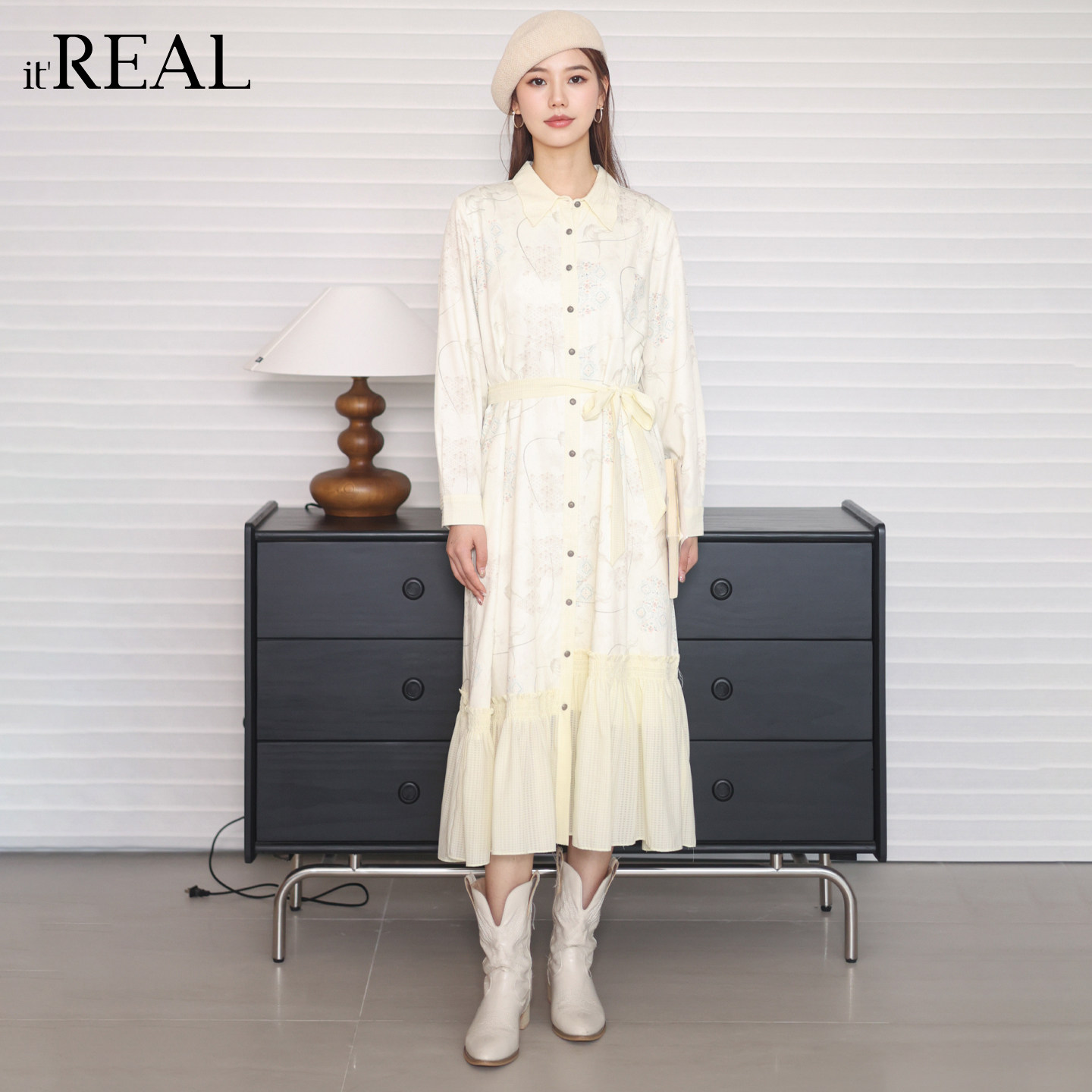 气质文艺休闲拼色高腰连衣裙女 新款 real瑞尔冬季