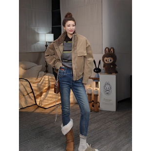 MISSMO可可欢姐重工洗水弹力内里植绒高腰提臀显瘦牛仔小脚裤