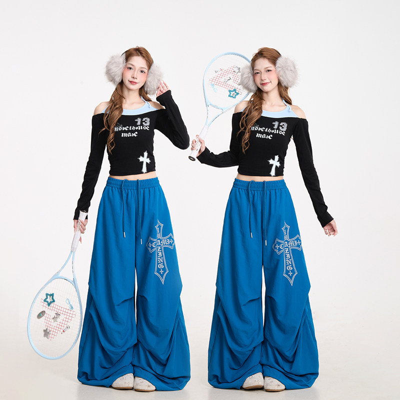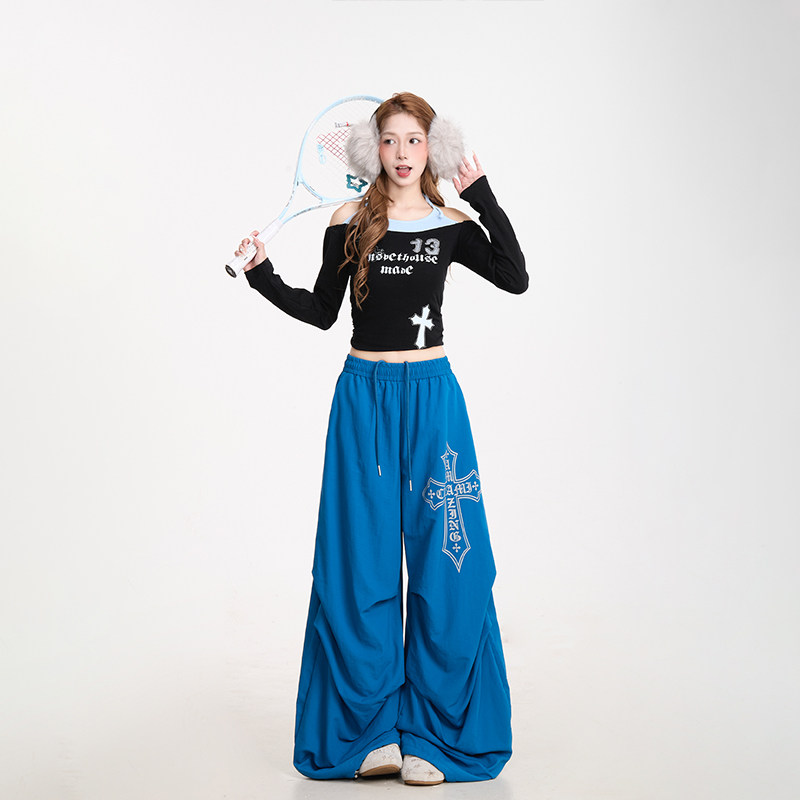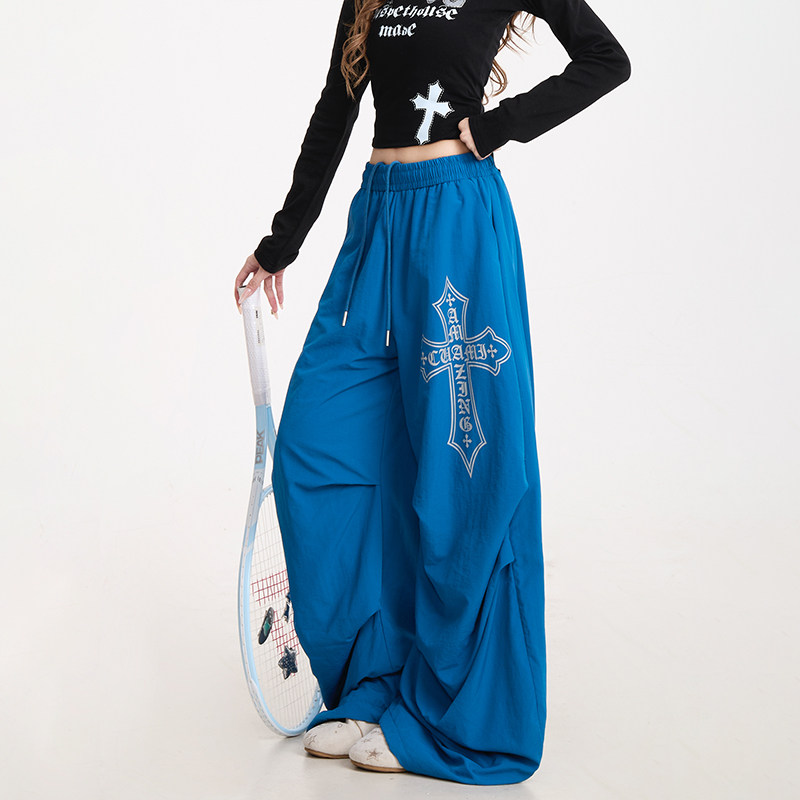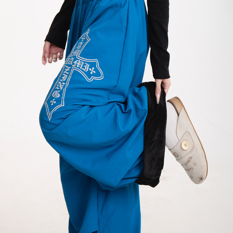 复古爵士舞秋冬加绒阔腿裤 NERESUM十字架印花弯刀伞兵裤 女美式