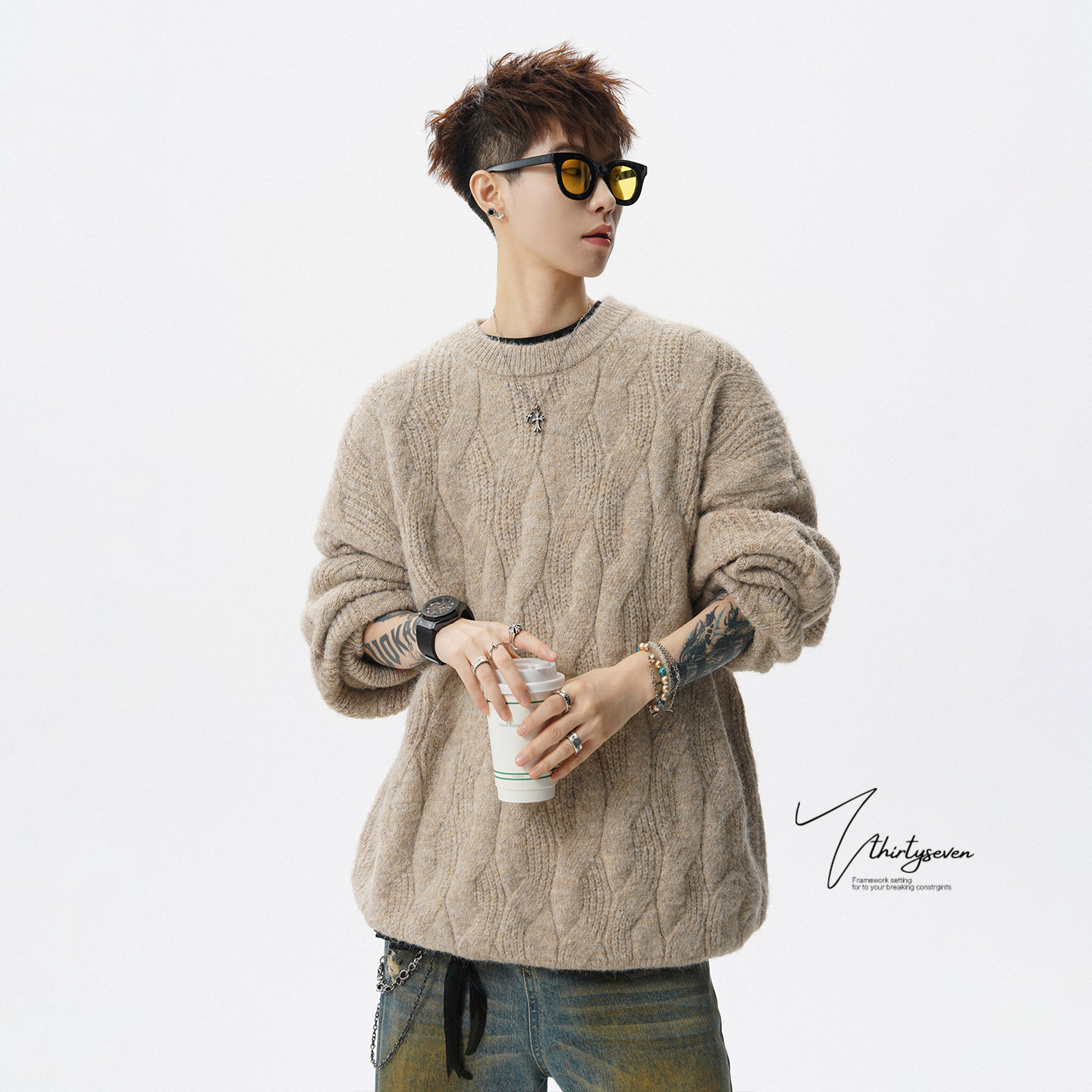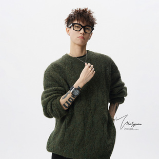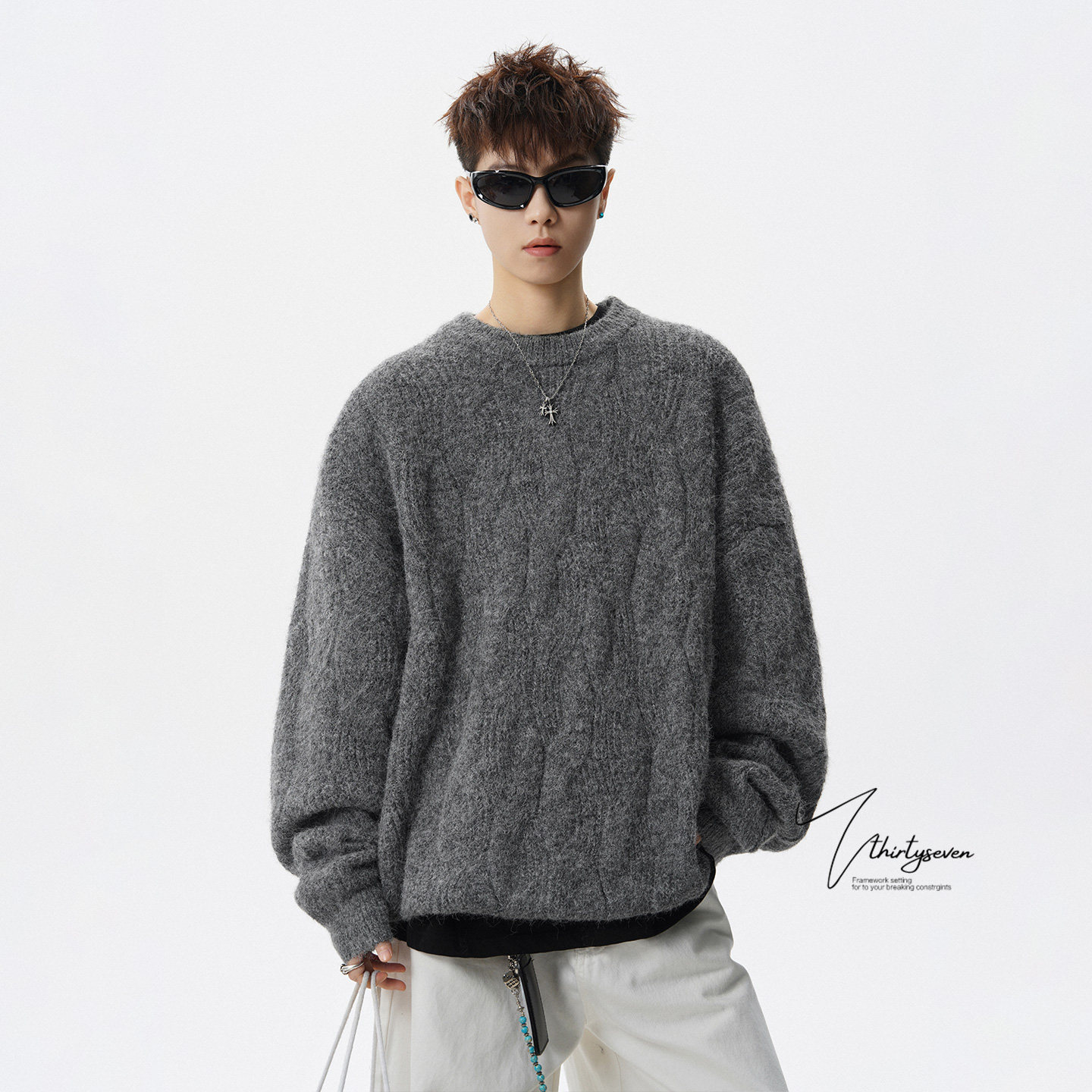 宽松简约套头毛衣 男秋冬新款 V37美式 重磅马海毛肌理感圆领针织衫