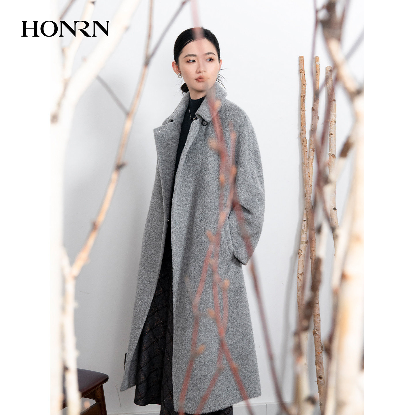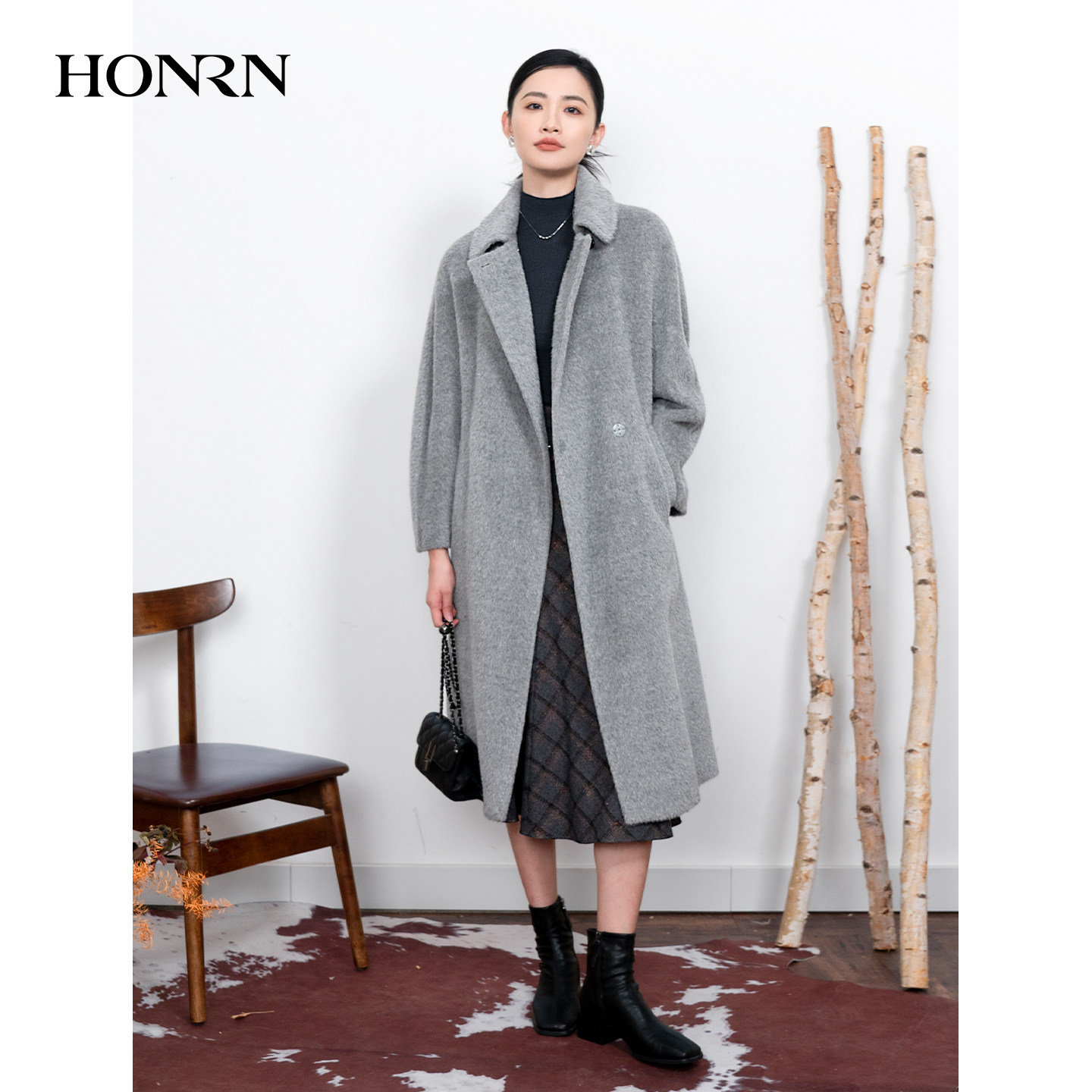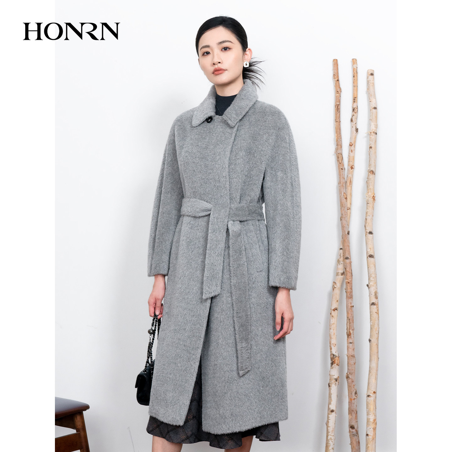 HONRN 系带收腰羊驼毛羊毛呢大衣外套女秋冬HI55OD086 红人中长款