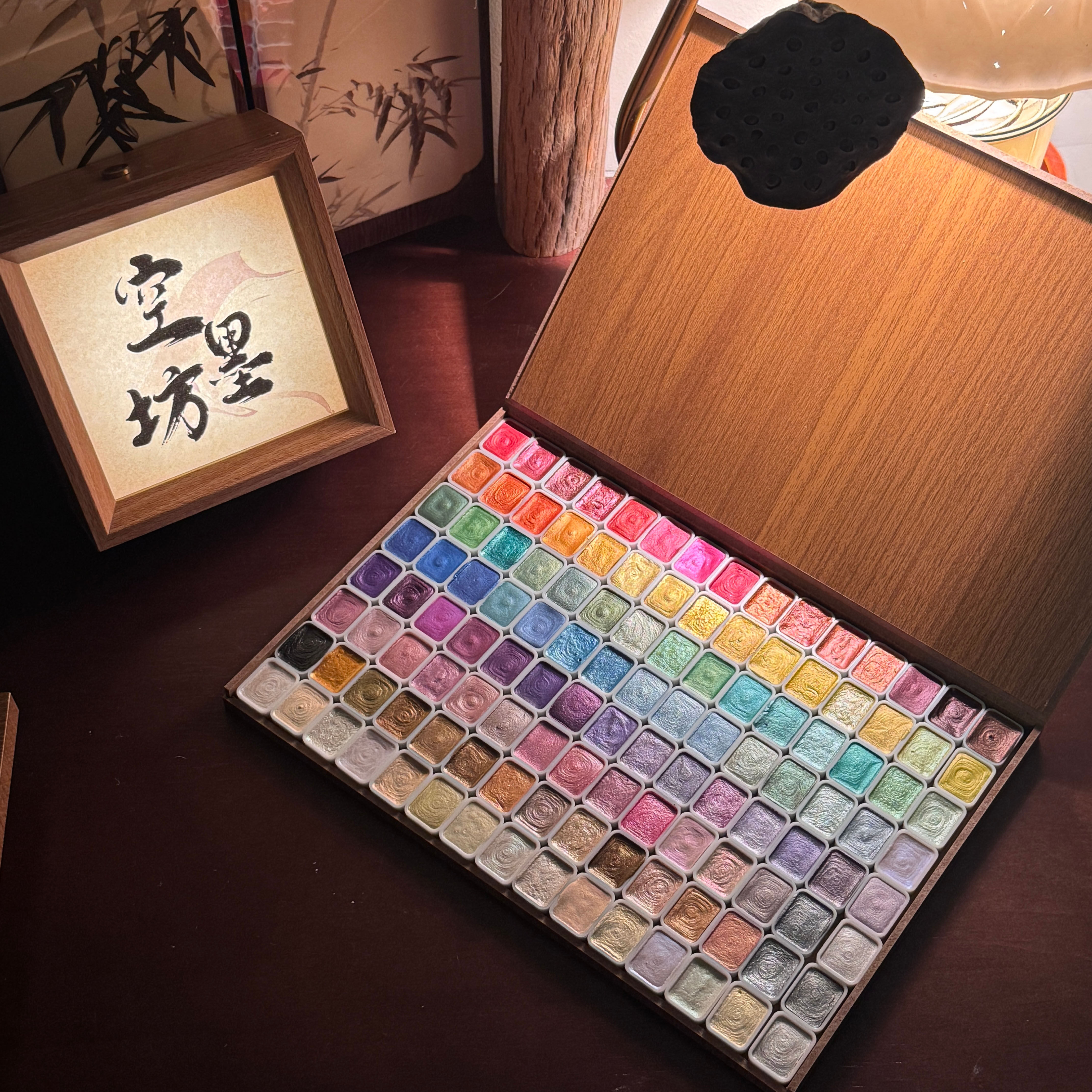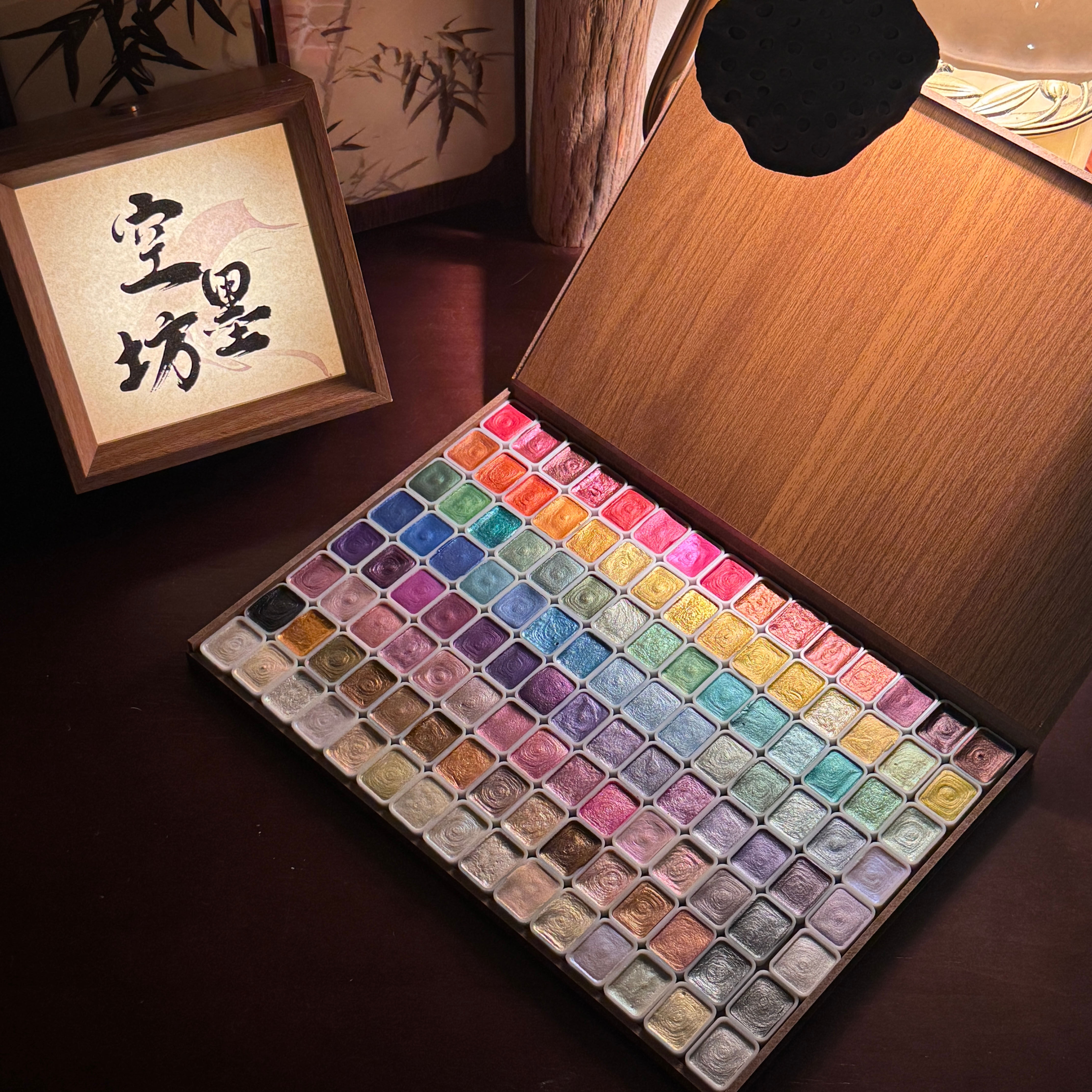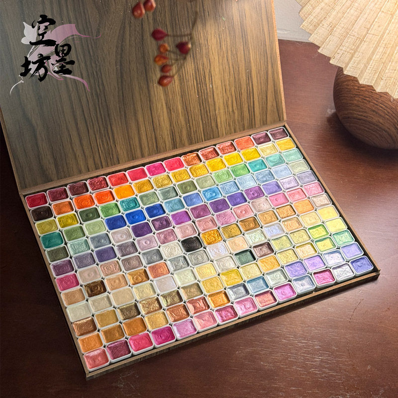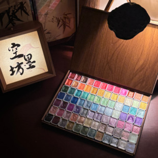国风珠光水彩颜料套装 固体彩绘颜料木盒美甲绘画美术生水彩画闪粉