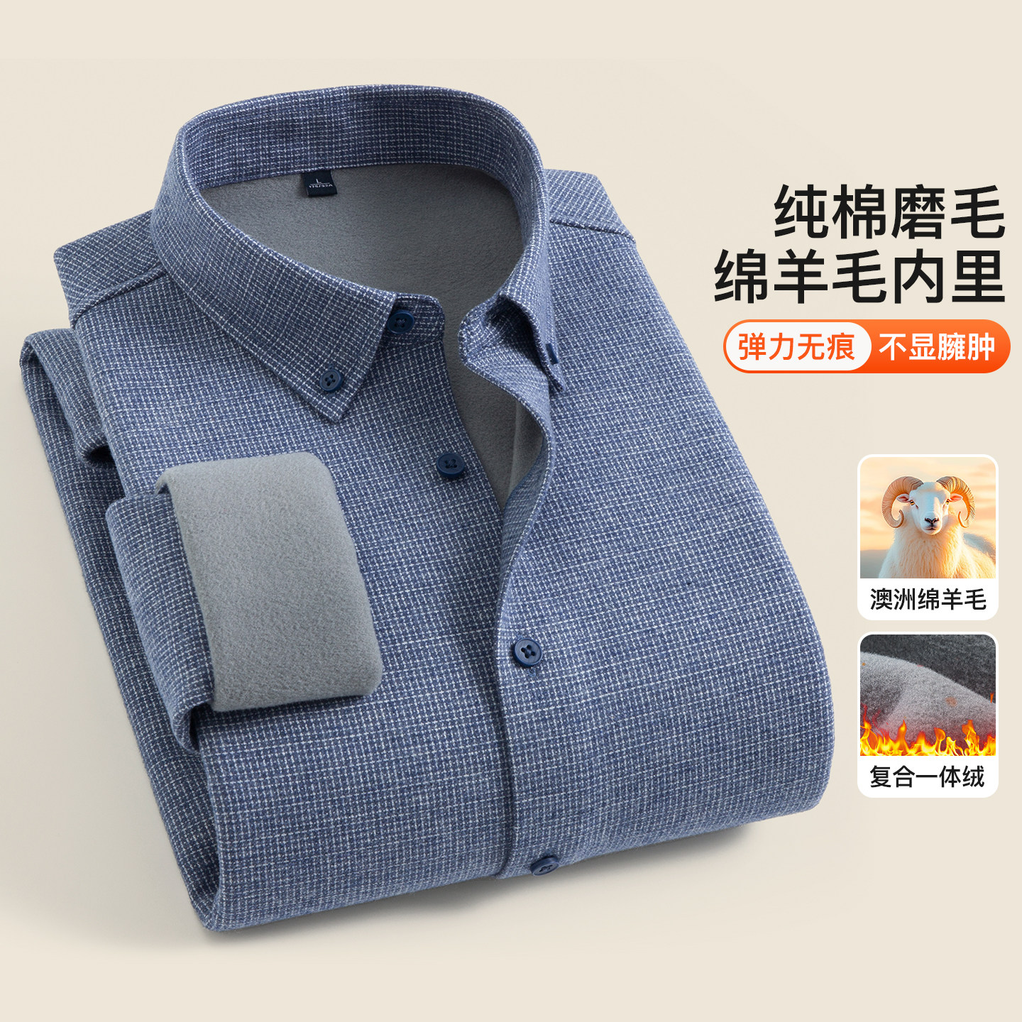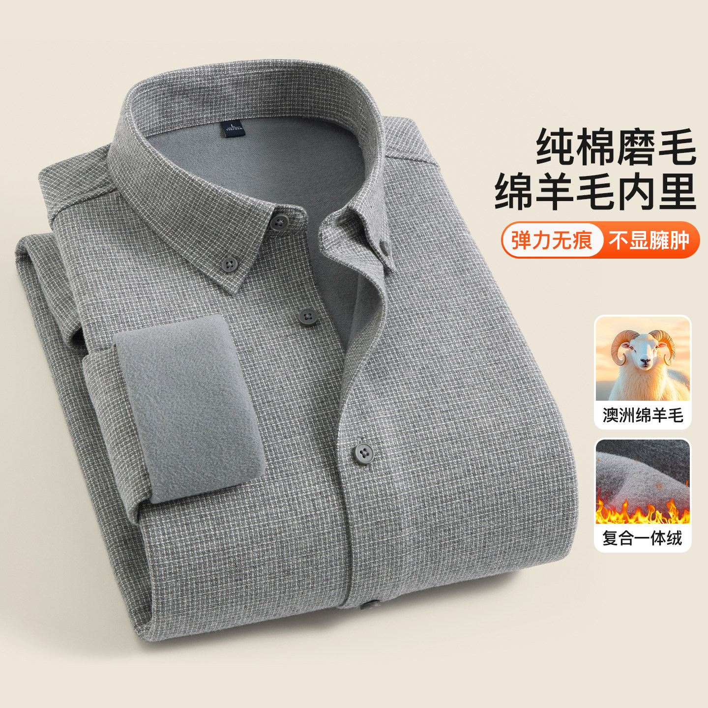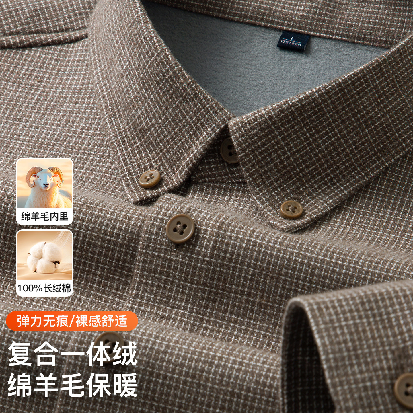100%纯棉格子保暖衬衫 长袖 加绒加厚含羊毛衬衣 高端男士 啄木鸟冬季