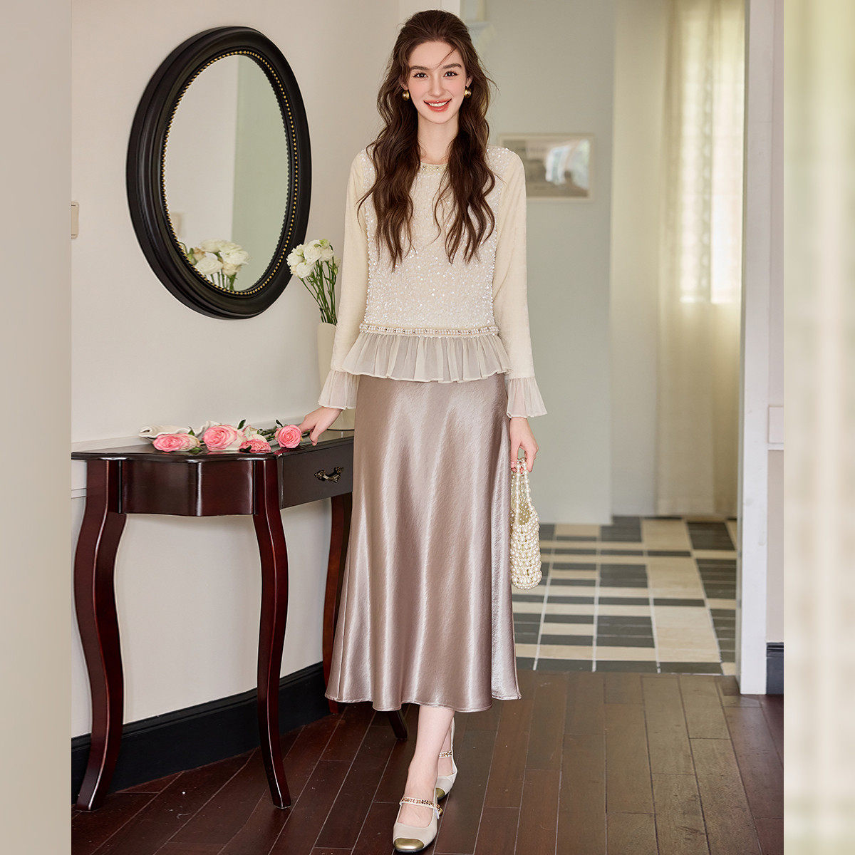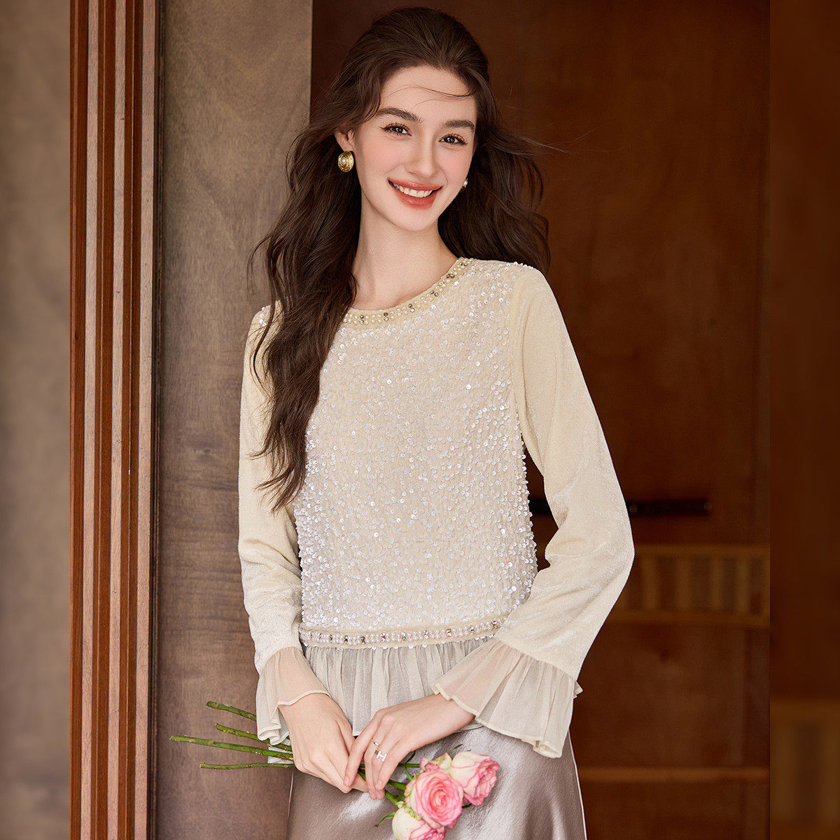 白鹿语小香风钉珠亮片拼接衬衫 高级感荷叶边打底上衣 春秋新款