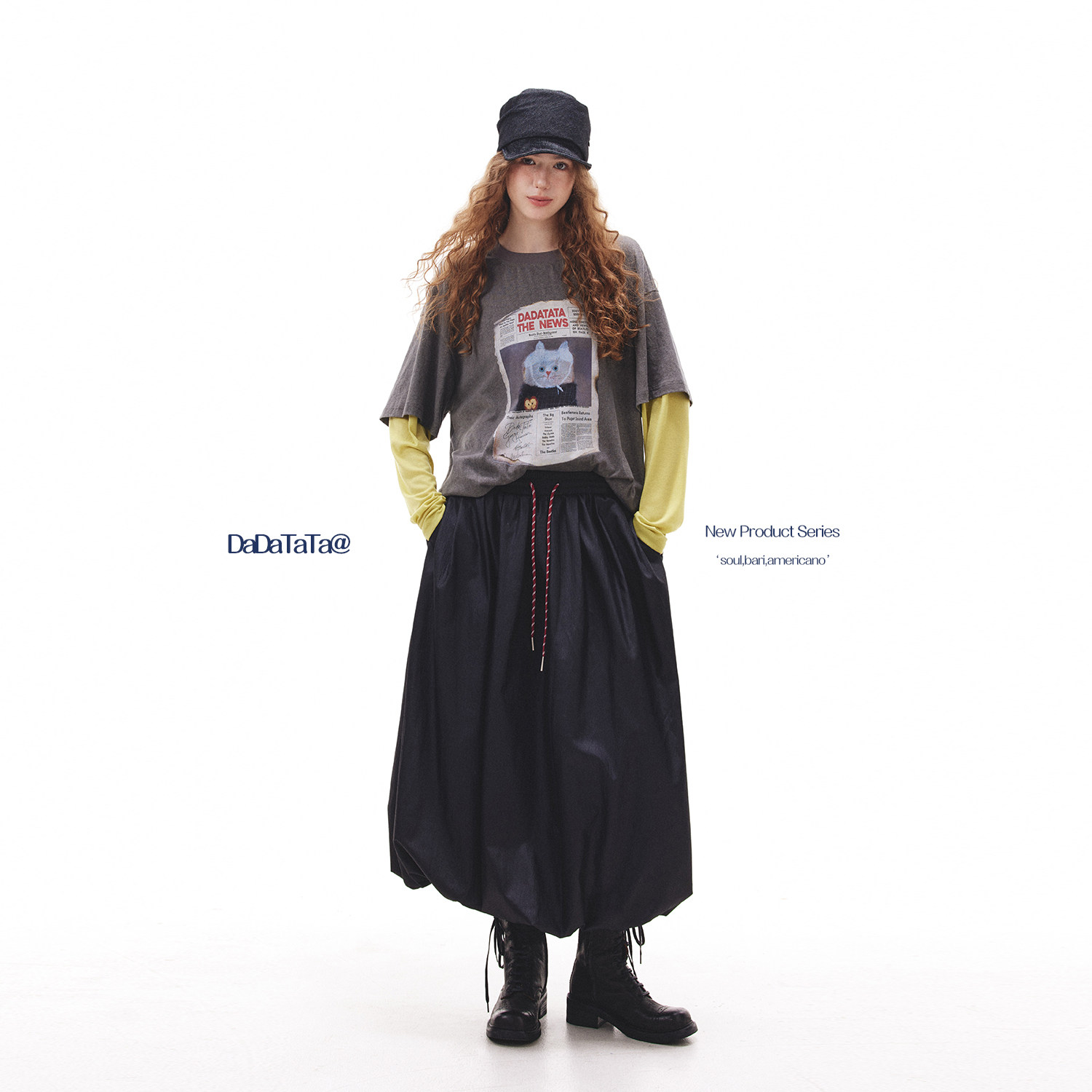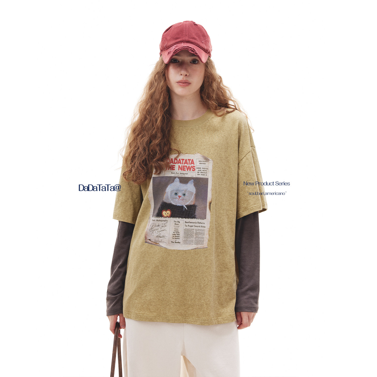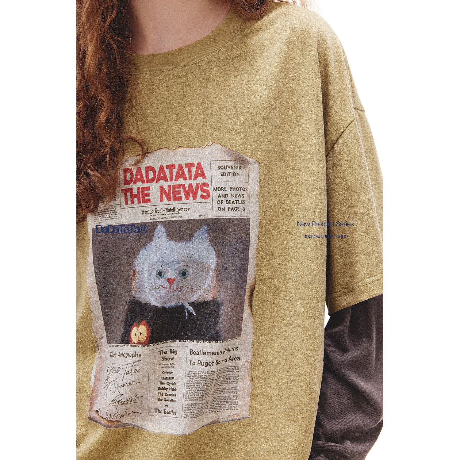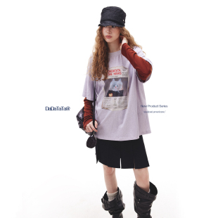 短袖 100棉胸前猫咪印花拼接袖 T恤女 画报猫咪 晶咕白标DADATATA