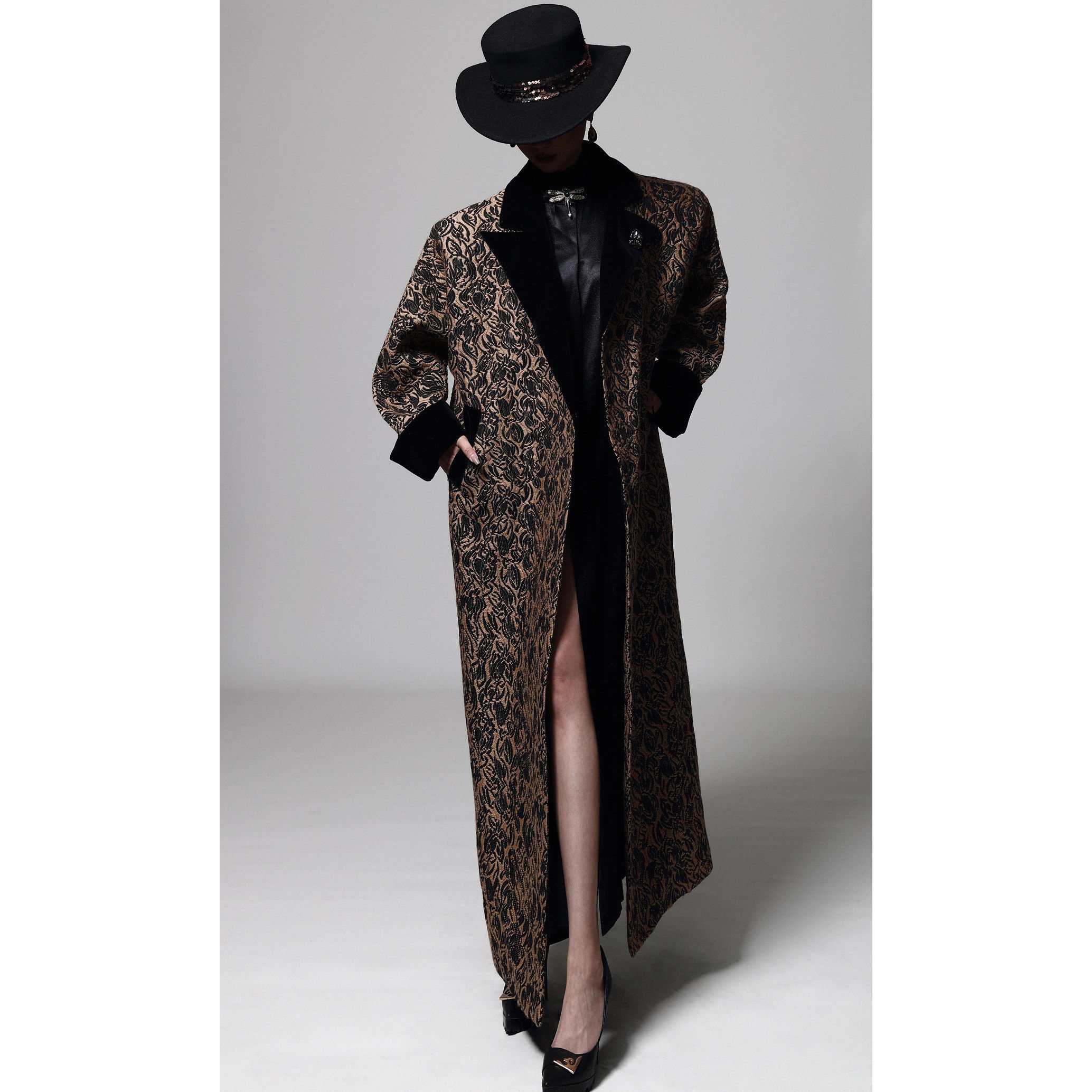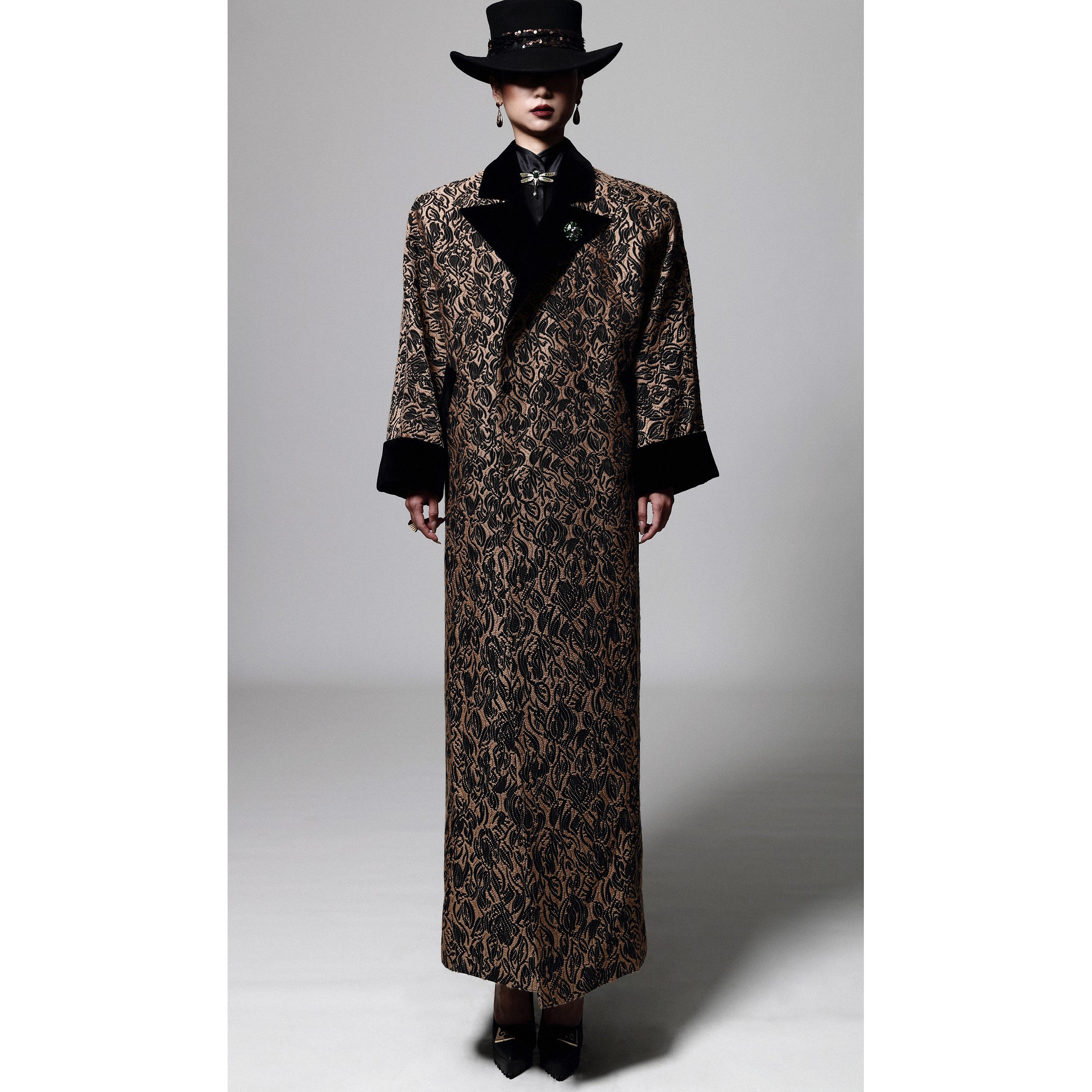 芈莱尤优 6122 高定系列丝绒领复古黑金提花风衣F23