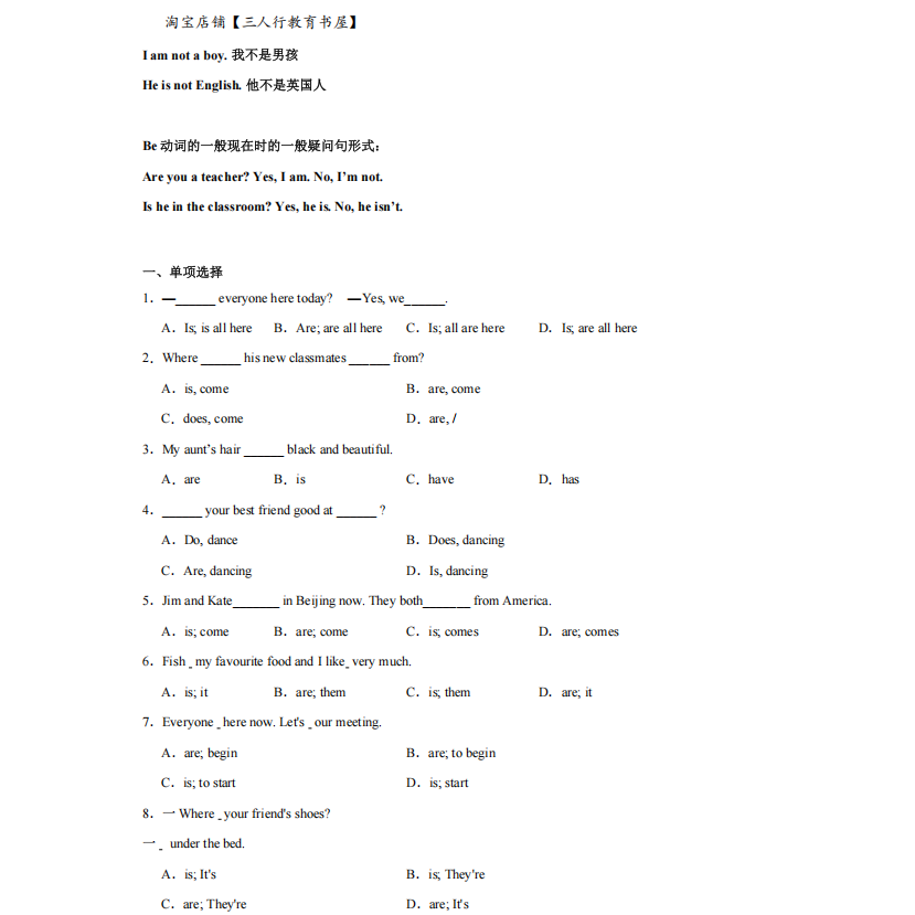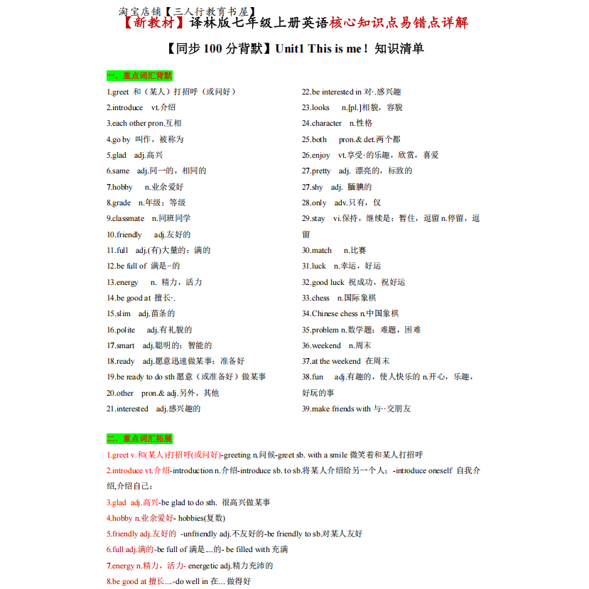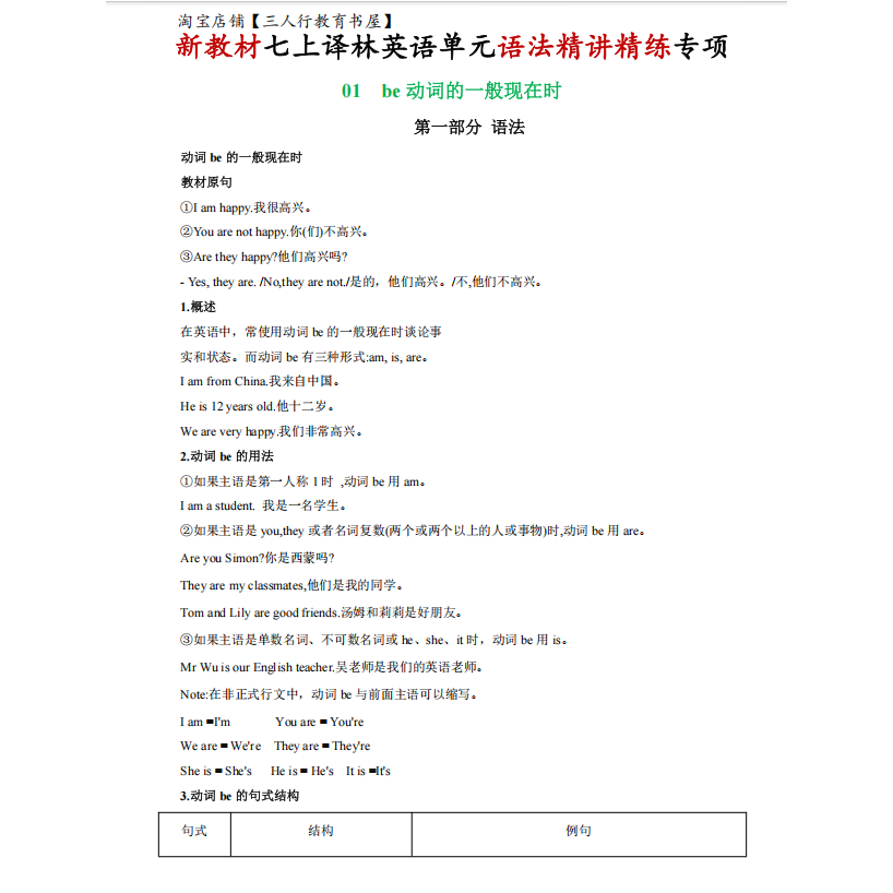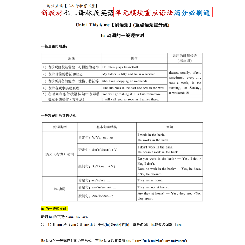 新教材江苏教译林版 测试易错必刷题专项训练习本 英语七年级上册重点语法模块专题满分单元
