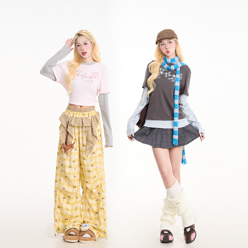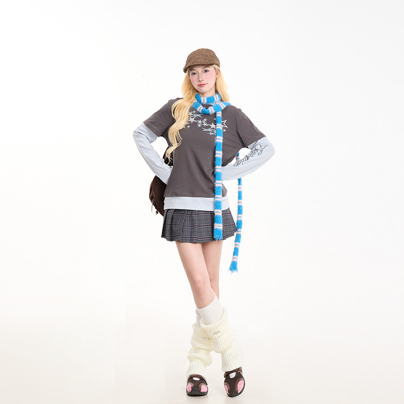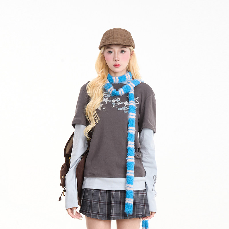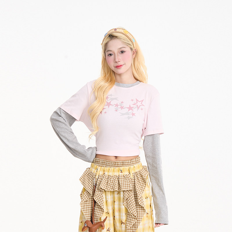 上衣T恤 复古设计感宽松美式 NERESUM星星印花假两件拼接长袖 秋季