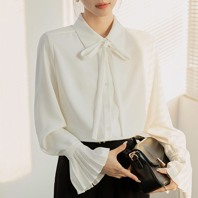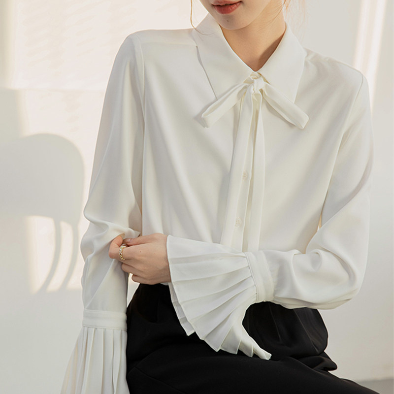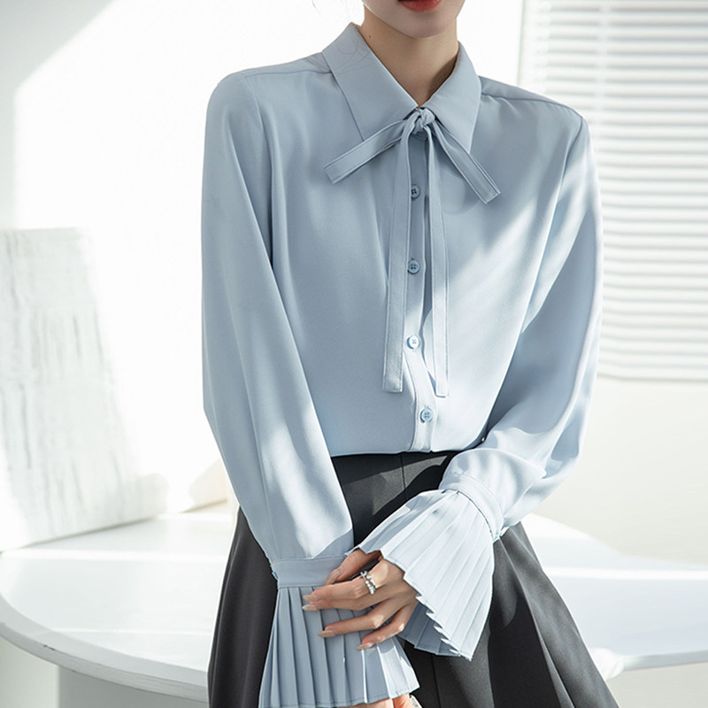 风琴袖 内搭长袖 蓝色衬衫 领带蝴蝶结职业正装 飘带上衣 法式 秋冬新款