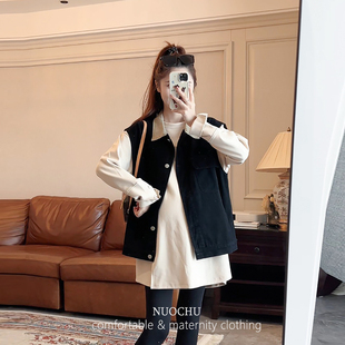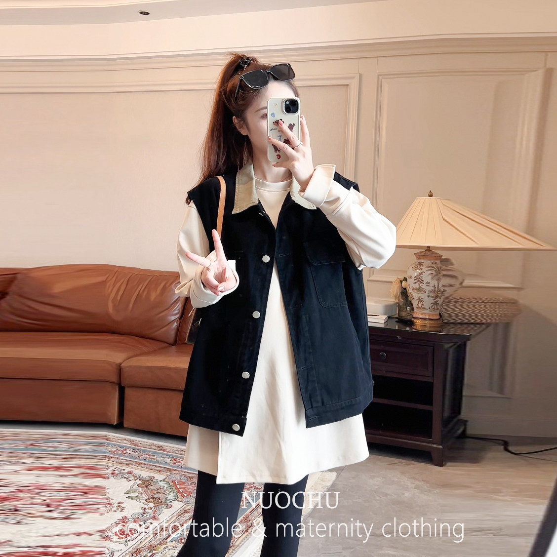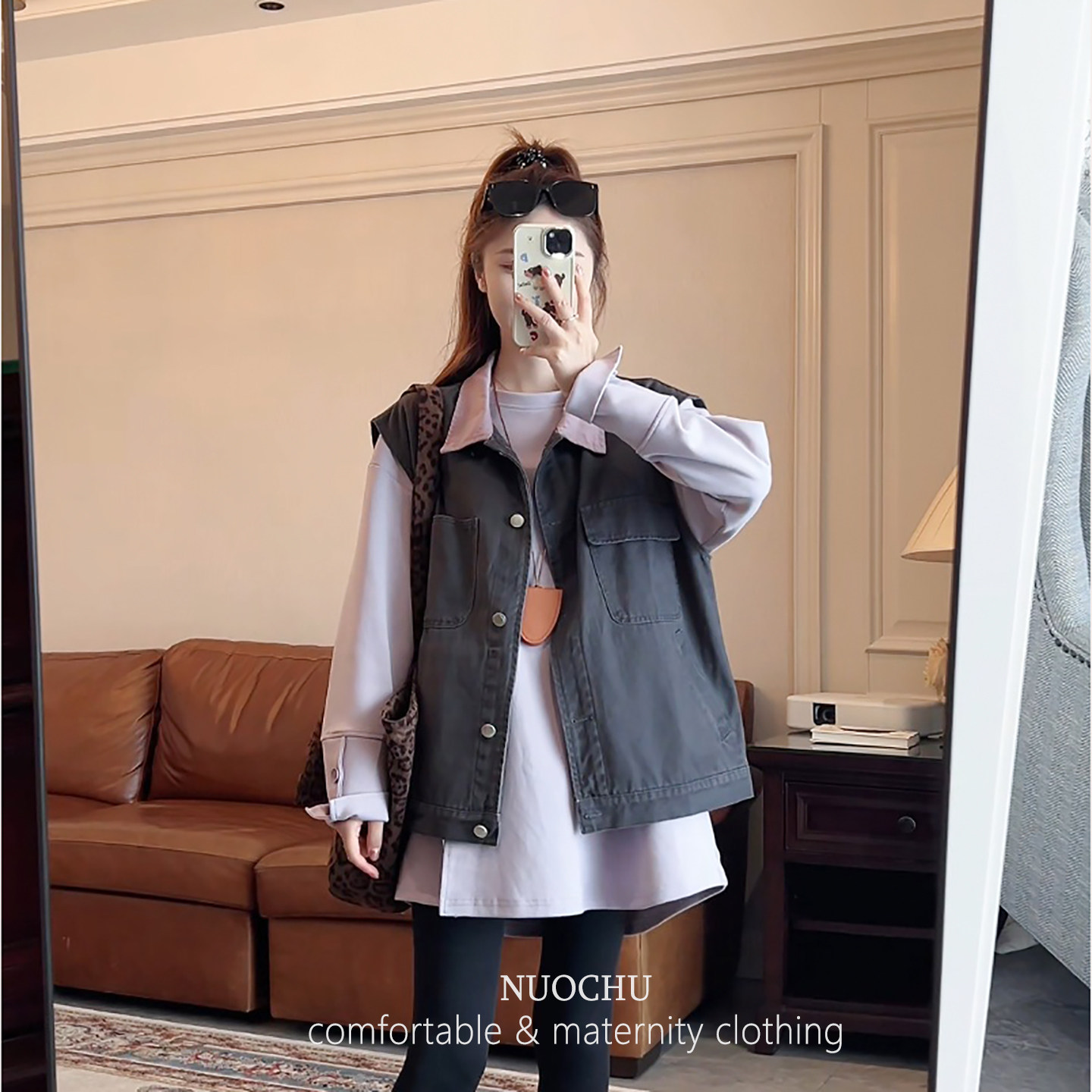 诺初孕妇翻领马夹翻领上衣外套高品质撞色领牛仔工装 马甲洋气时髦