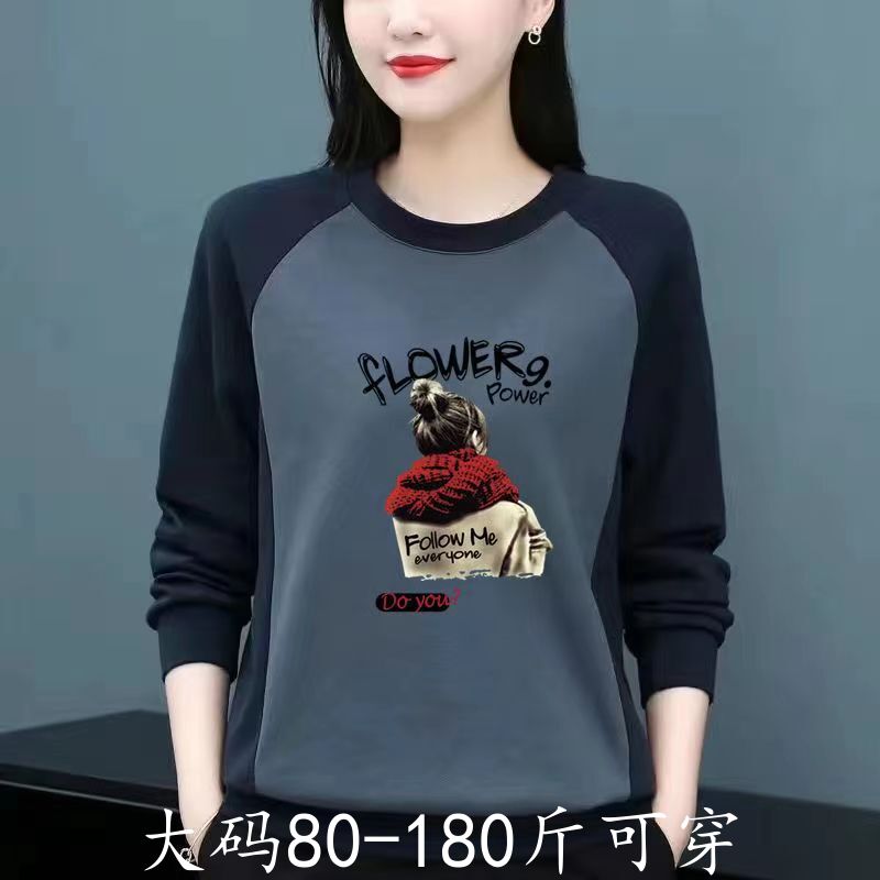 全棉打底衫 印花拼接长袖 潮A 圆领卫衣女春秋大码 100%纯棉清仓捡漏