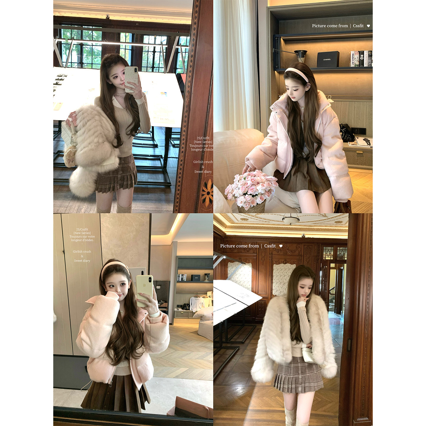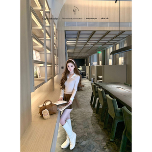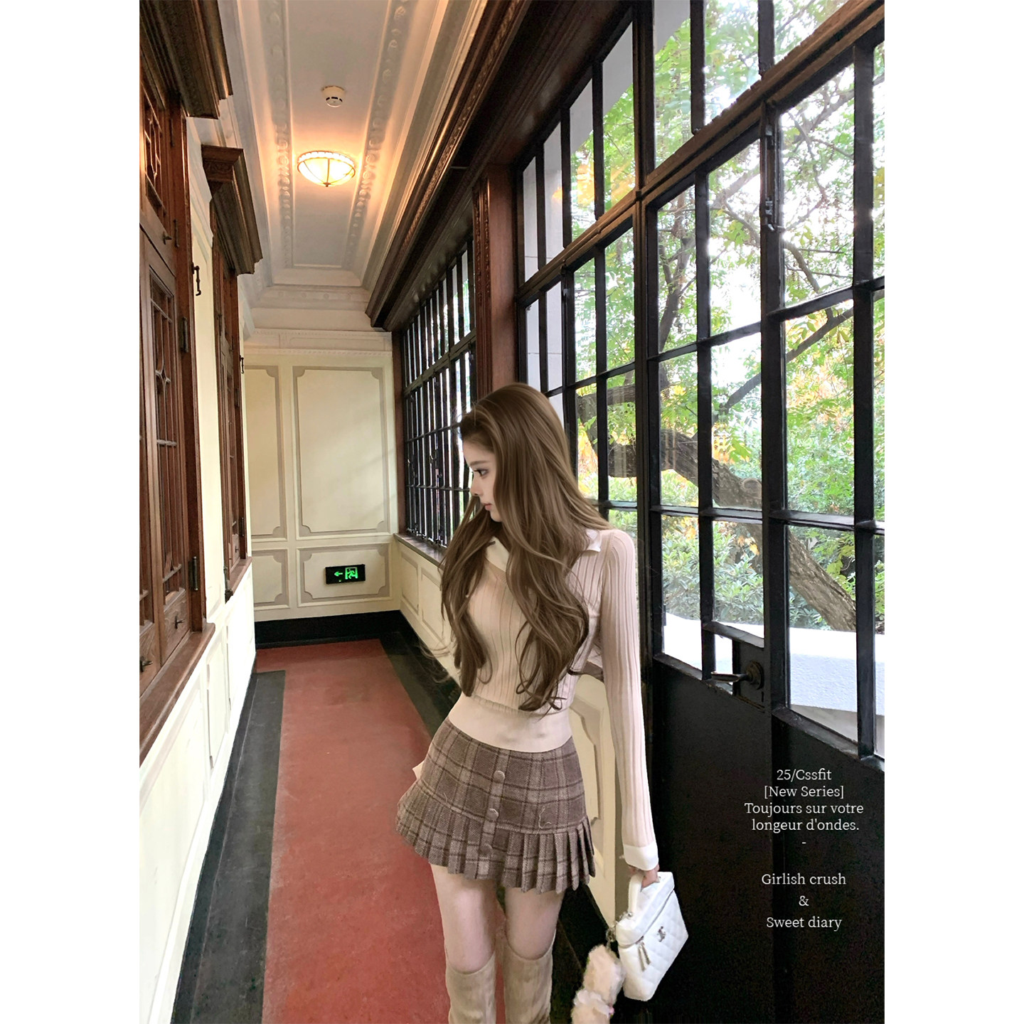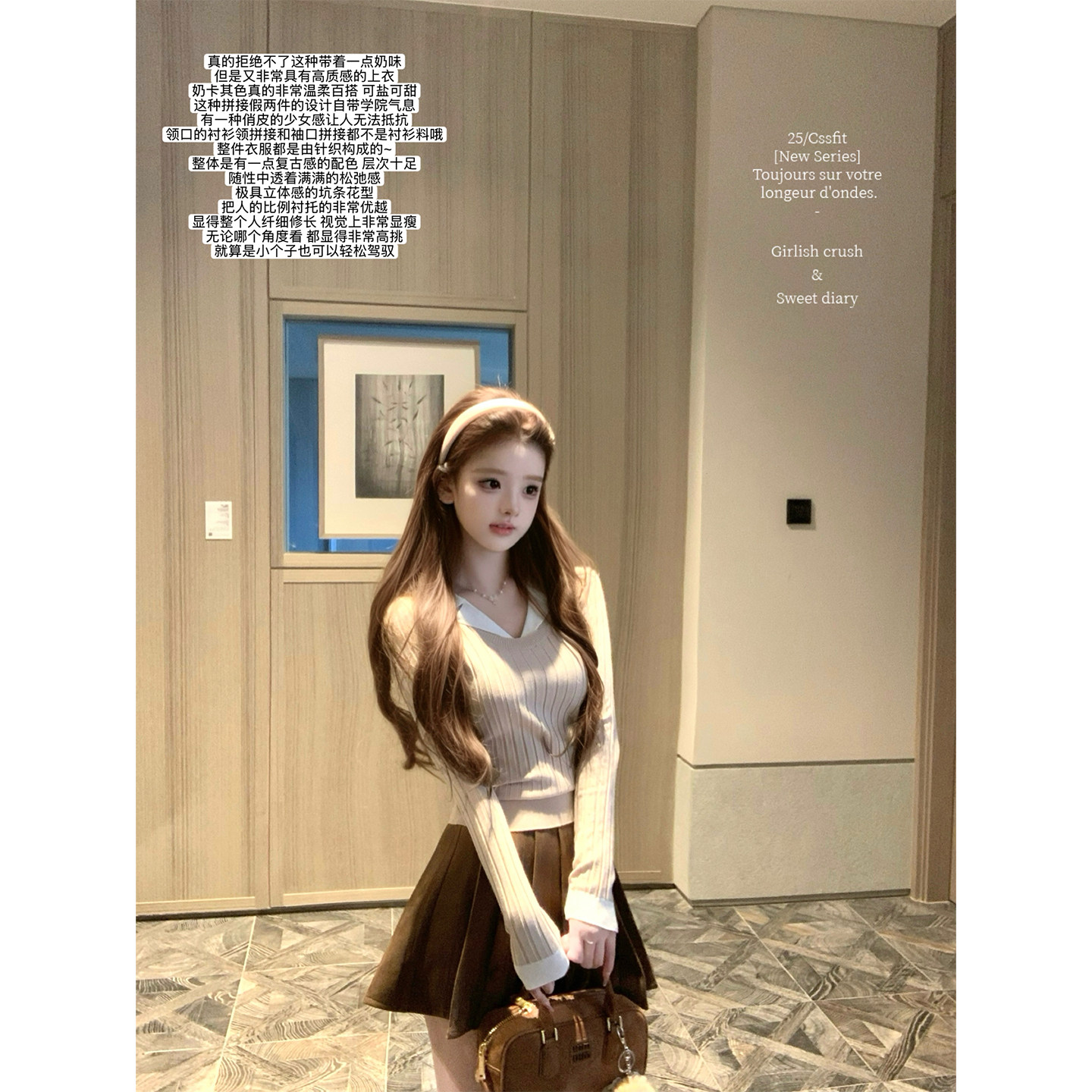 麂皮百褶裙套装 迟伞伞25 浅卡其假两件坑条针织衫 可露丽拿铁