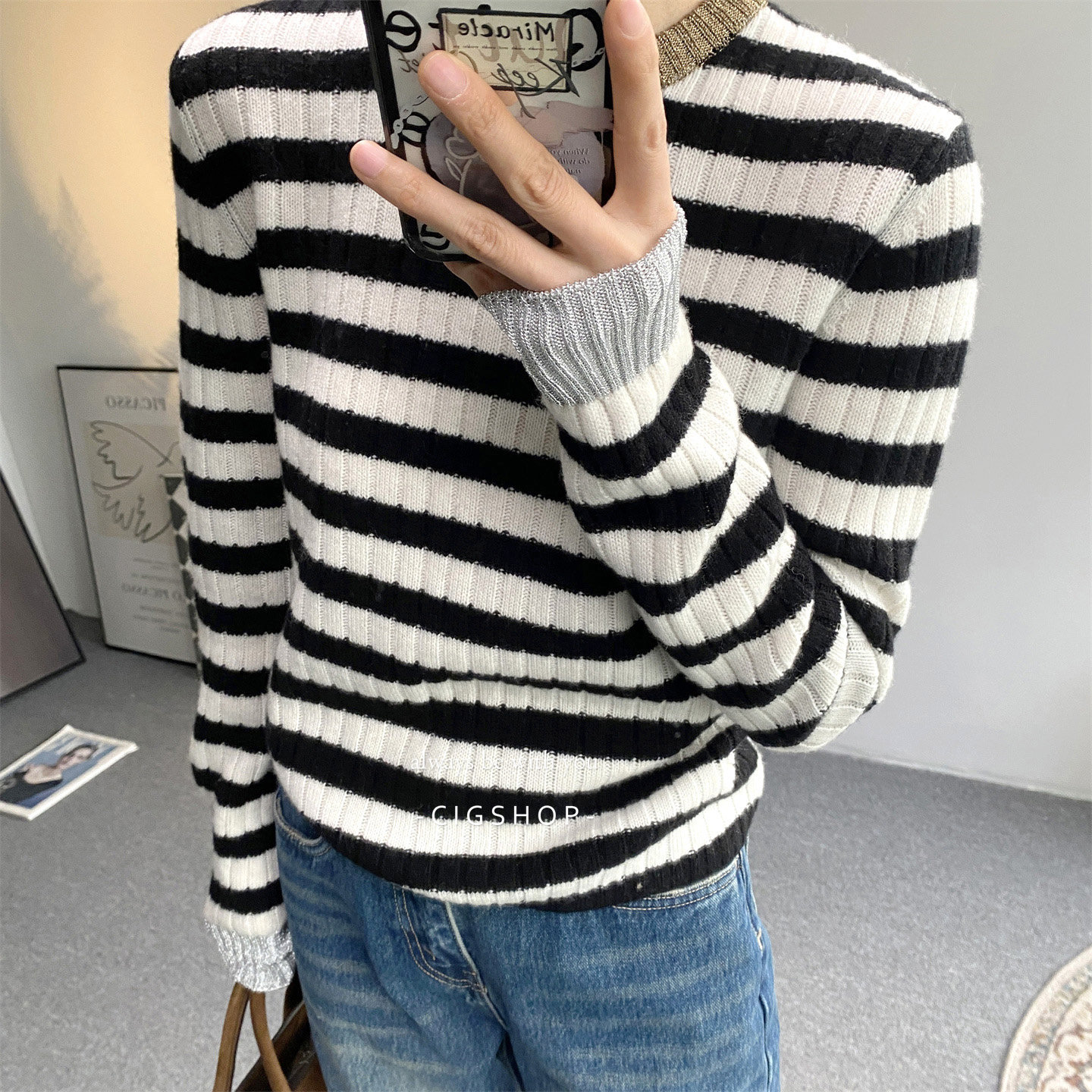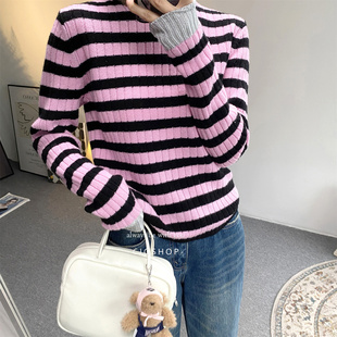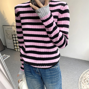心思精致 25秋冬撞色金银丝圆领羊毛羊绒显瘦坑条打底上衣针织衫
