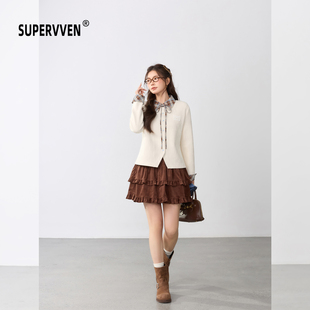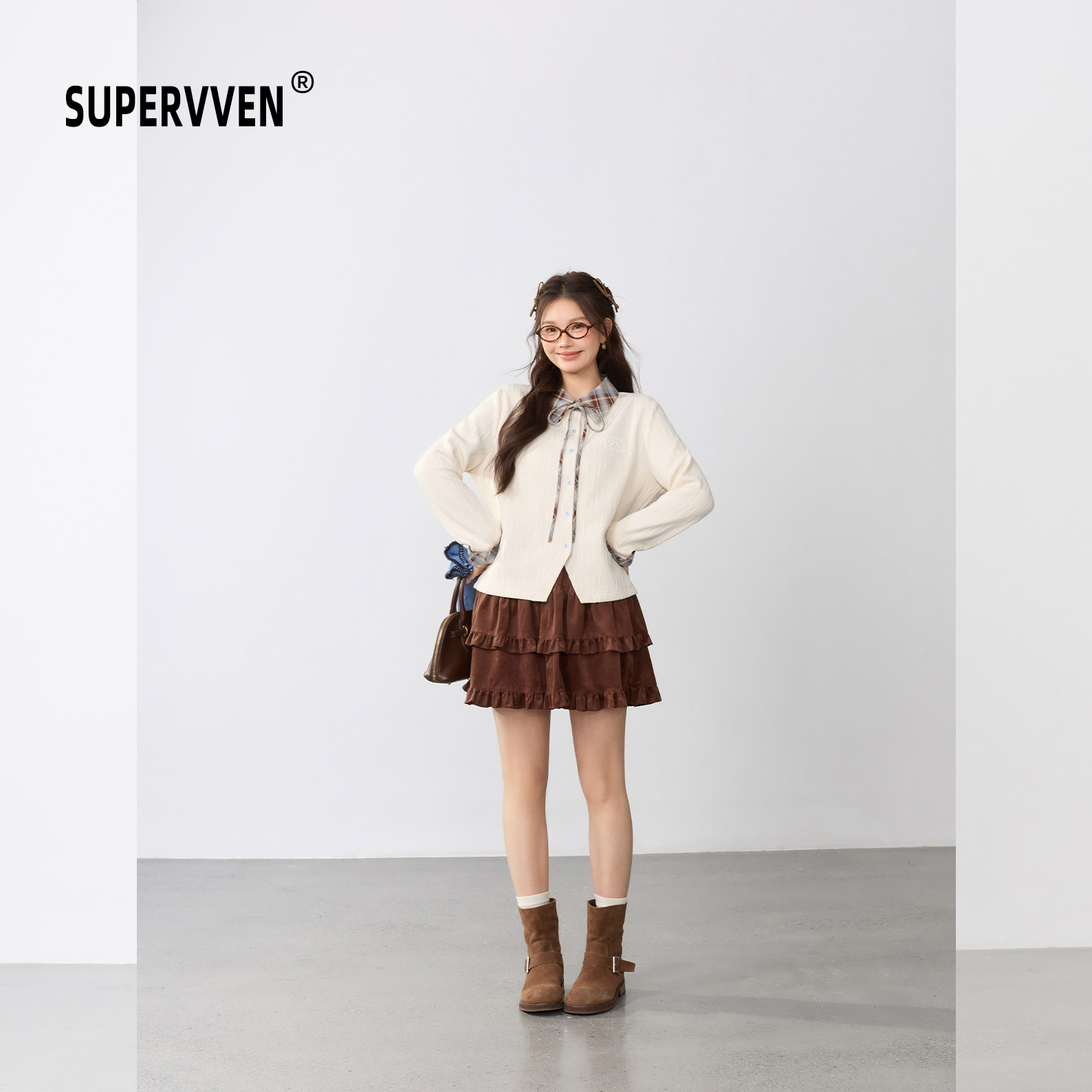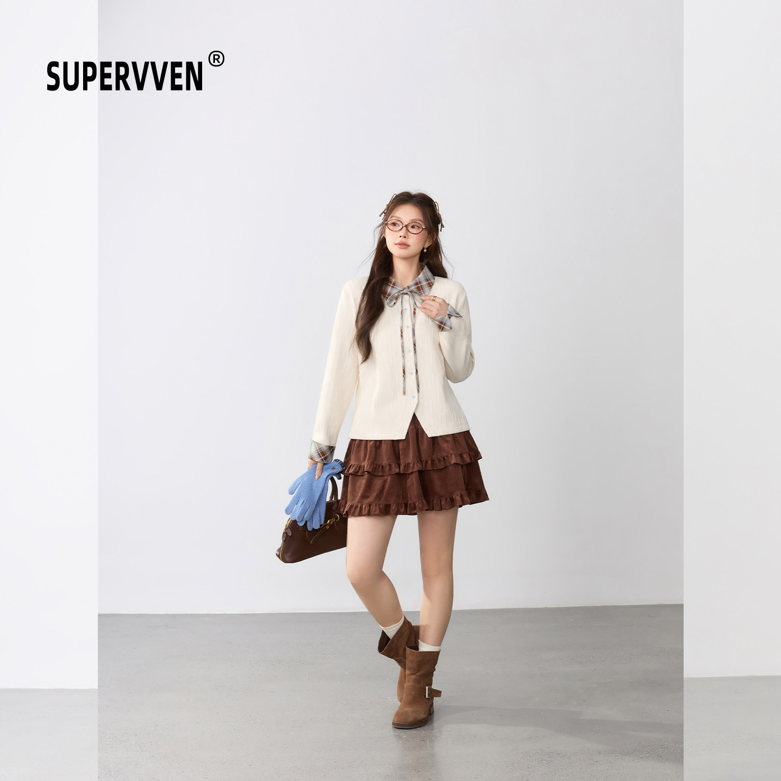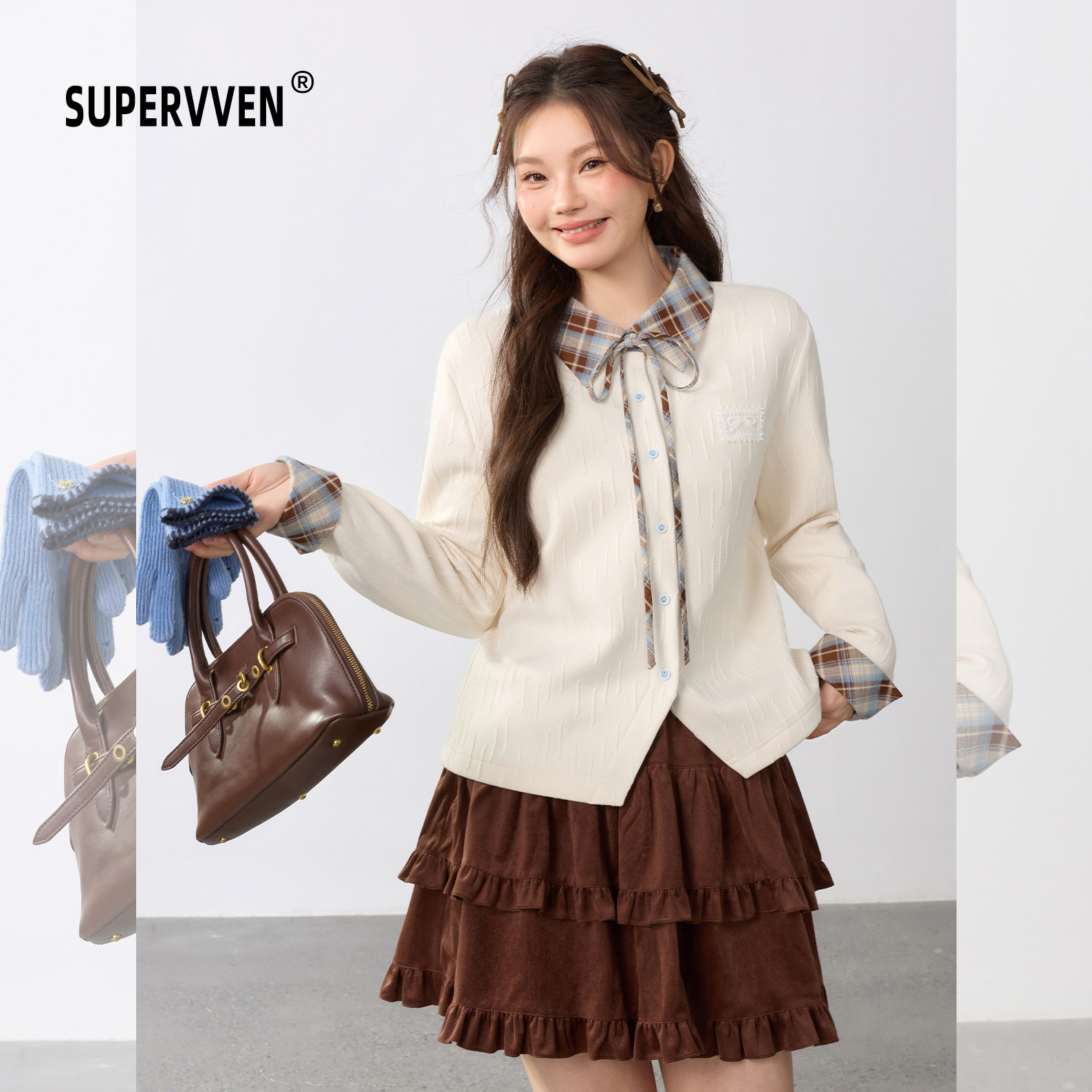 微胖大码 超级文 山红涧碧立体肌理格纹拼接系带减龄显瘦针织小衫