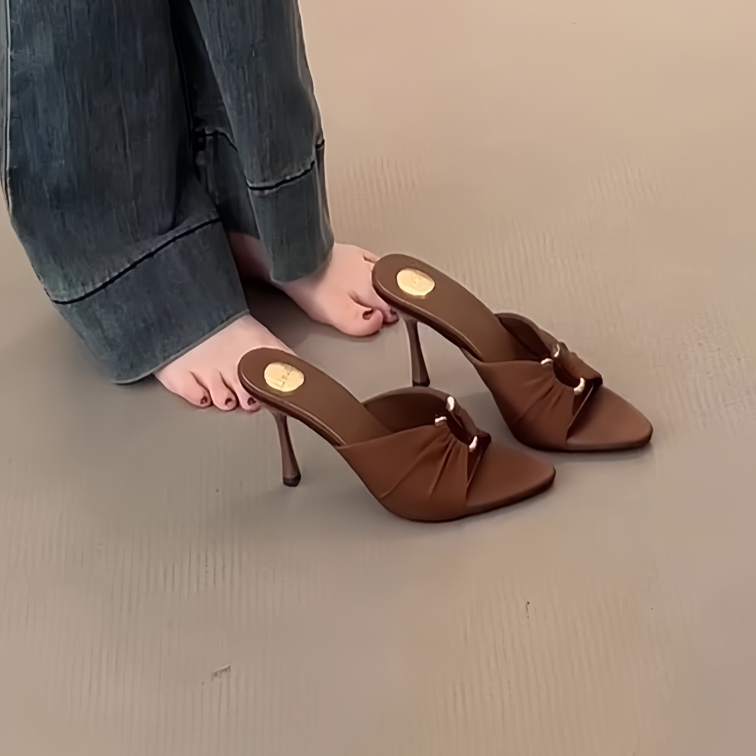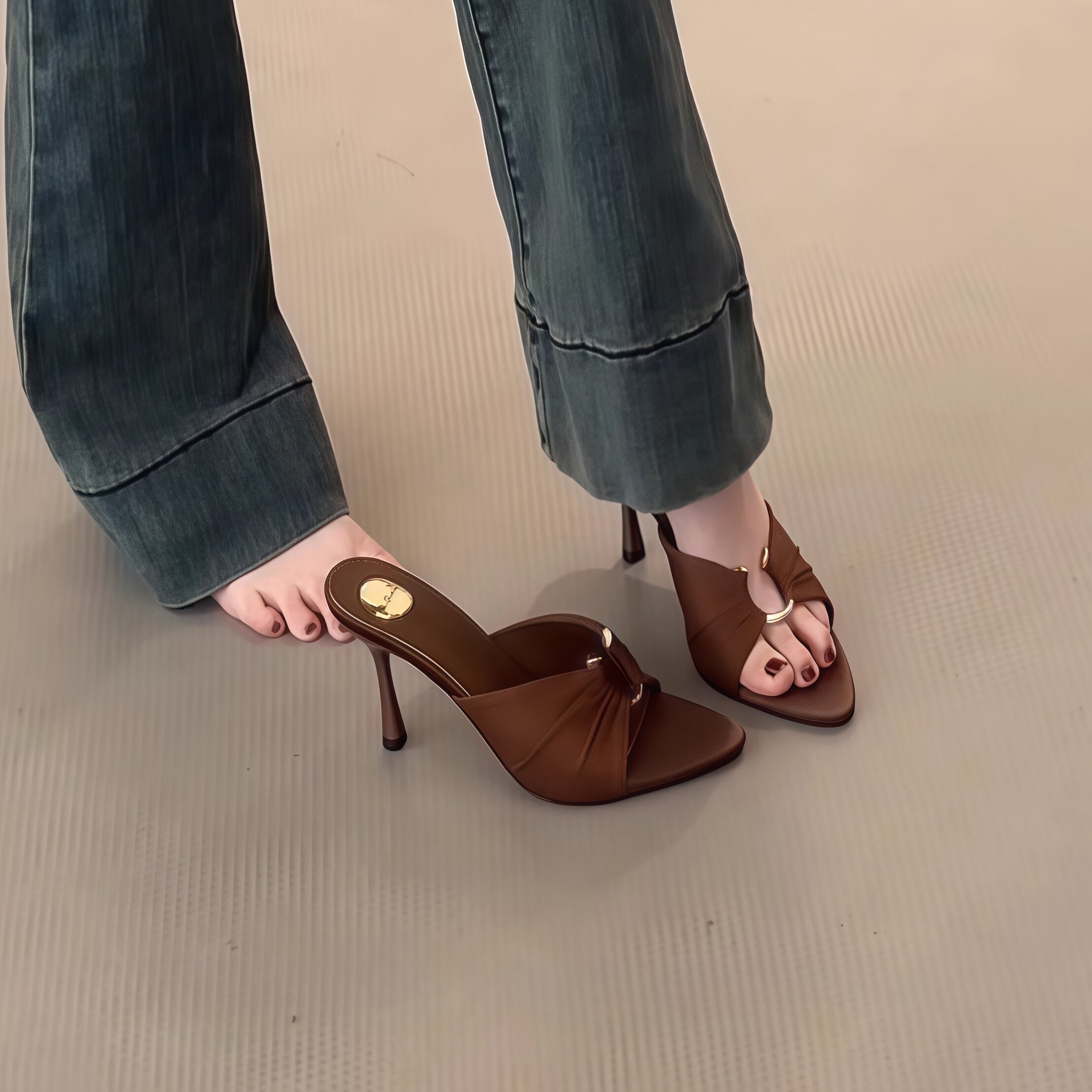 露趾性感凉鞋 轻熟风细跟一字拖鞋 女春夏新款 尖头金属扣褶皱高跟鞋