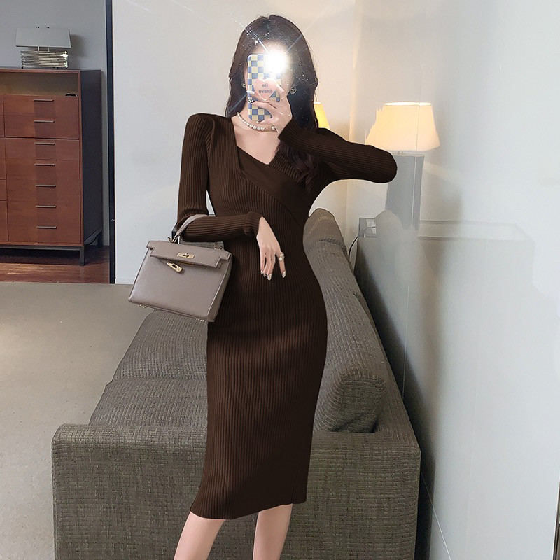 秋冬配大衣内搭毛衣裙女气质显瘦打底针织连衣裙黑色长袖 长裙 修身