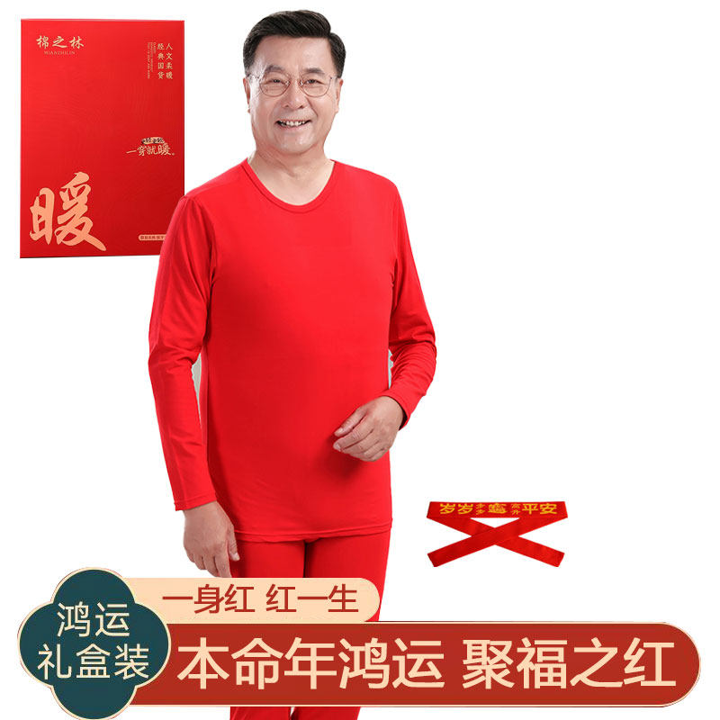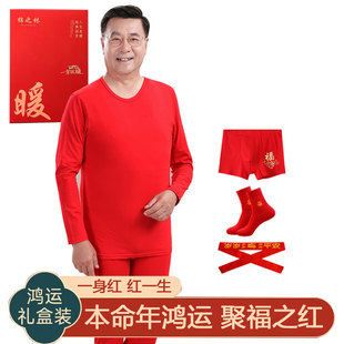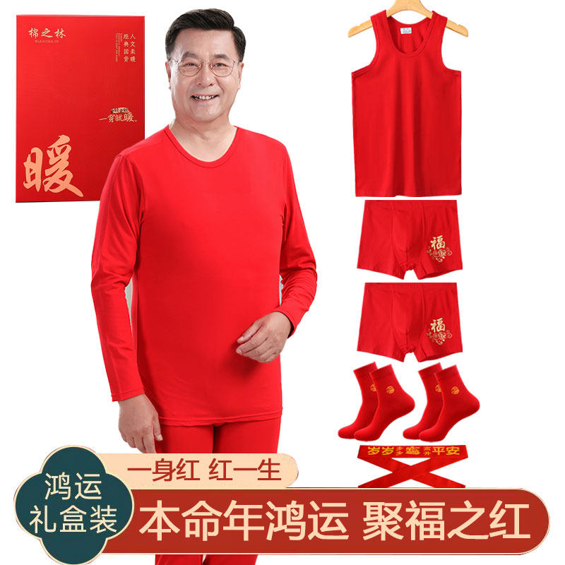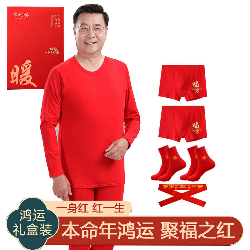 男大红色本命年鸿运打底 莱卡棉中老年人内衣套装 礼盒装 红秋衣秋裤