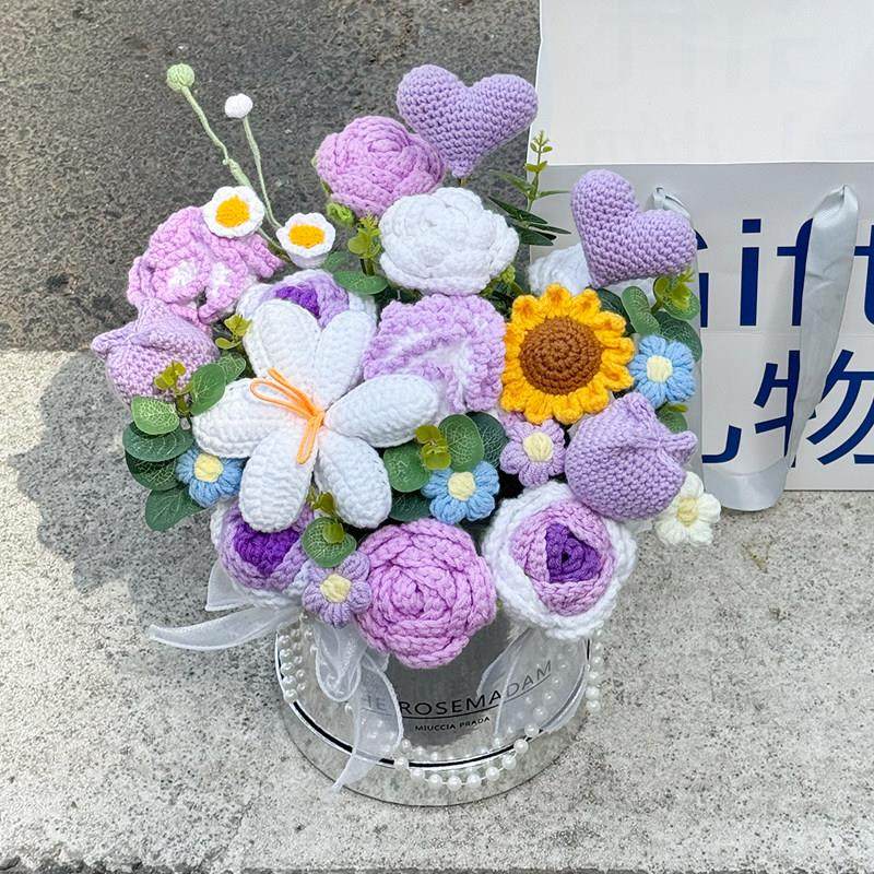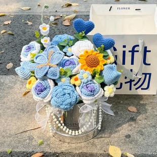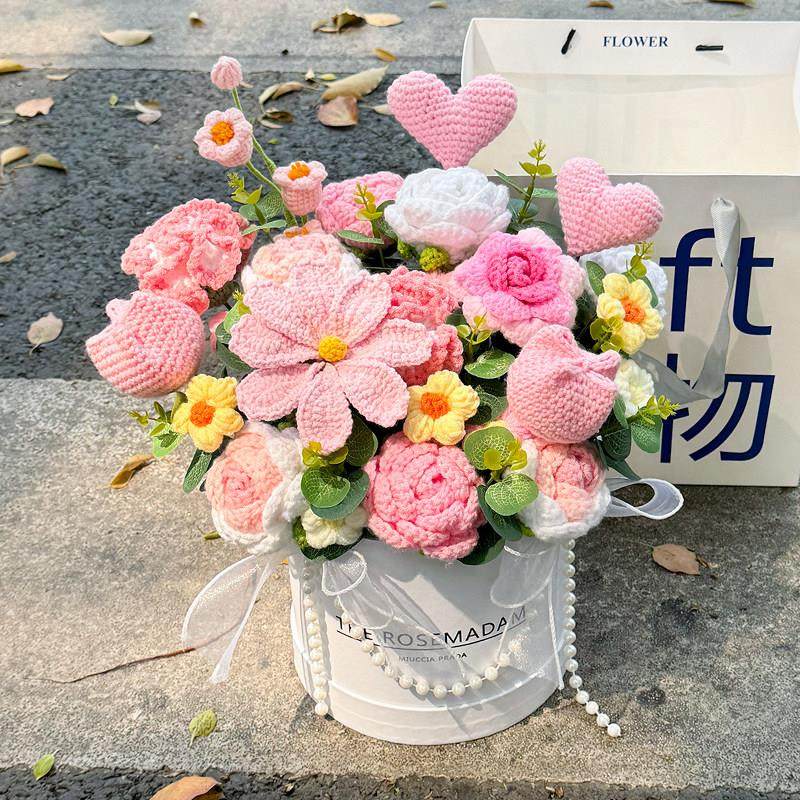 情人节创意针织毛线混搭玫瑰郁金香彷真花抱抱桶女生日礼物护士节