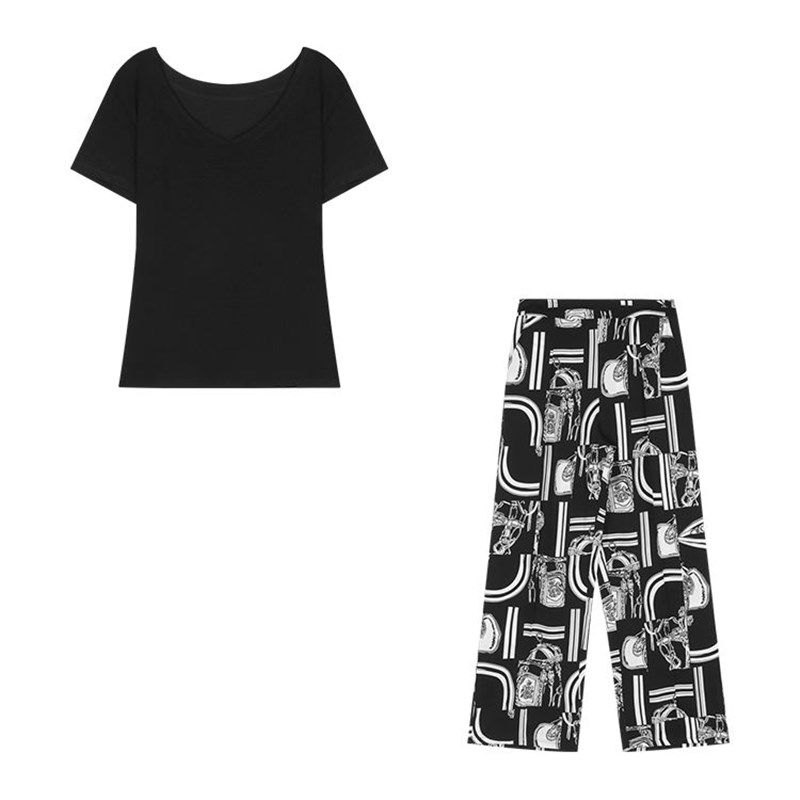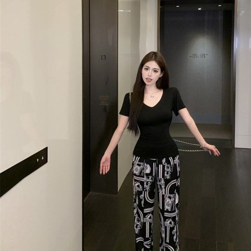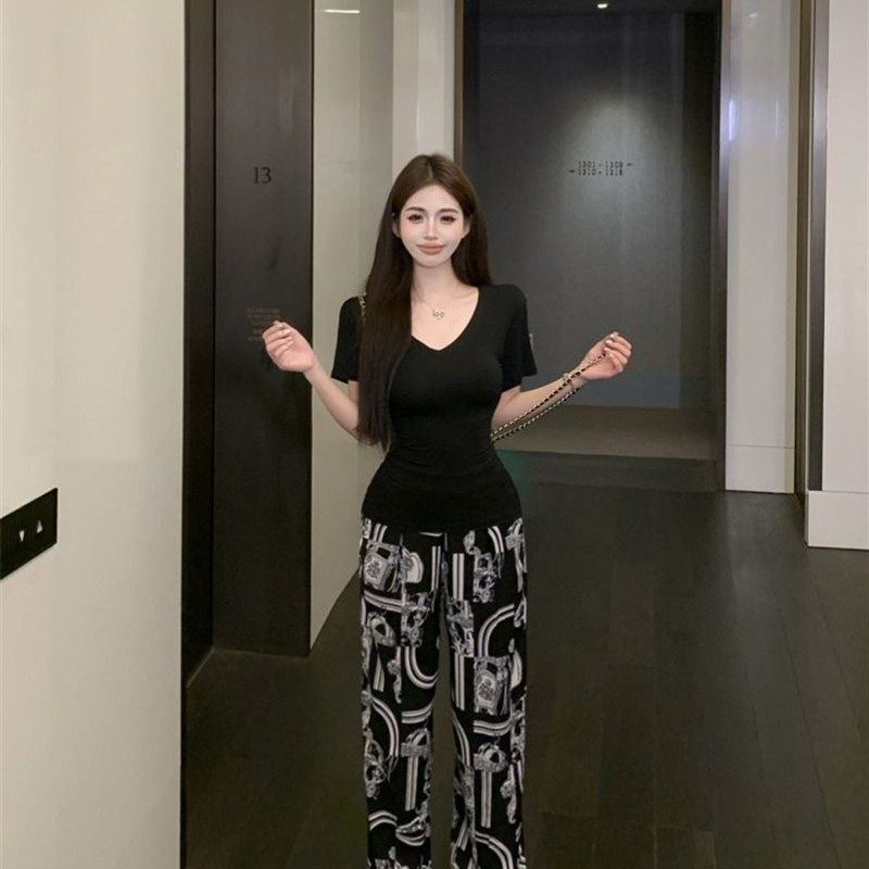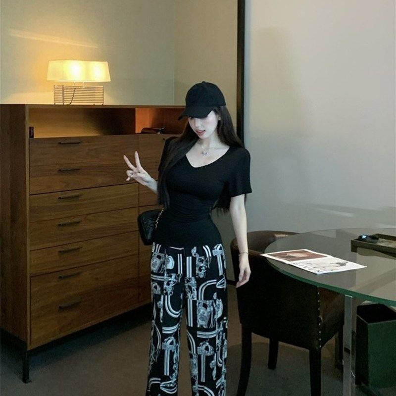 阔腿拖地长裤 仿醋酸缎面印花休闲裤 子设计感窄版 高腰直筒裤 女夏季