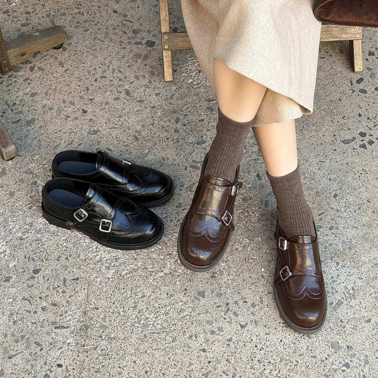 粗跟春款 复古黑色乐福鞋 女金属扣小皮鞋 英伦风布洛克雕花粗跟单鞋