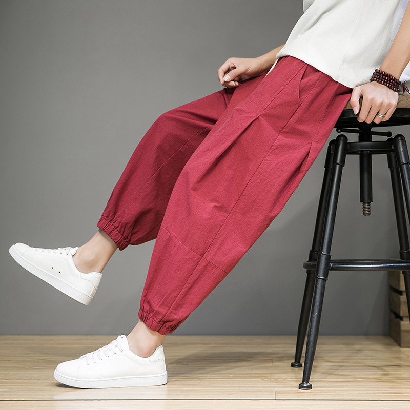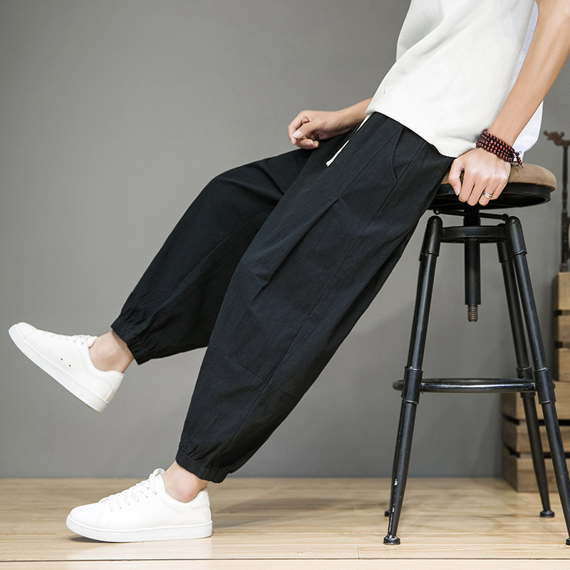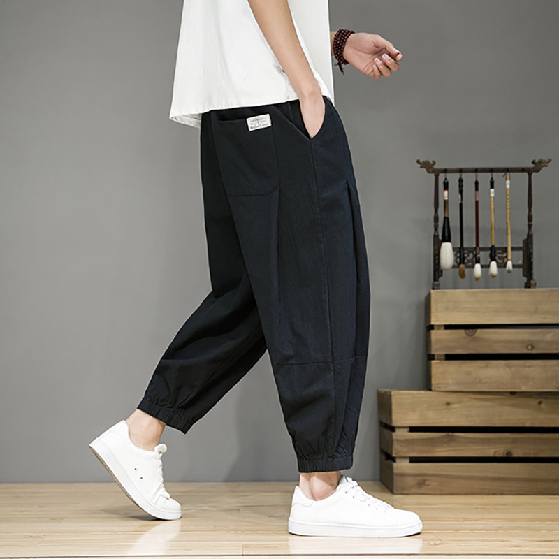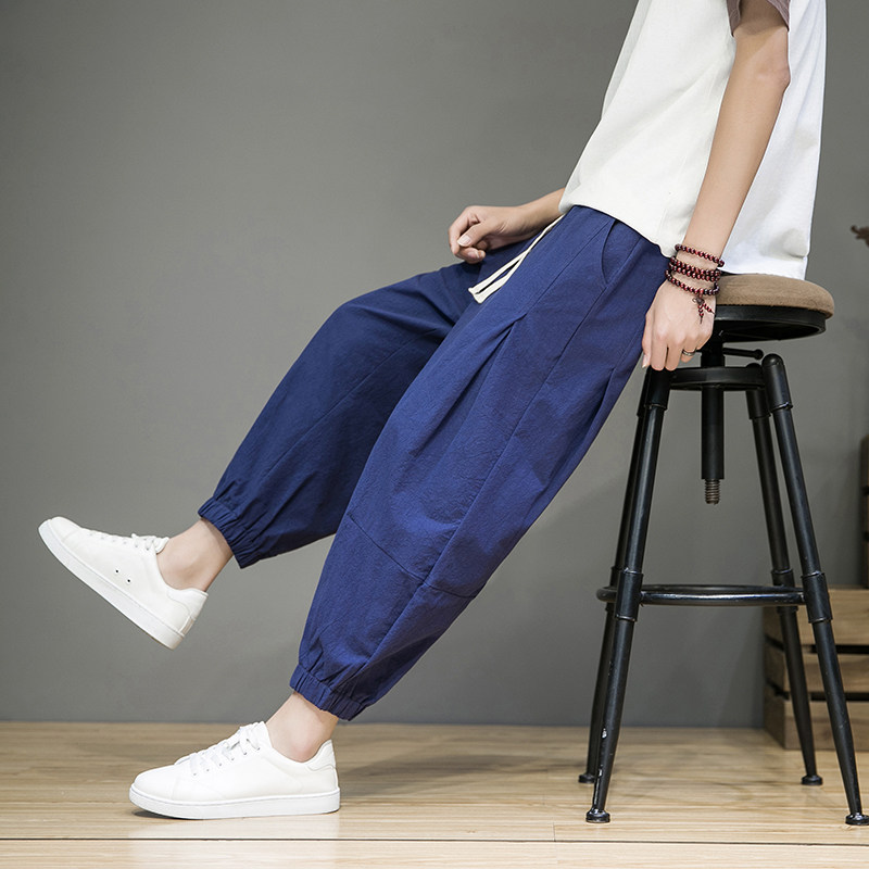 复古束脚灯笼裤 宽松八分裤 夏大码 亚麻裤 子 锥形萝卜裤 棉麻裤 男夏季