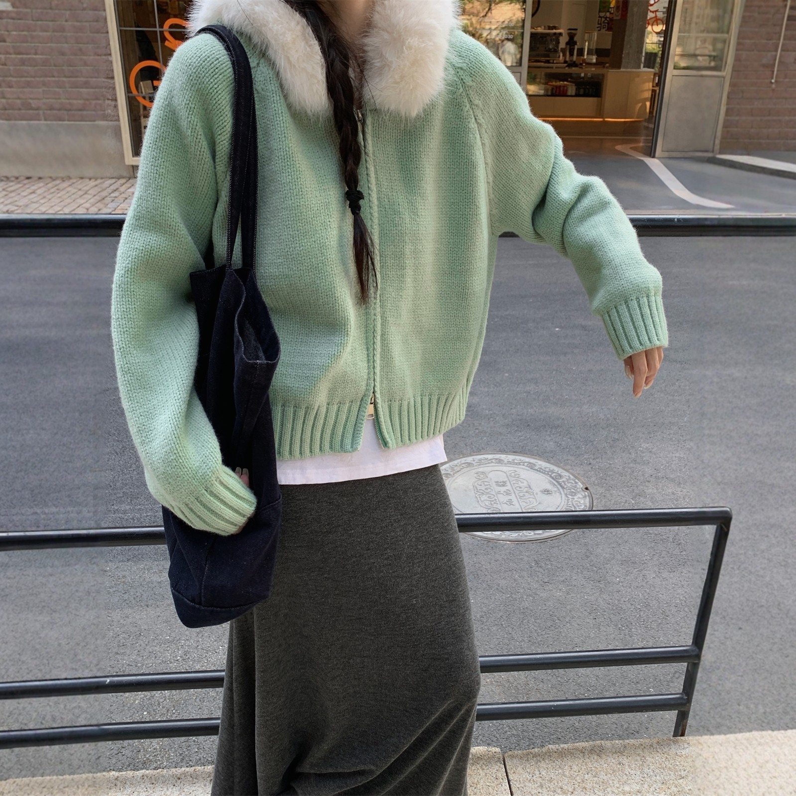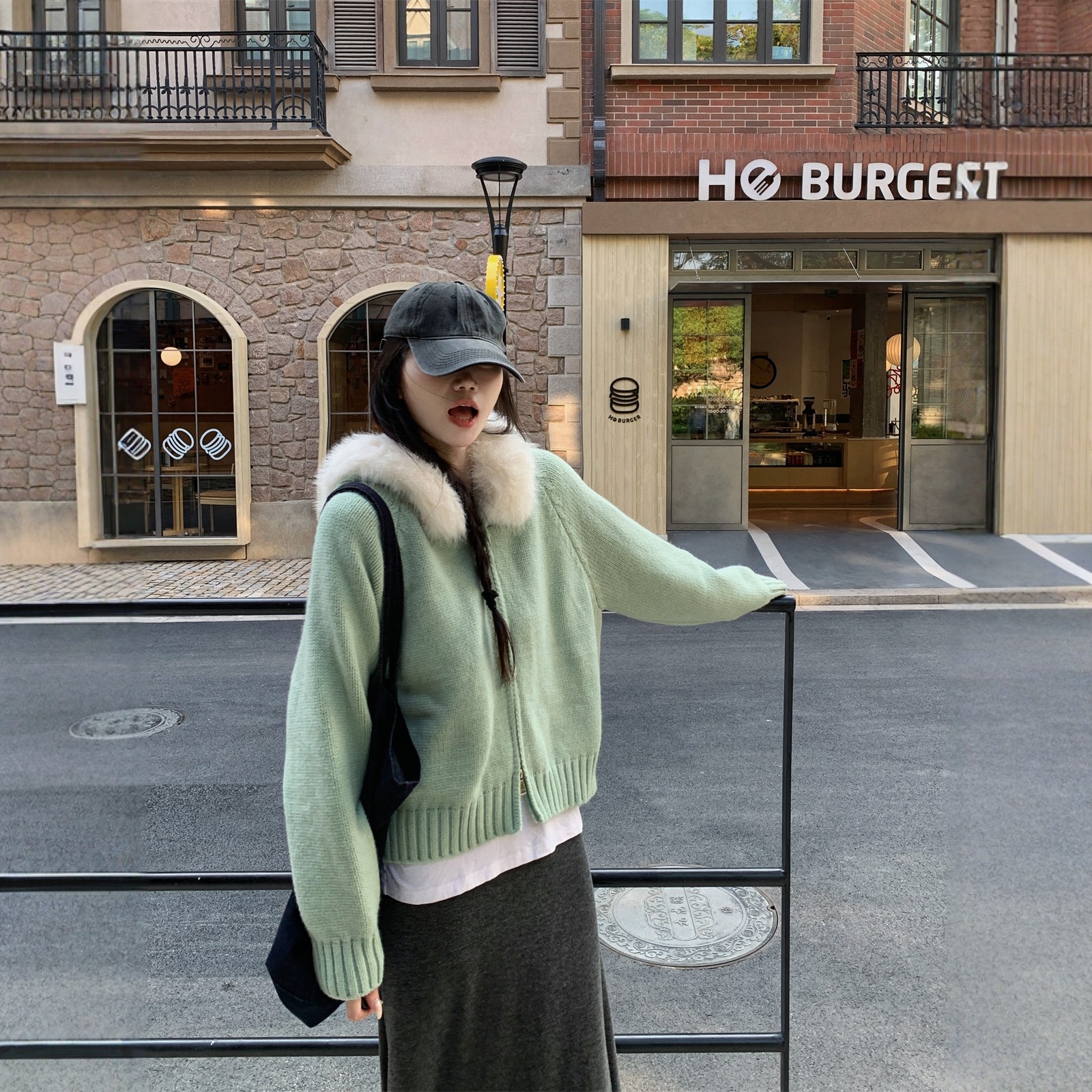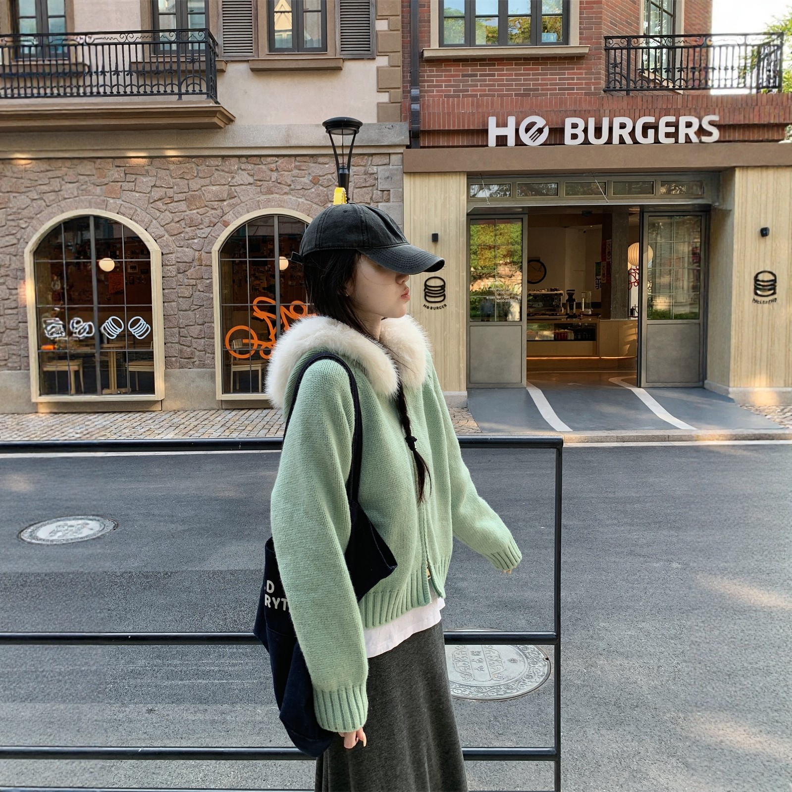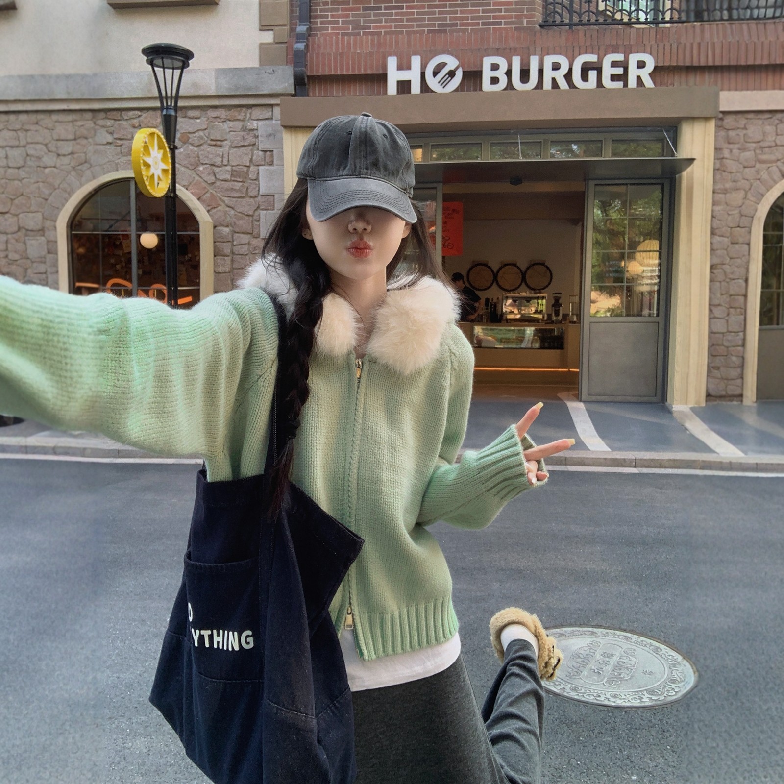 温柔慵懒风毛领针织开衫 女可拆卸毛衣外套氛围感绿色韩系拉链上衣