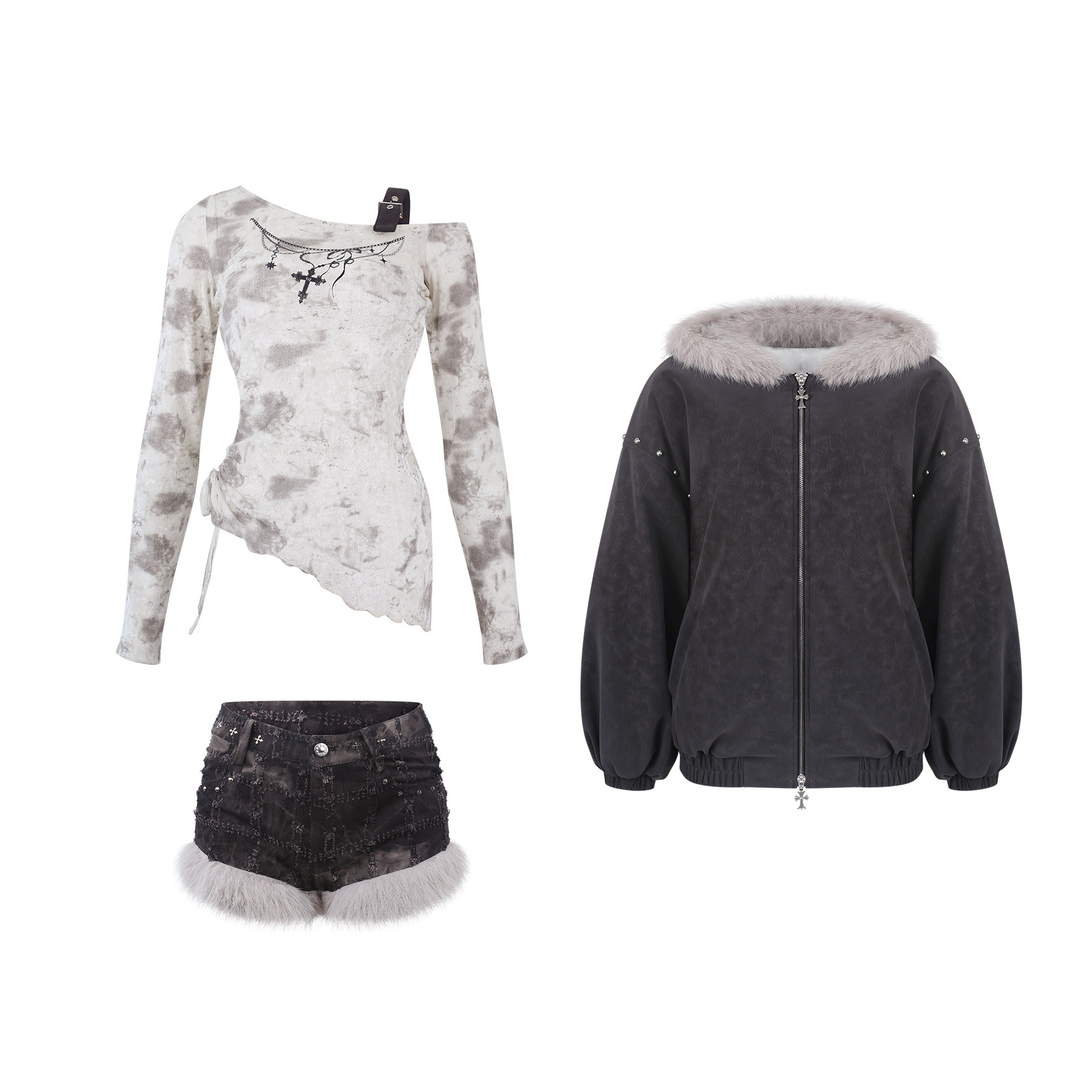 轻亚系 灰牛仔短裤 暗夜禁区 深灰外套 米色印花上衣 少女椰子