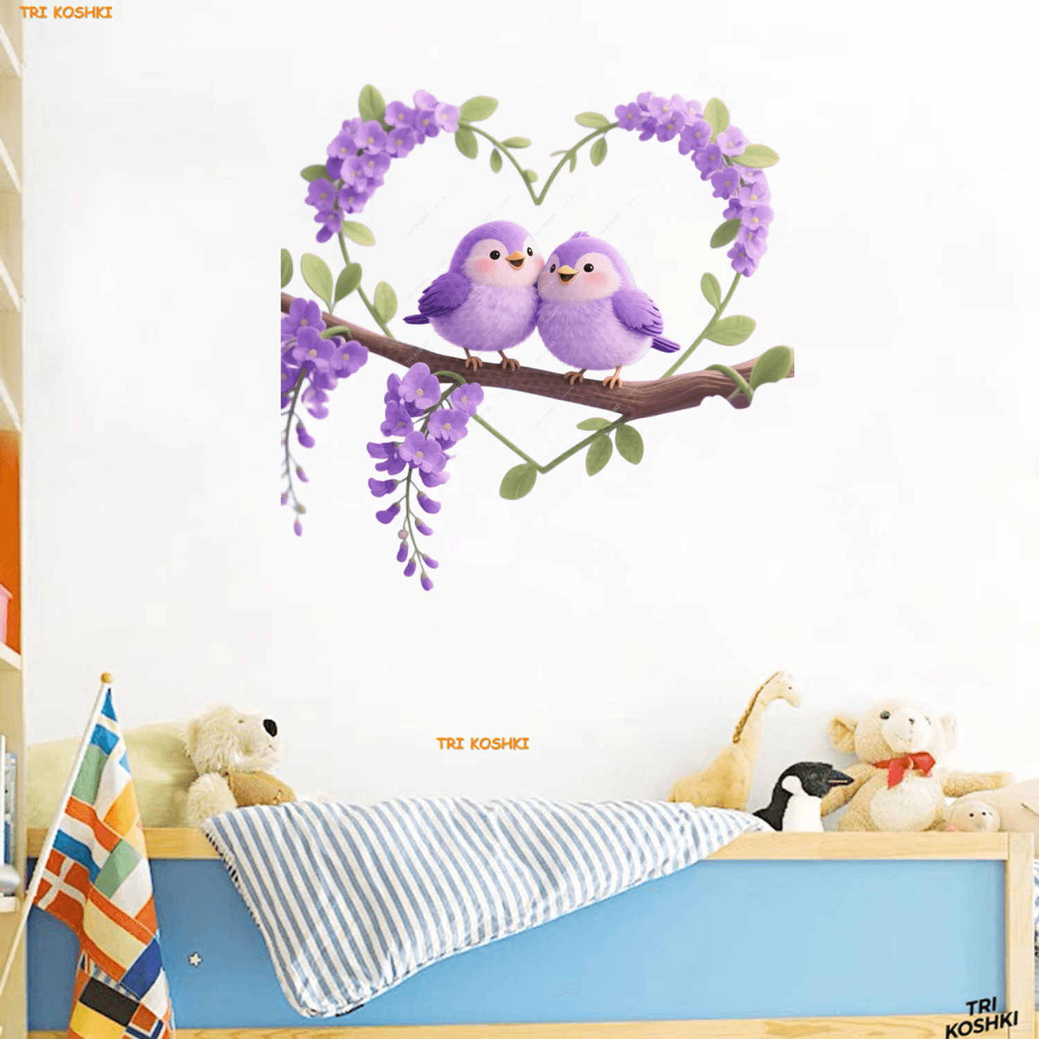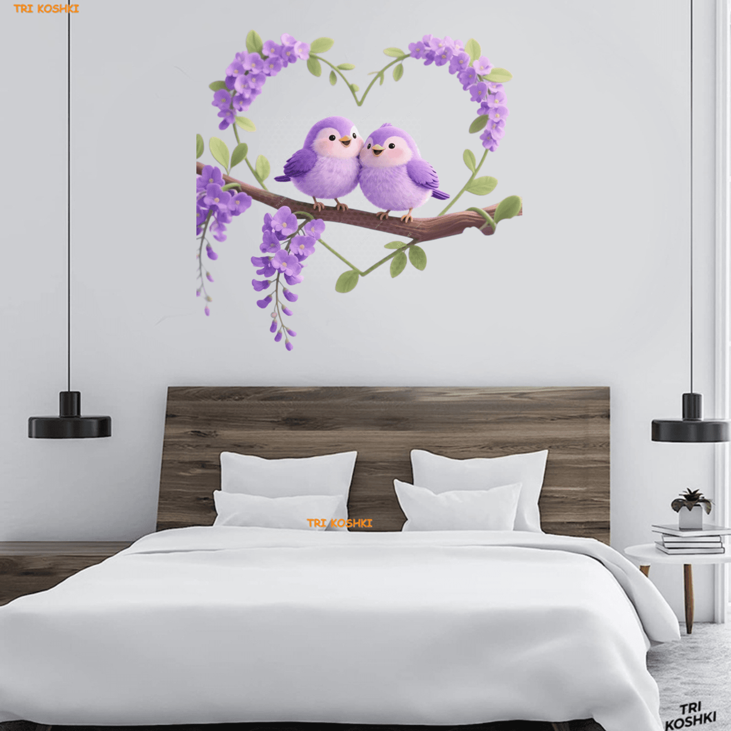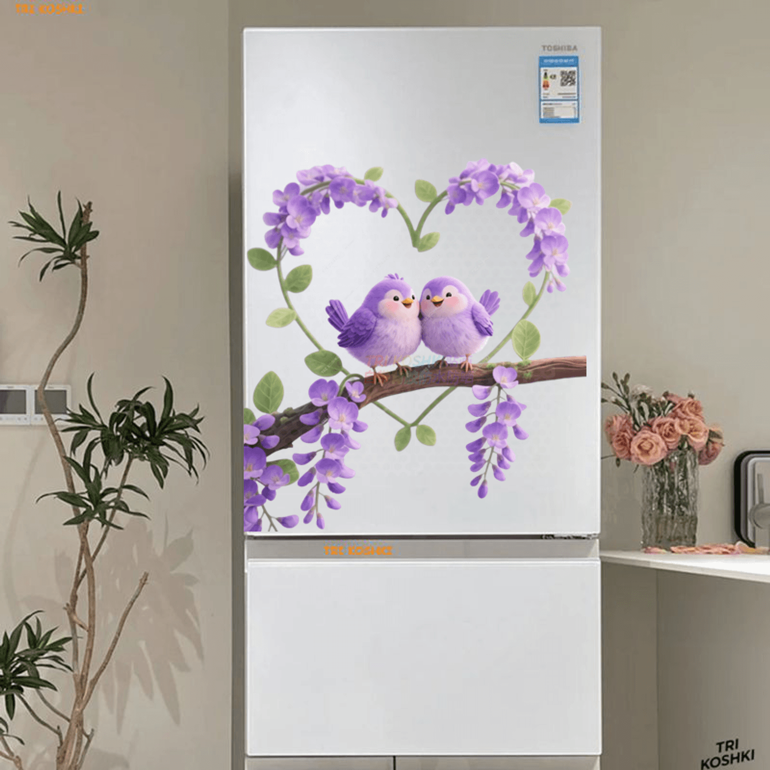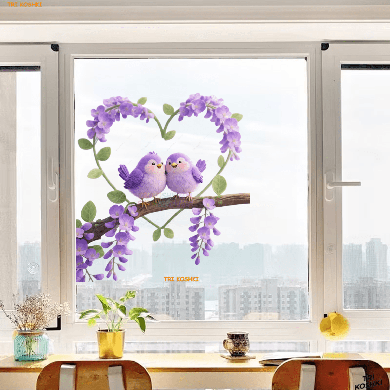紫藤花上 饰爱心墙贴冰箱玻璃门 小鸟透明贴纸客厅卧室床头墙上装