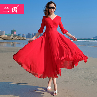 三亚红色沙滩裙短袖 连衣裙波西米亚长裙巴厘岛海边度假裙子女 长款