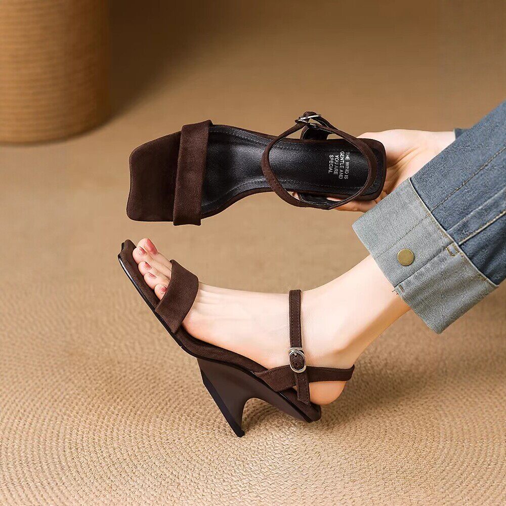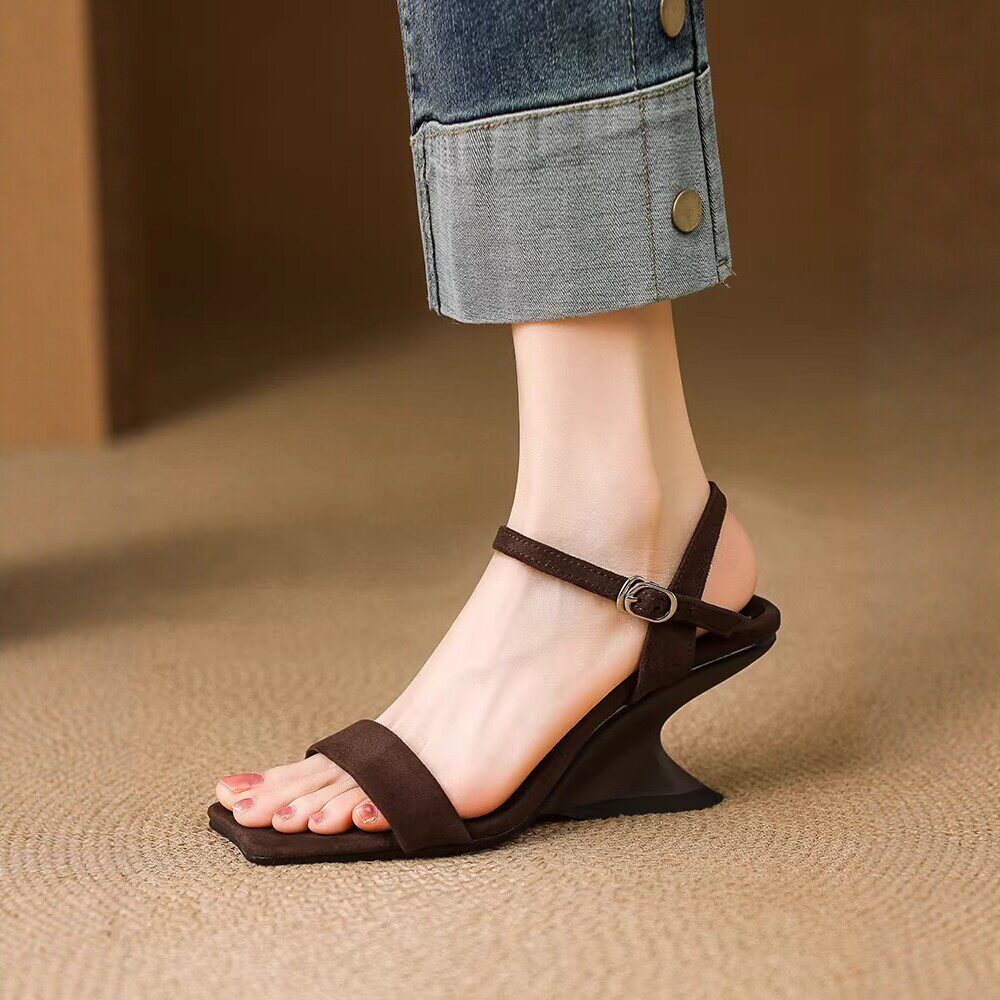 异形坡跟露趾凉拖罗马鞋 法式 2026年新款 女夏季 软皮一字带高跟凉鞋