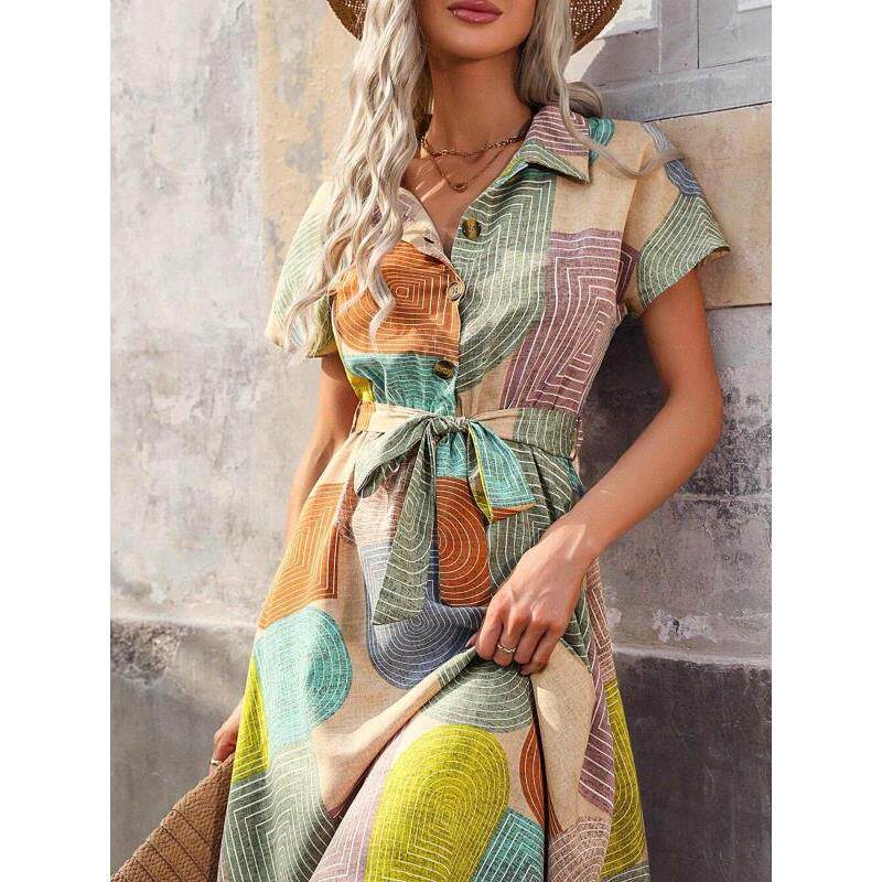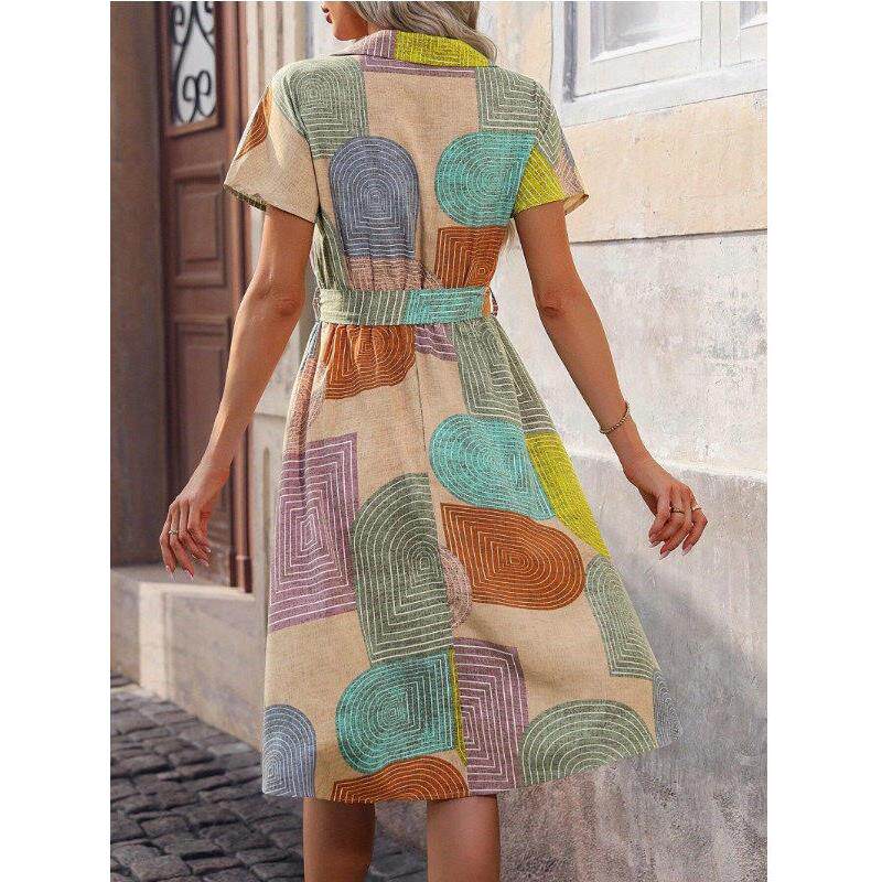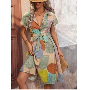 休闲衬衫 夏季 翻领排扣几何印花短袖 通勤OL时尚 裙DRESS 新款