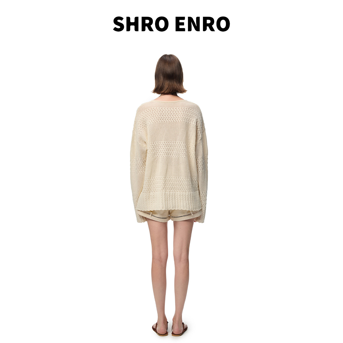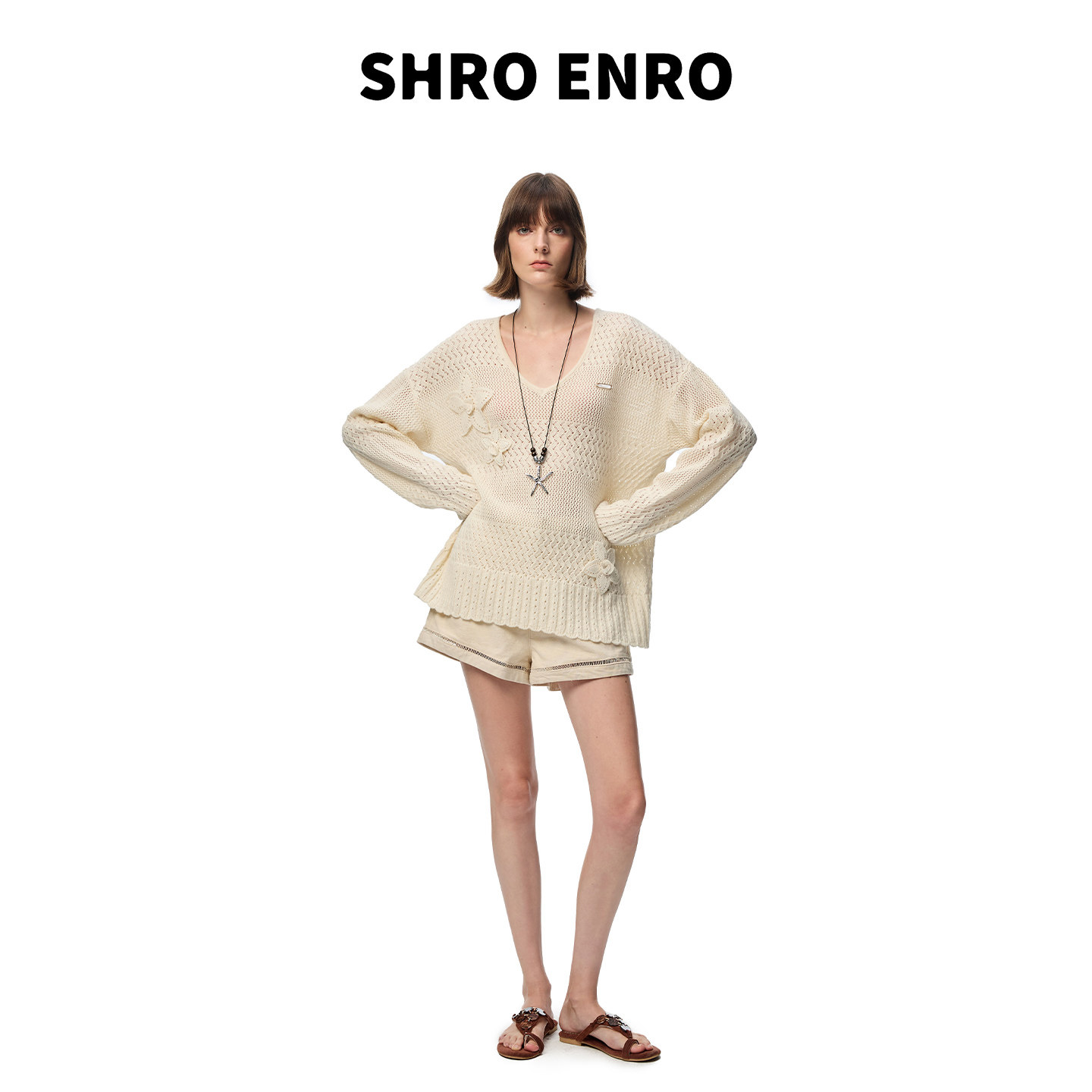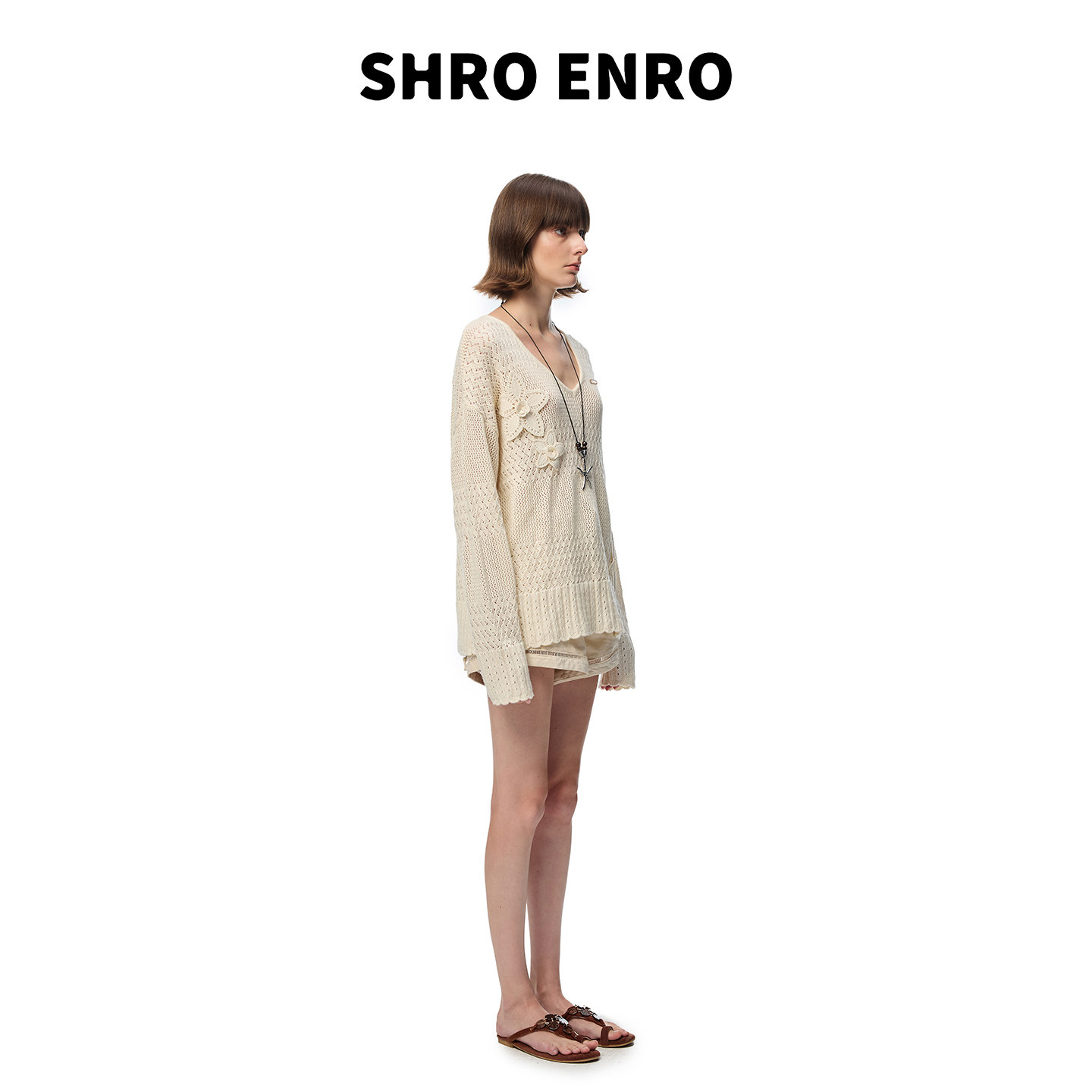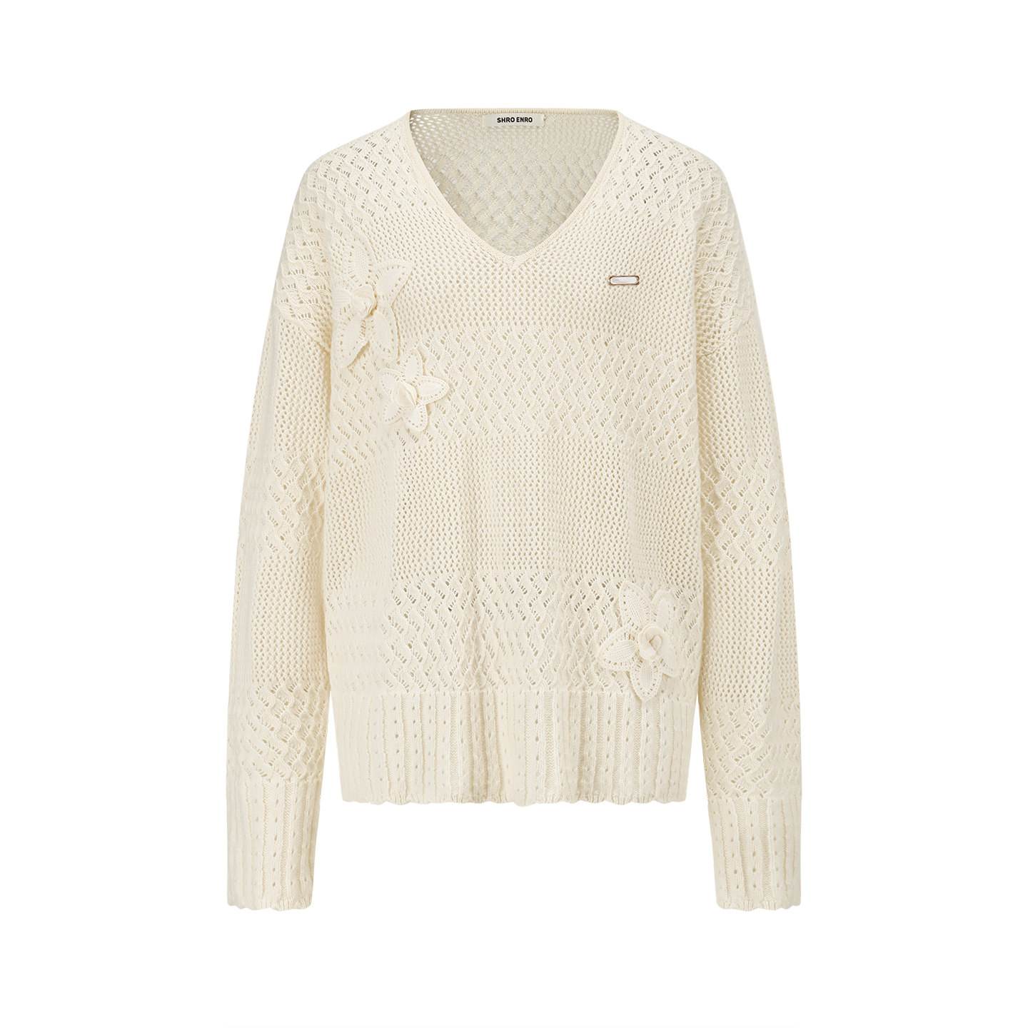 新款 2026年春季 立体花朵V领高级感镂空针织毛衣女上衣 ENRO SHRO