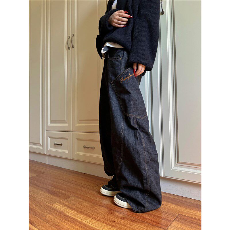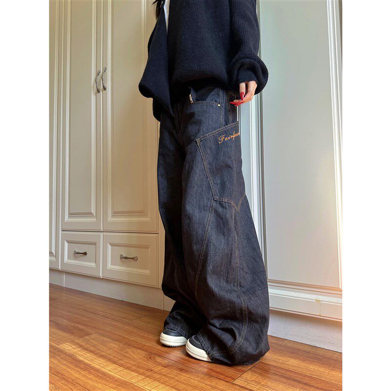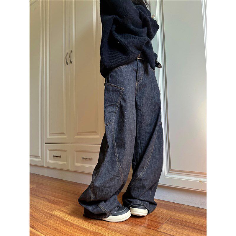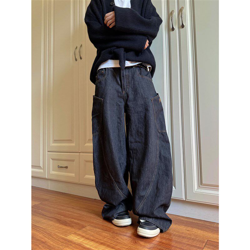 地阔腿裤 F383 男女拖款 复古设计感大口袋弯刀牛仔裤 子潮 2024美式