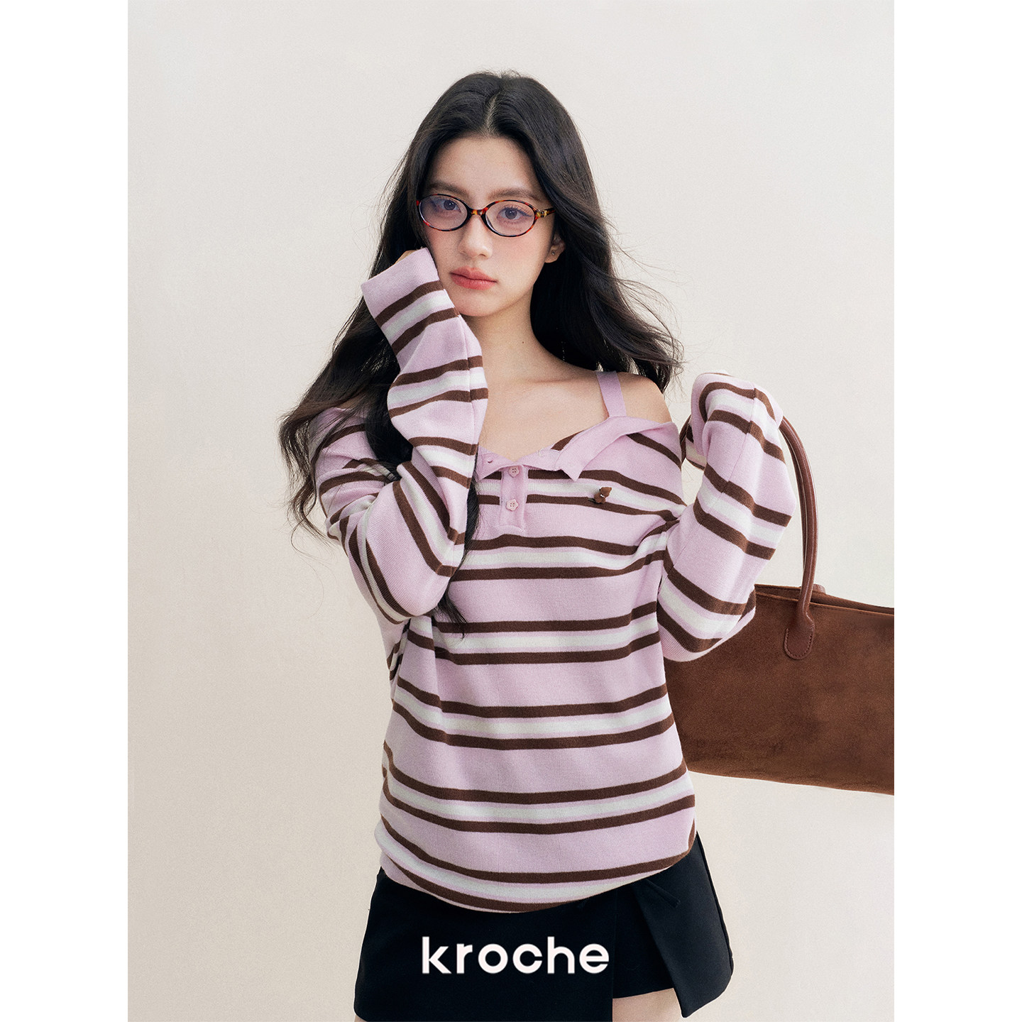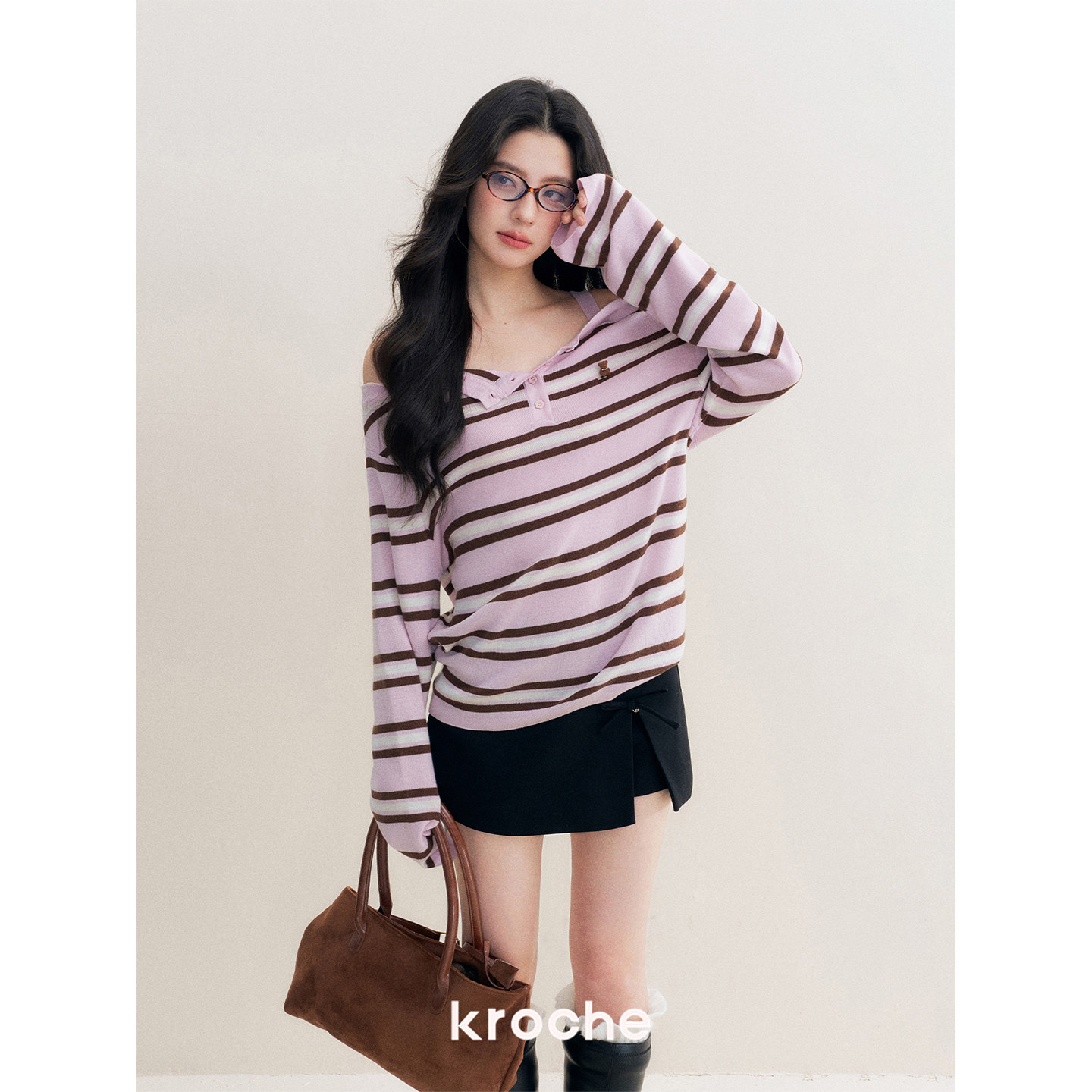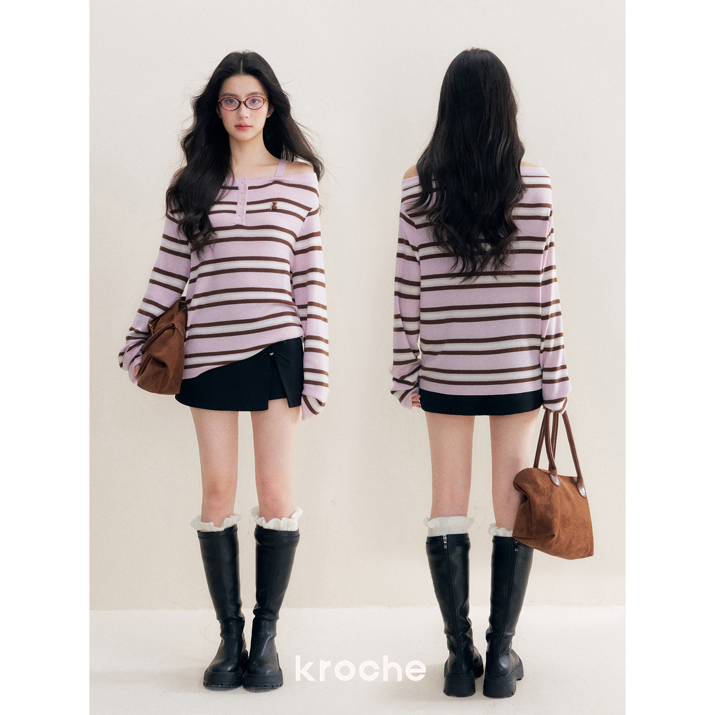羊毛混纺撞色一字肩条纹针织衫 肖燕同款 植绒小熊标 25aw Kroche