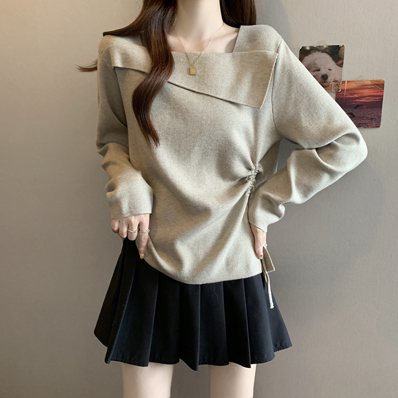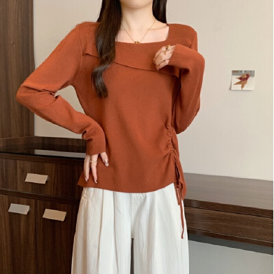 上衣 女秋冬胖mm显瘦抽绳设计内搭打底衫 大码 不规则一字肩毛针织衫