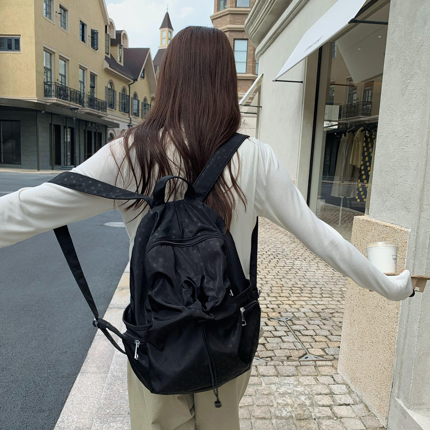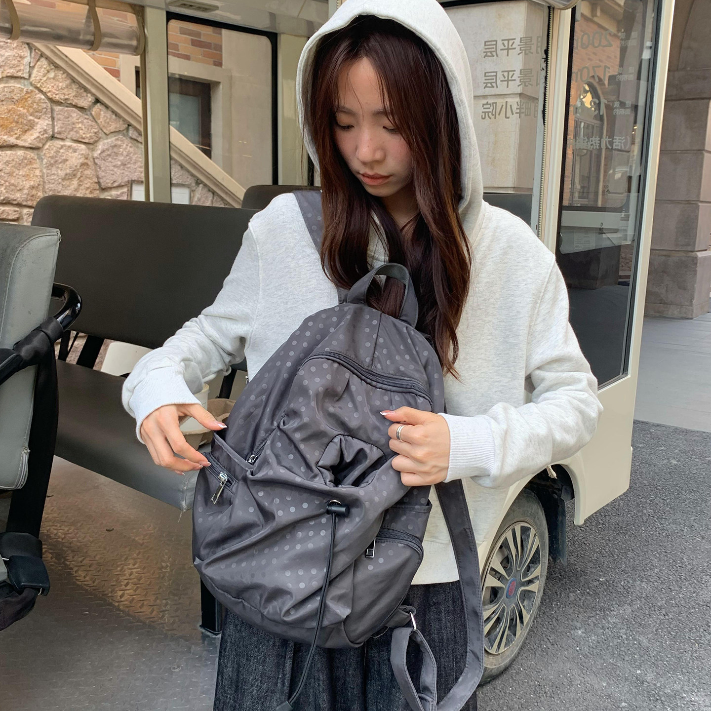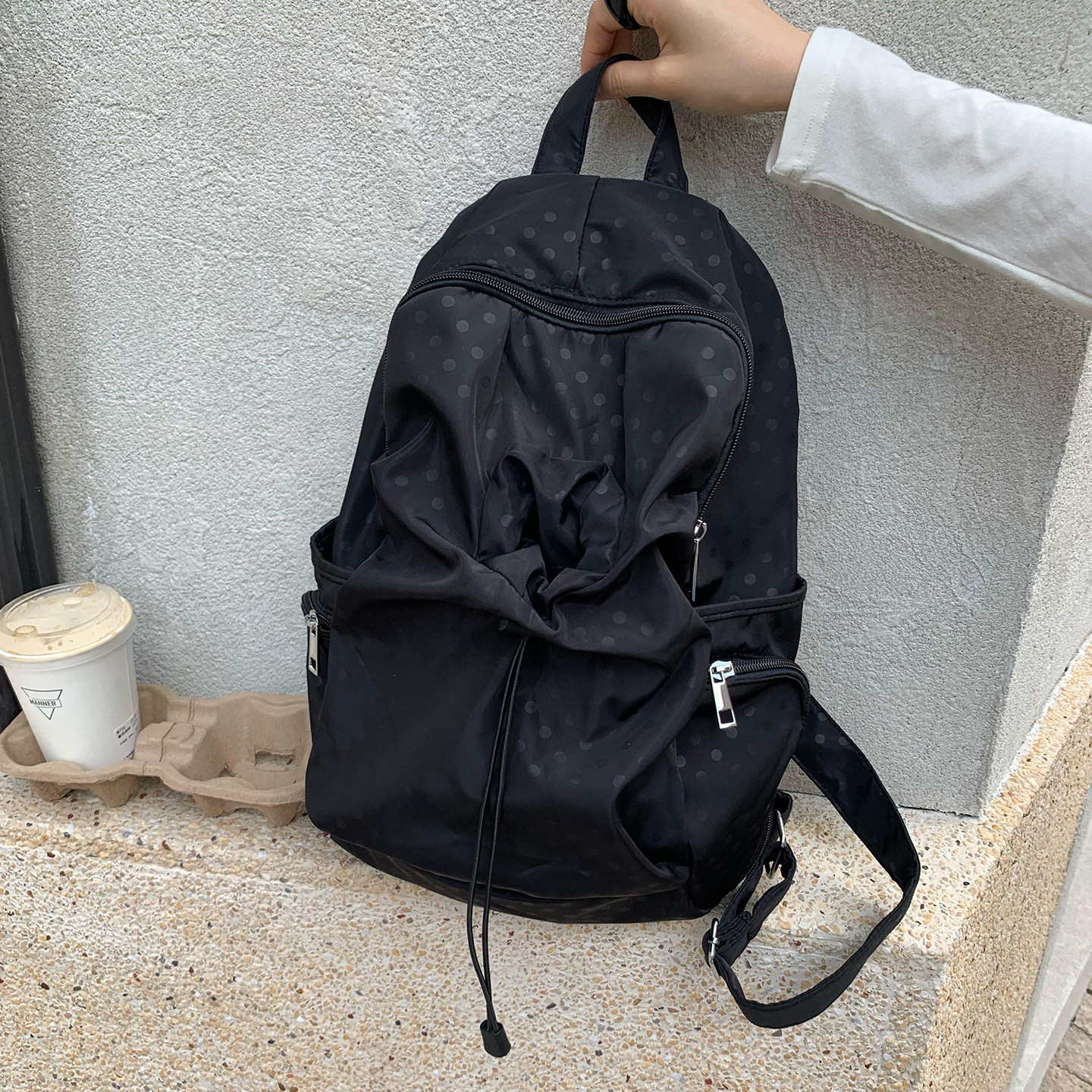 Unique blue原创波点多口袋书包女休闲学院风背包高中学生双肩包