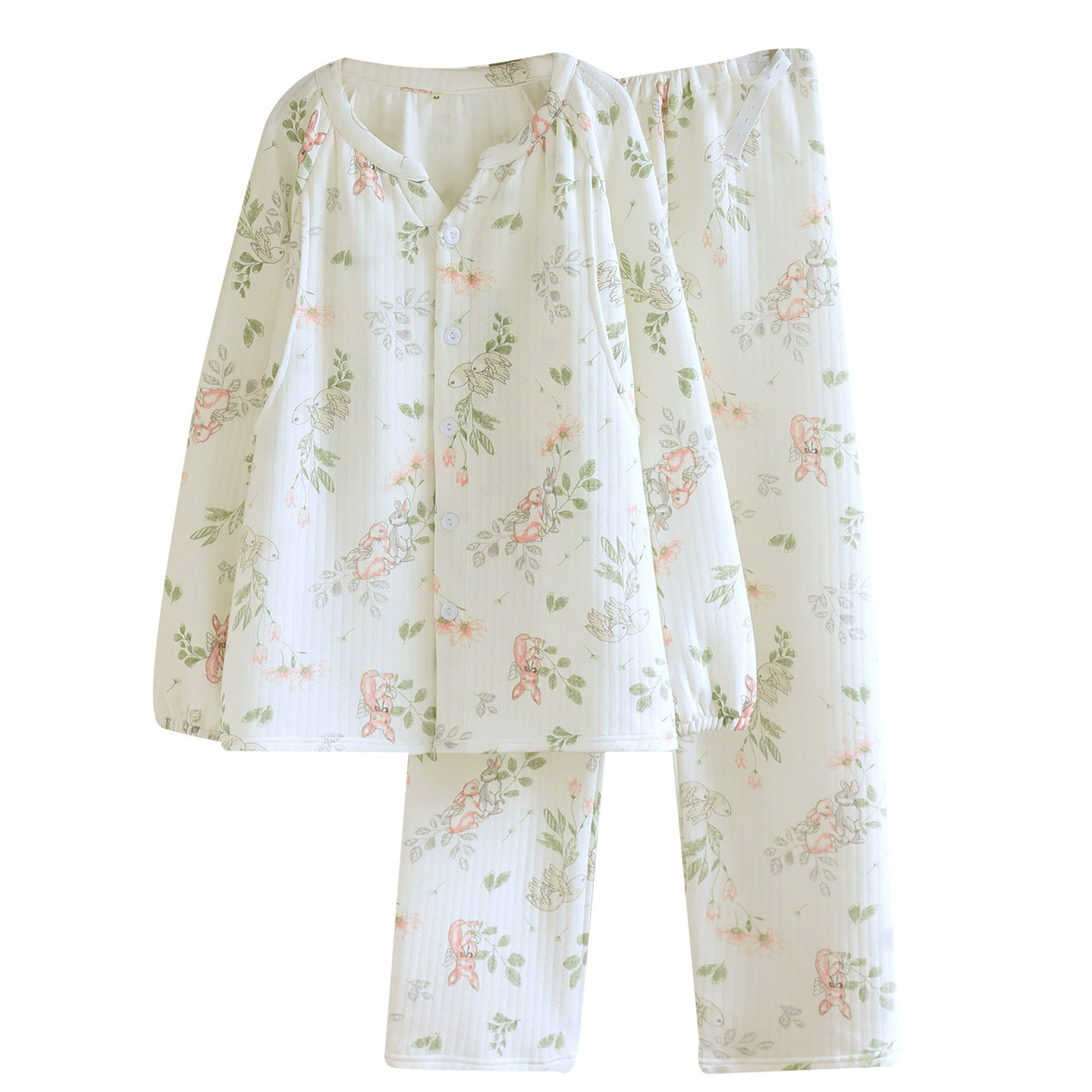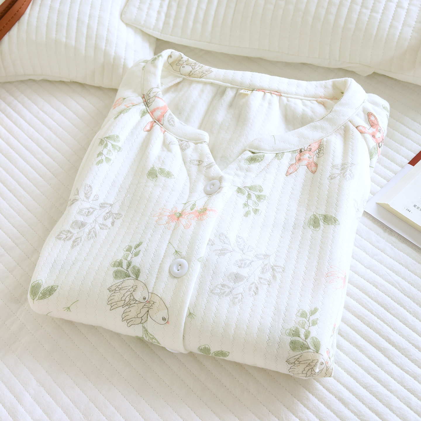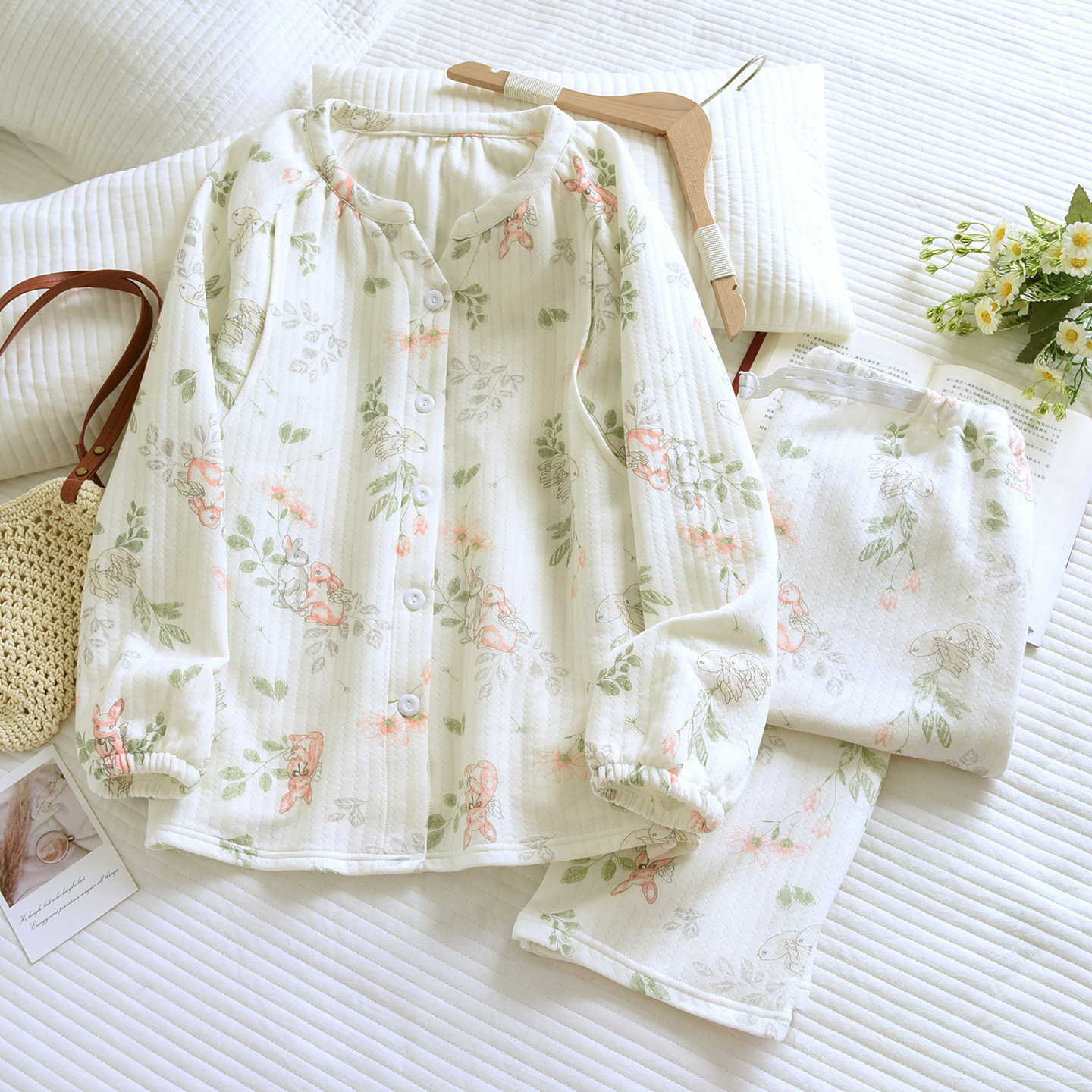 女士三层加厚珊瑚绒夹棉睡衣秋冬季 法兰牛奶绒保暖棉袄家居服套装